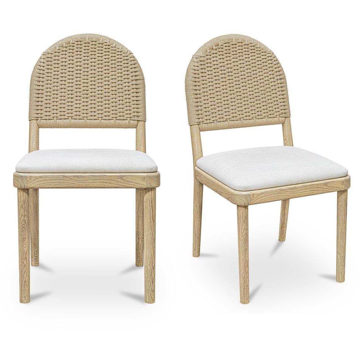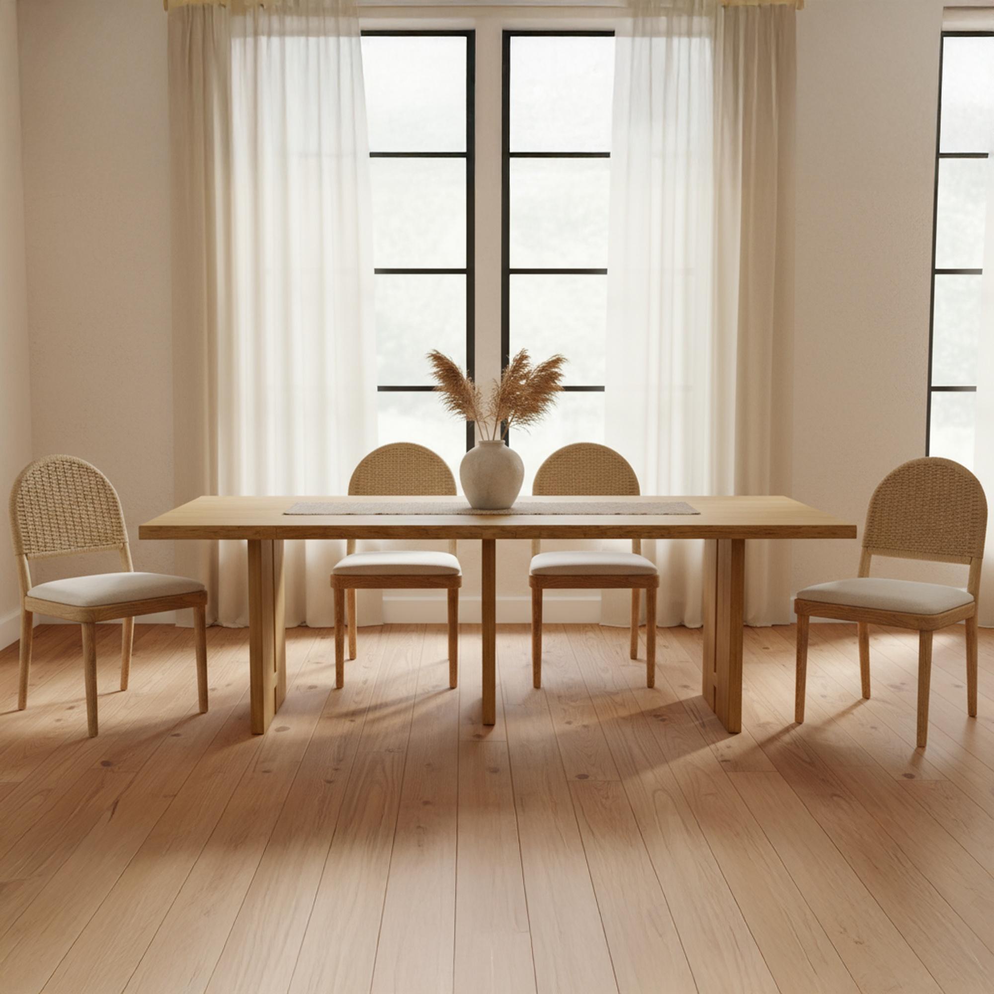 A chair that makes the table. The Claire Chair combines a solid oak frame with an arched paper cord back and a cushioned seat in soft beige upholstery. Rounded legs and corners refine the silhouette, while the handwoven texture adds artisanal warmth. Designed for everyday comfort and designed for timeless appeal.