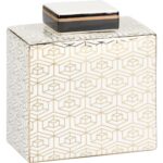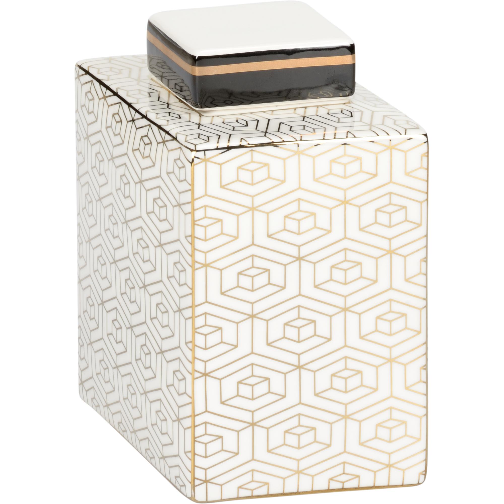 Clara canister provides function and beauty. The white glazed porcelain is the background for the eye catching metallic gold geometric pattern. The rectangular design adapts easily to many spaces and has a removable lid for storage of small items.