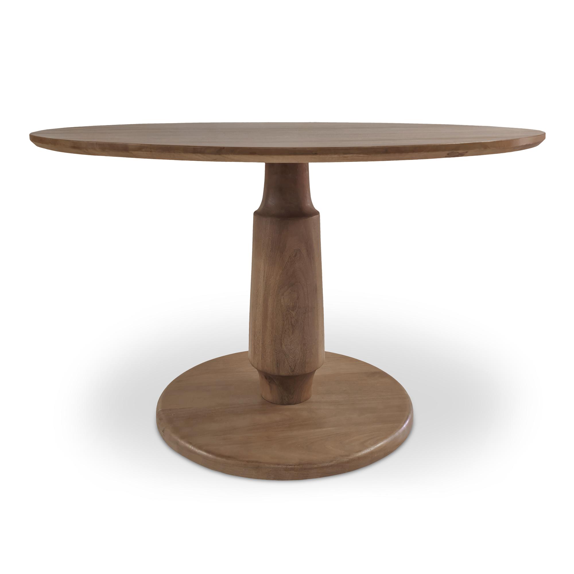 The Clark dining table marries a unifying round design with a refined beveled edge for seamless sophistication. Resting on a sturdy pedestal base with two captivating wooden indents at each of the two ends, the tapered form introduces depth and character to the dining space with impeccable craftsmanship and understated charm.