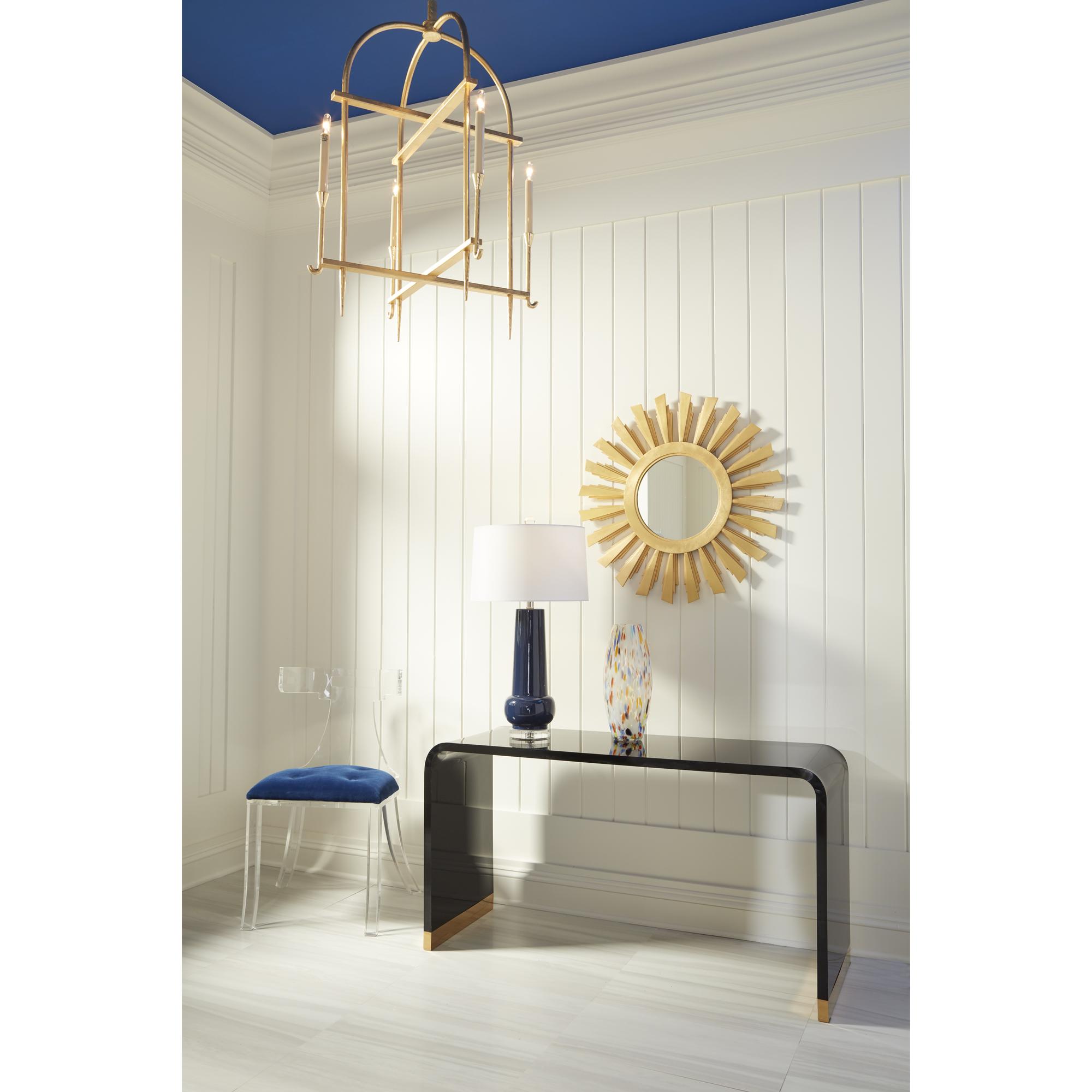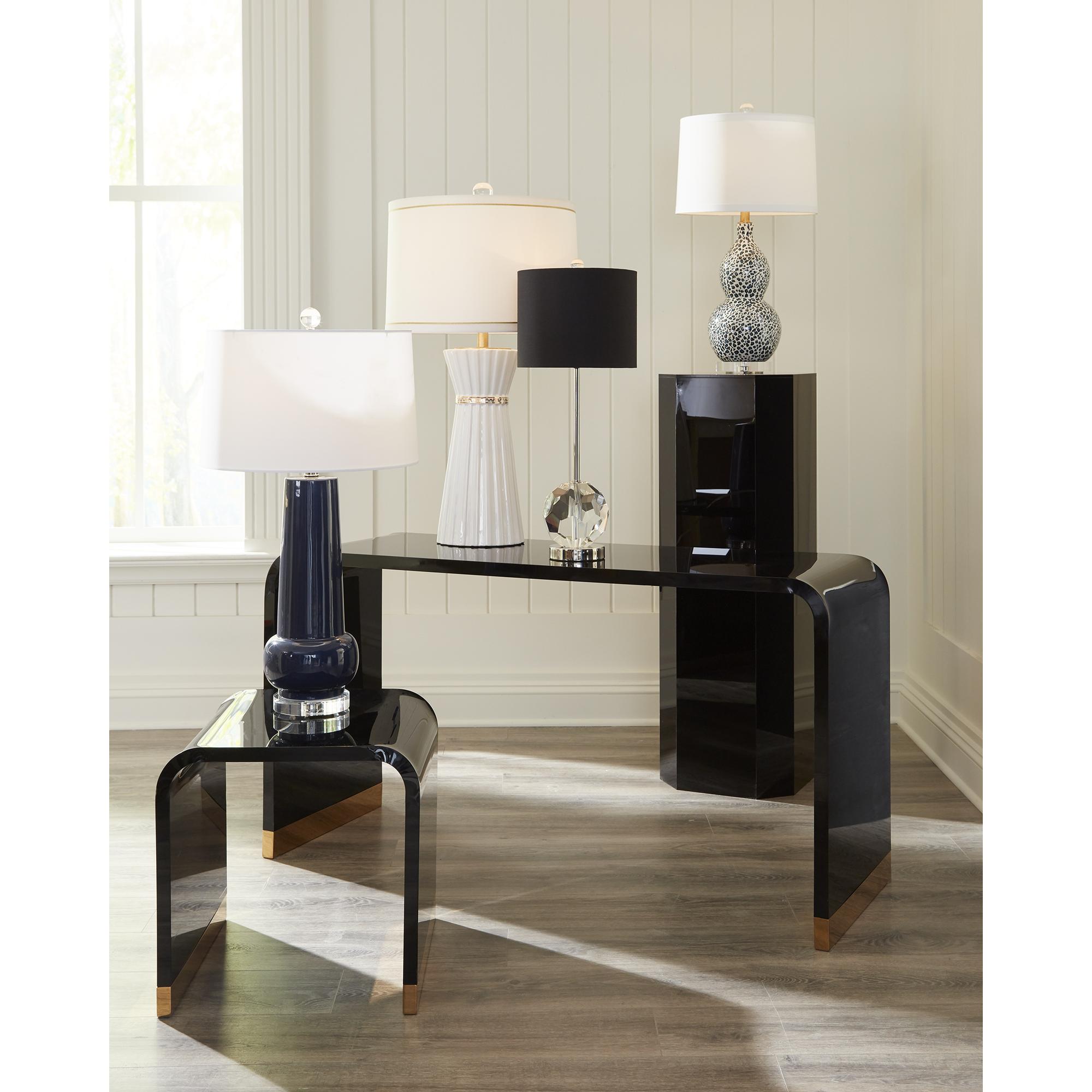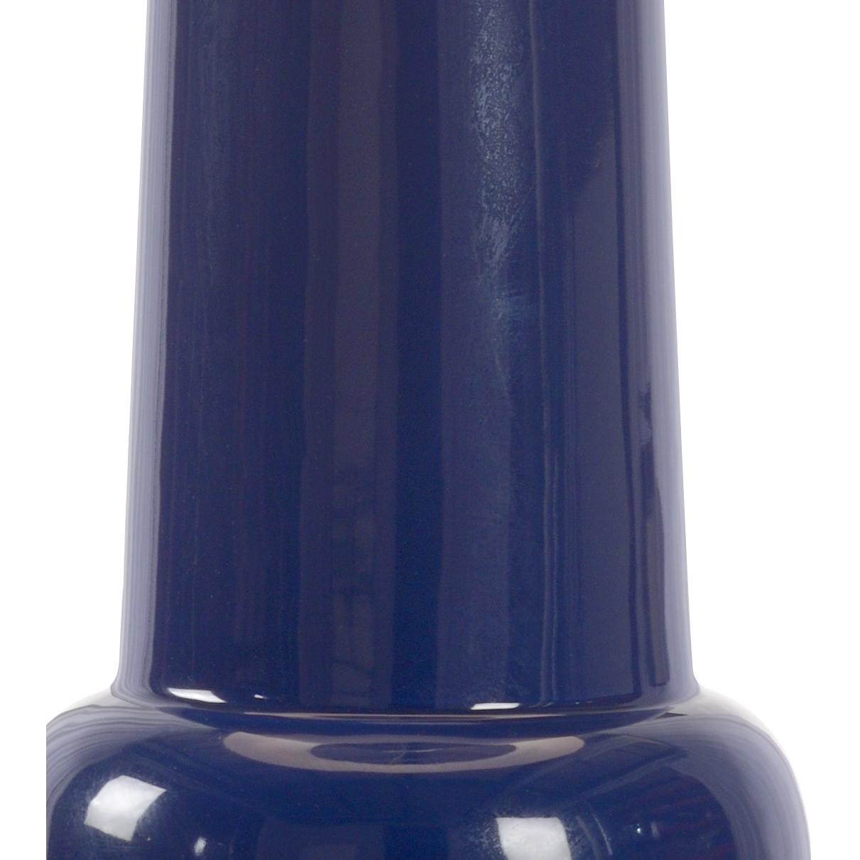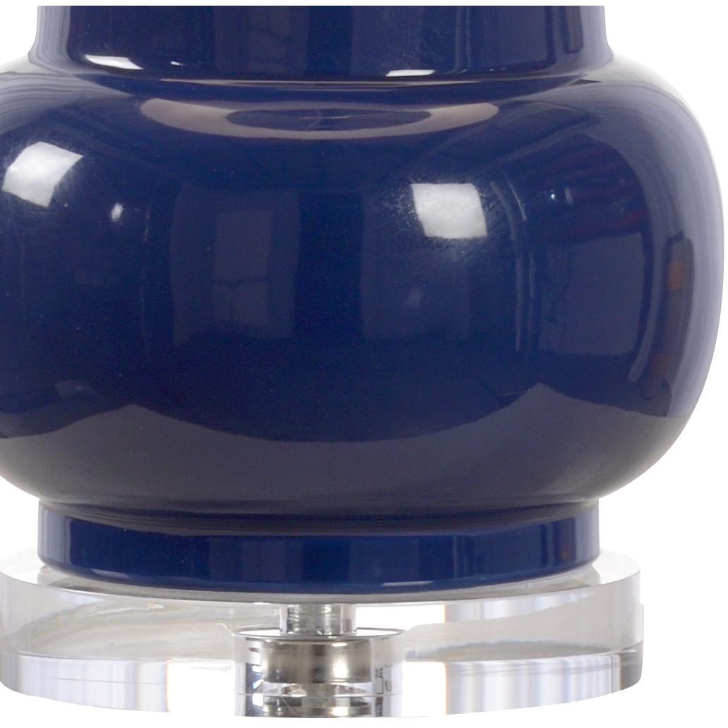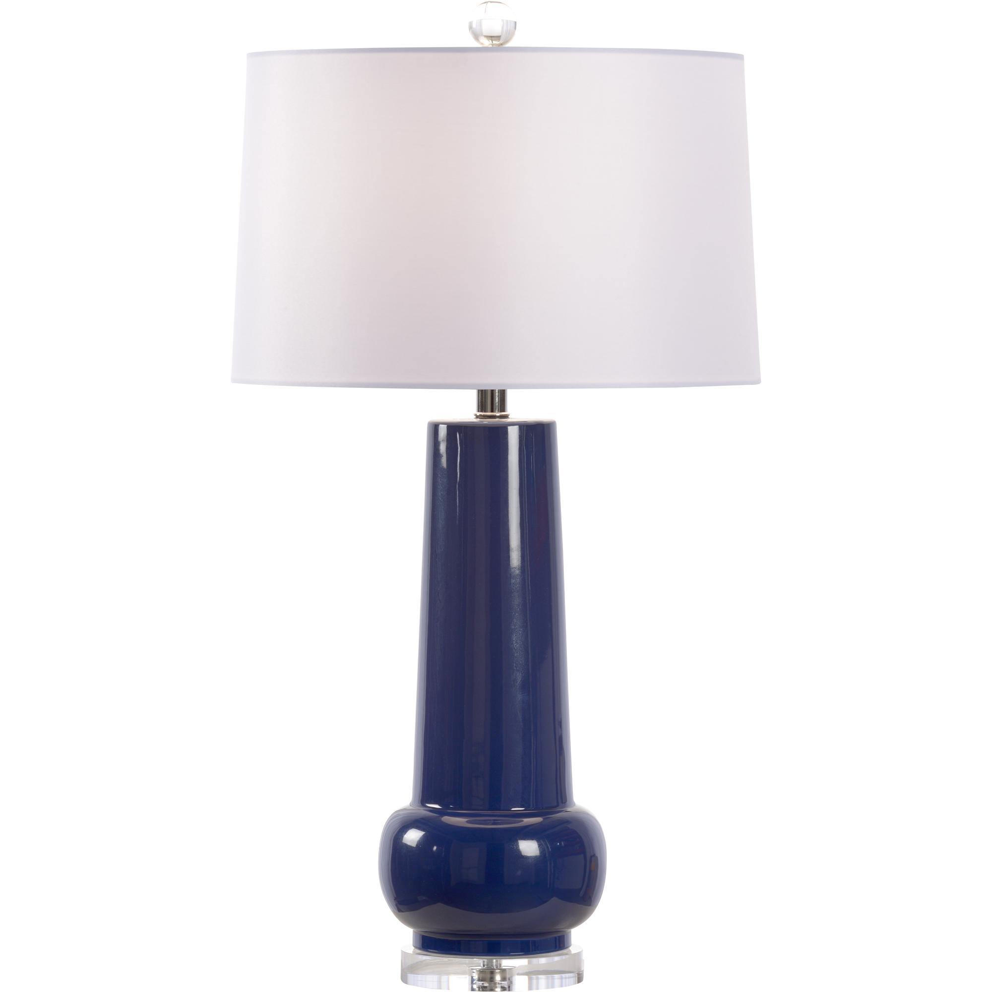 Featuring the 2020 color of the year, this sleek classic blue glazed ceramic base will complement your existing decor. A modern gourd shaped vase is topped with a crisp white silkette drum shade providing clean illumination. An acrylic mount and ball finial complete this transitional design.