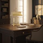 Vintage beauty comes to life in this classic desk lamp. Crafted of solid brass with an antique patina, this 19″ lamp features two lights, an adjustable key design, ivory candlesticks, and a base switch. Add this timeless accent lamp to your home office or reading area.