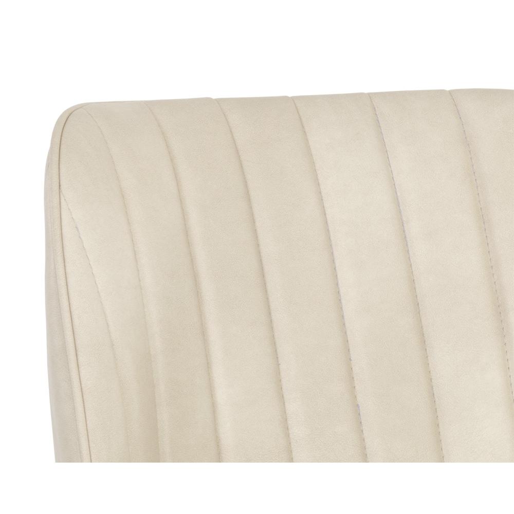 This industrial inspired dining chair is perfect for dining, lounge, office spaces and more. For a feminine touch, this design combines bravo cream faux leather with channel tufting and bronze iron legs. Beautiful from all angles. Handle With Care: This design has been crafted with faux leather. Faux leather is manufactured to reflect the natural characteristics of leather; as such, colour variations, markings, wrinkles, grooves, and light scratches are appreciated characteristics. No two pieces will be alike.