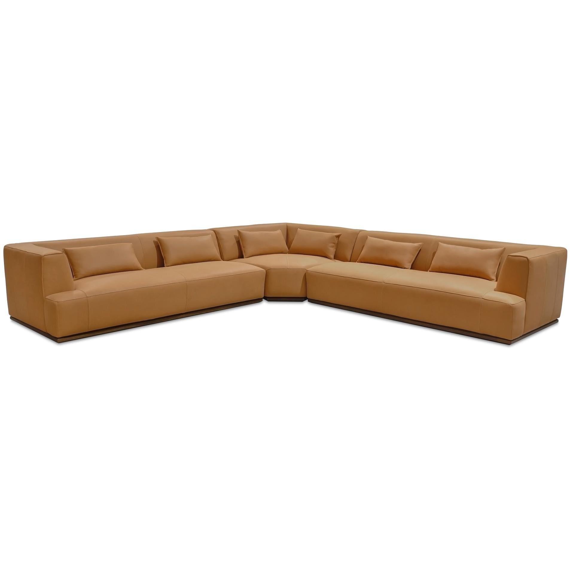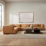 Serious room to sprawl. Clove doesn’t just fill a space—it defines it. With a deep, low-slung frame and oversized L-shape, it’s designed for maximum sprawl with minimalist intent. Wrapped in soft top-grain leather that patinas beautifully, it pairs tailored seam detailing with plush feather-fiber cushions and six toss pillows for extra comfort. The solid rubberwood base adds a grounded finish. Modern, warm, and unapologetically roomy—this one’s made for living large.