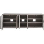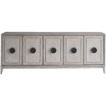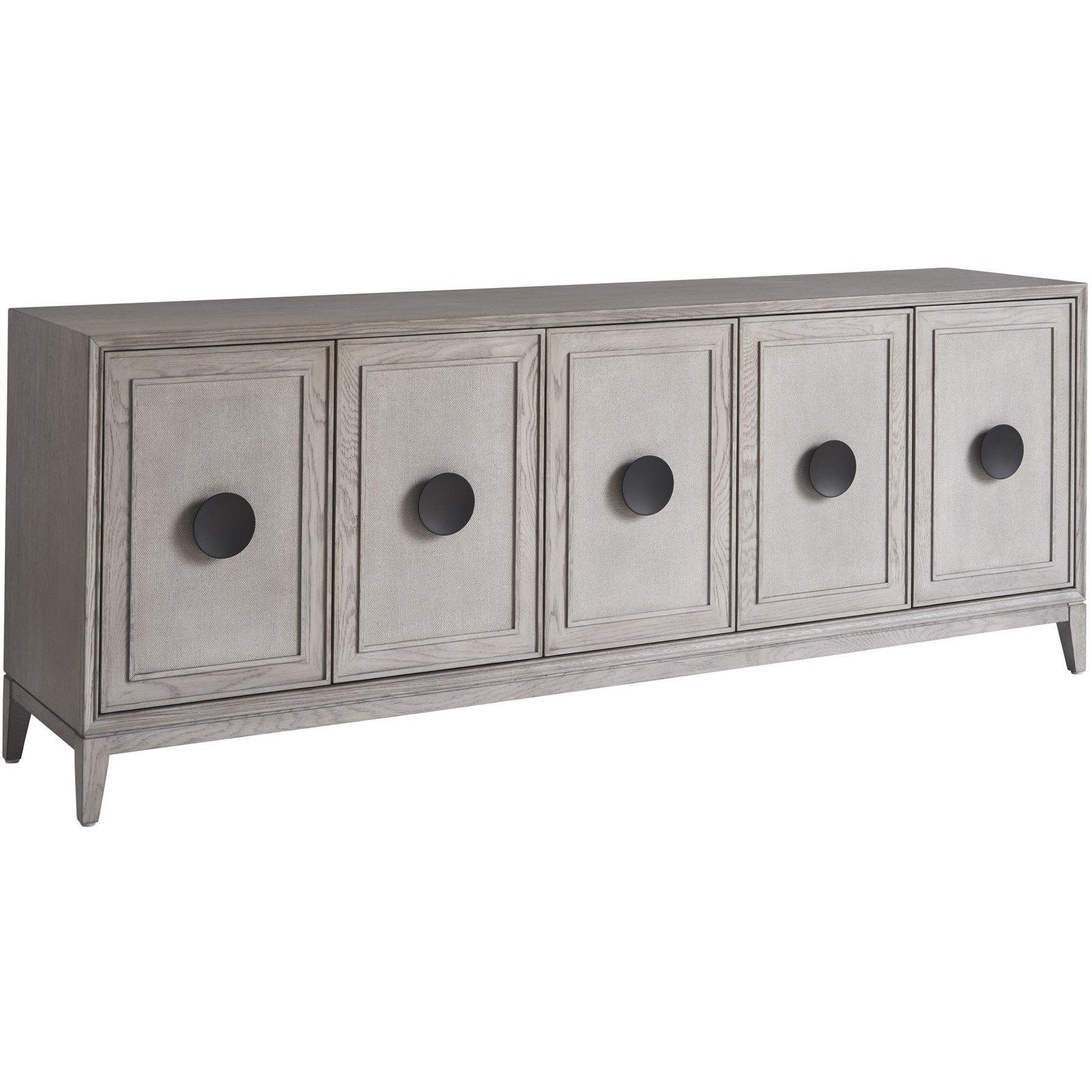 The Coalesce Entertainment Credenza is a confluence of style and utility, boasting generous interior storage complete with four adjustable shelves. Clad in a serene Rolling Fog finish and accented with faux linen texture doors, the piece is defined by circular, slightly oversized metal pulls that lend a trendy, dynamic flourish to this sophisticated organizer.