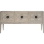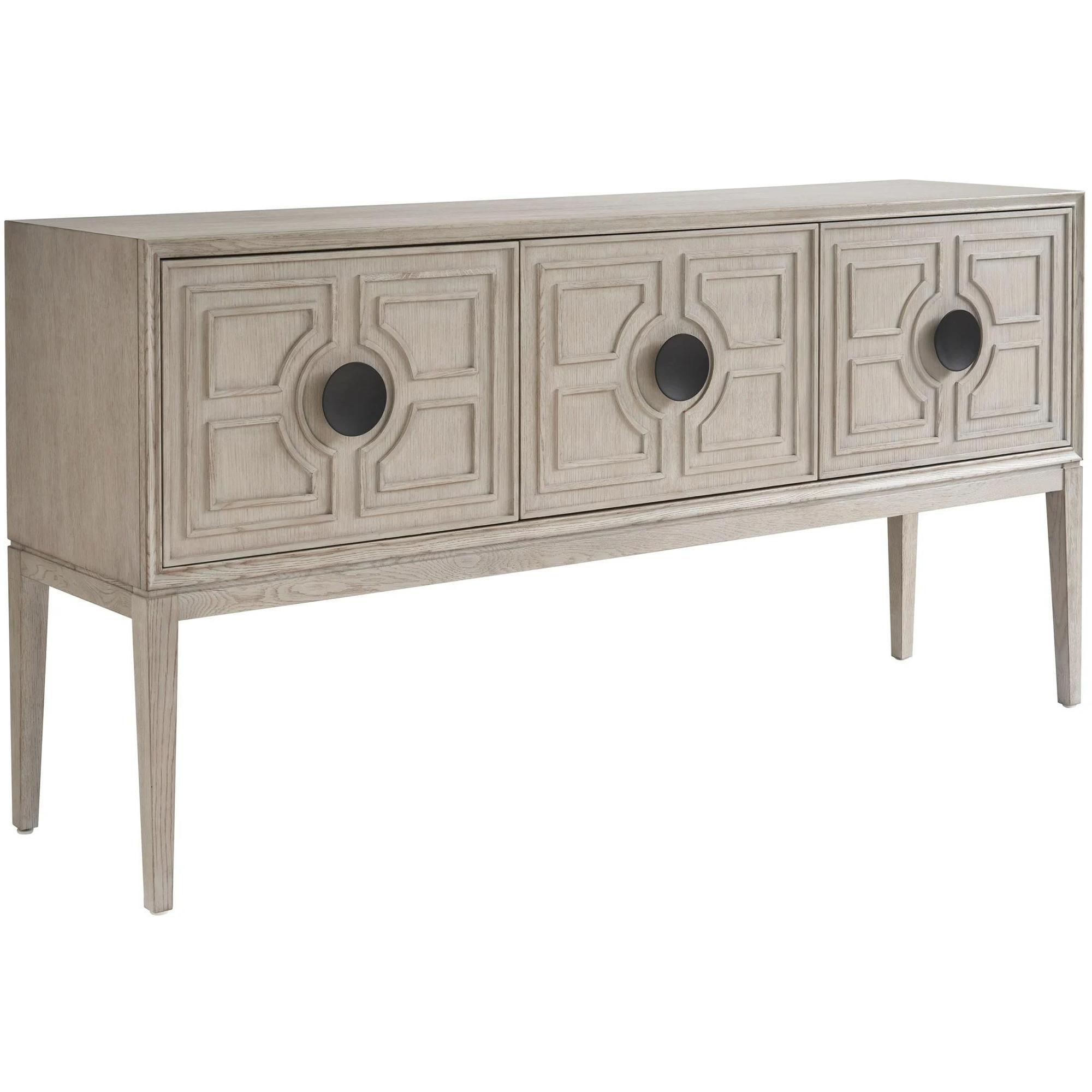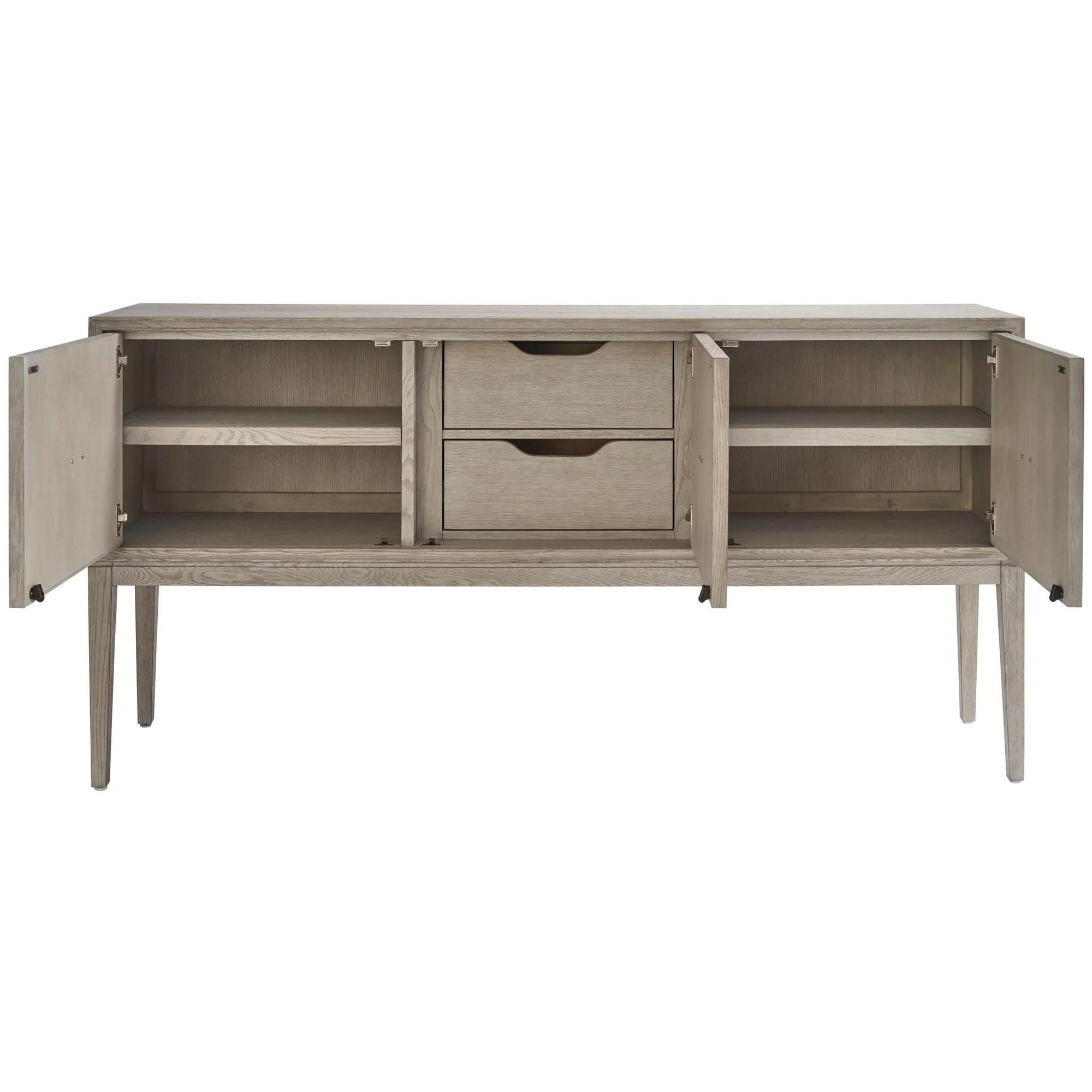 The Madden Sideboard, presented in the tranquil Rolling Fog finish, is a masterclass in craftsmanship, its exterior adorned with meticulous carvings inspired by geometric precision and clean lines, making it an exquisite storage solution that commands attention.