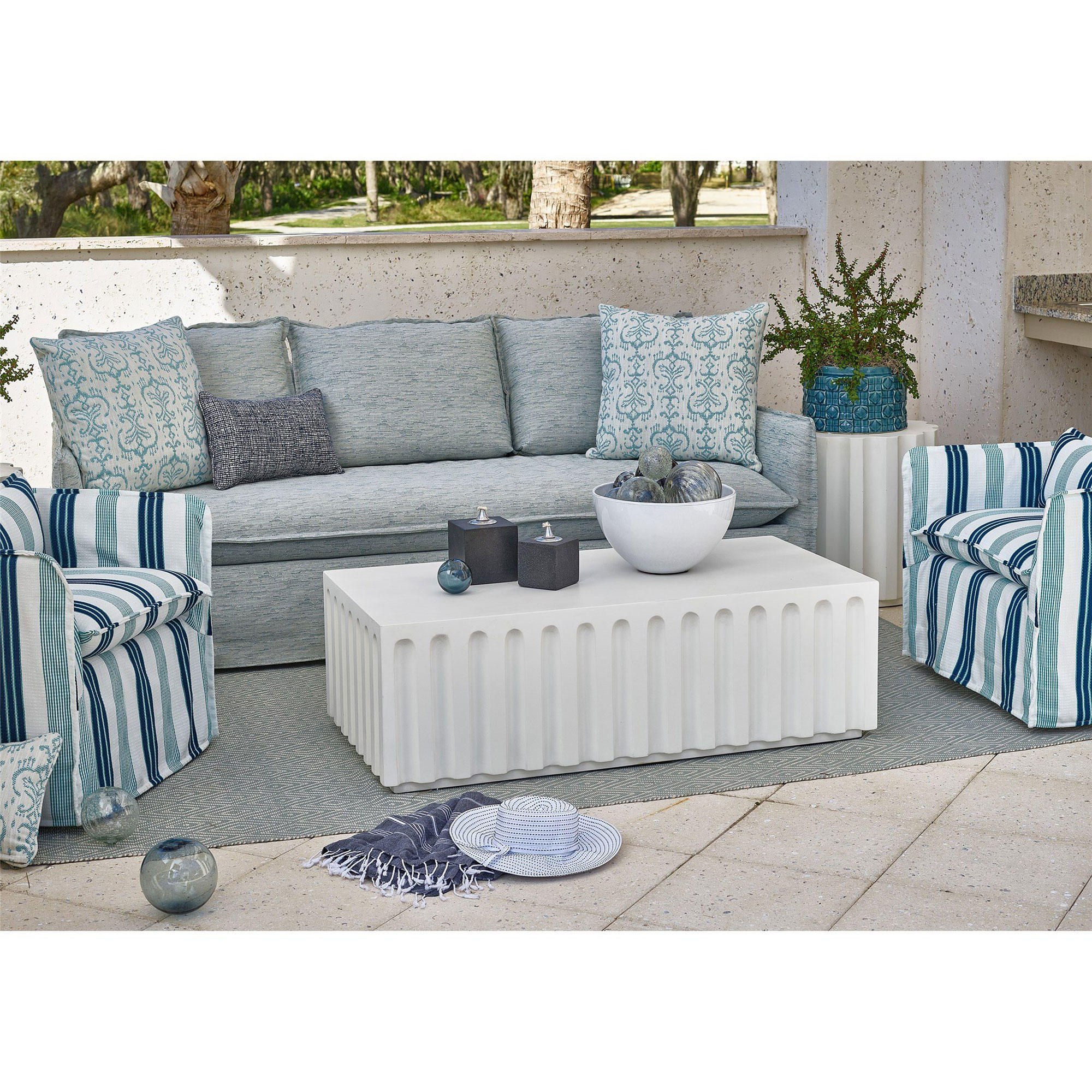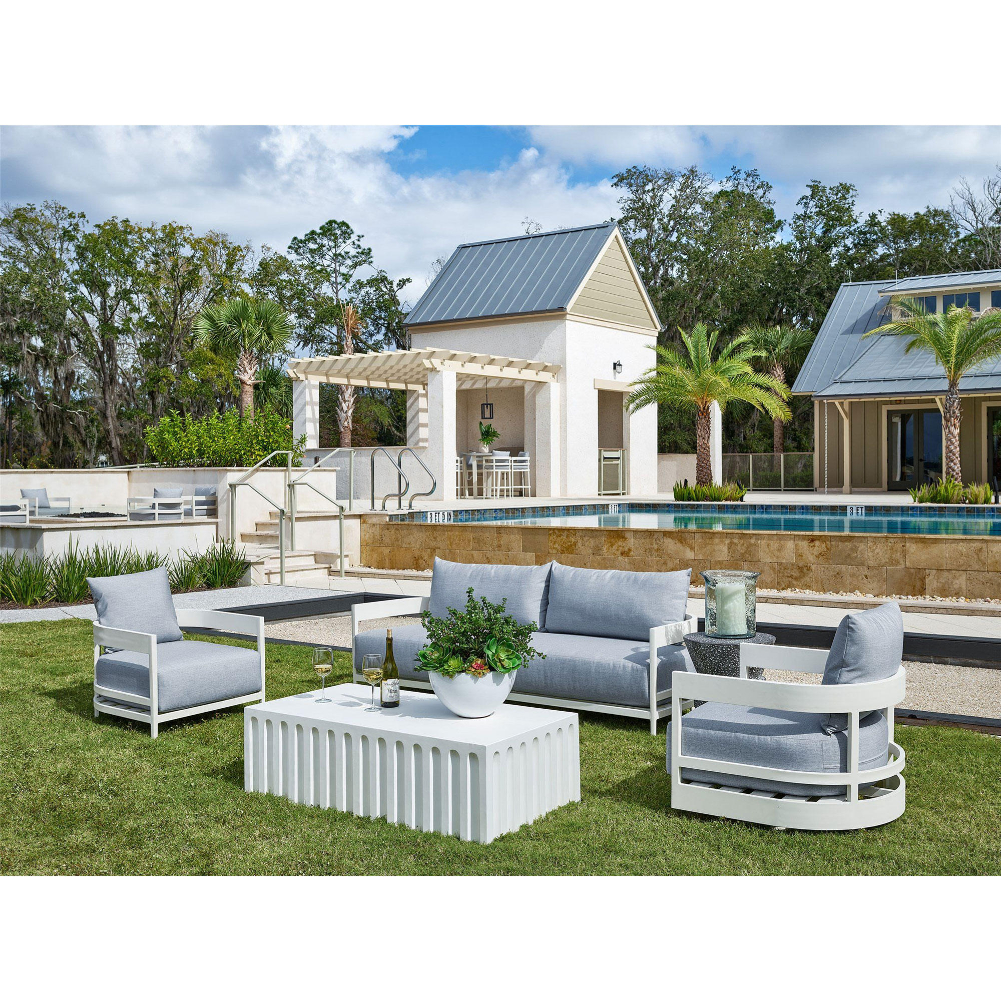 Showcasing contemporary lines and a bright white hue, the Edisto Cocktail Table adds playful panache to outdoor spaces.
