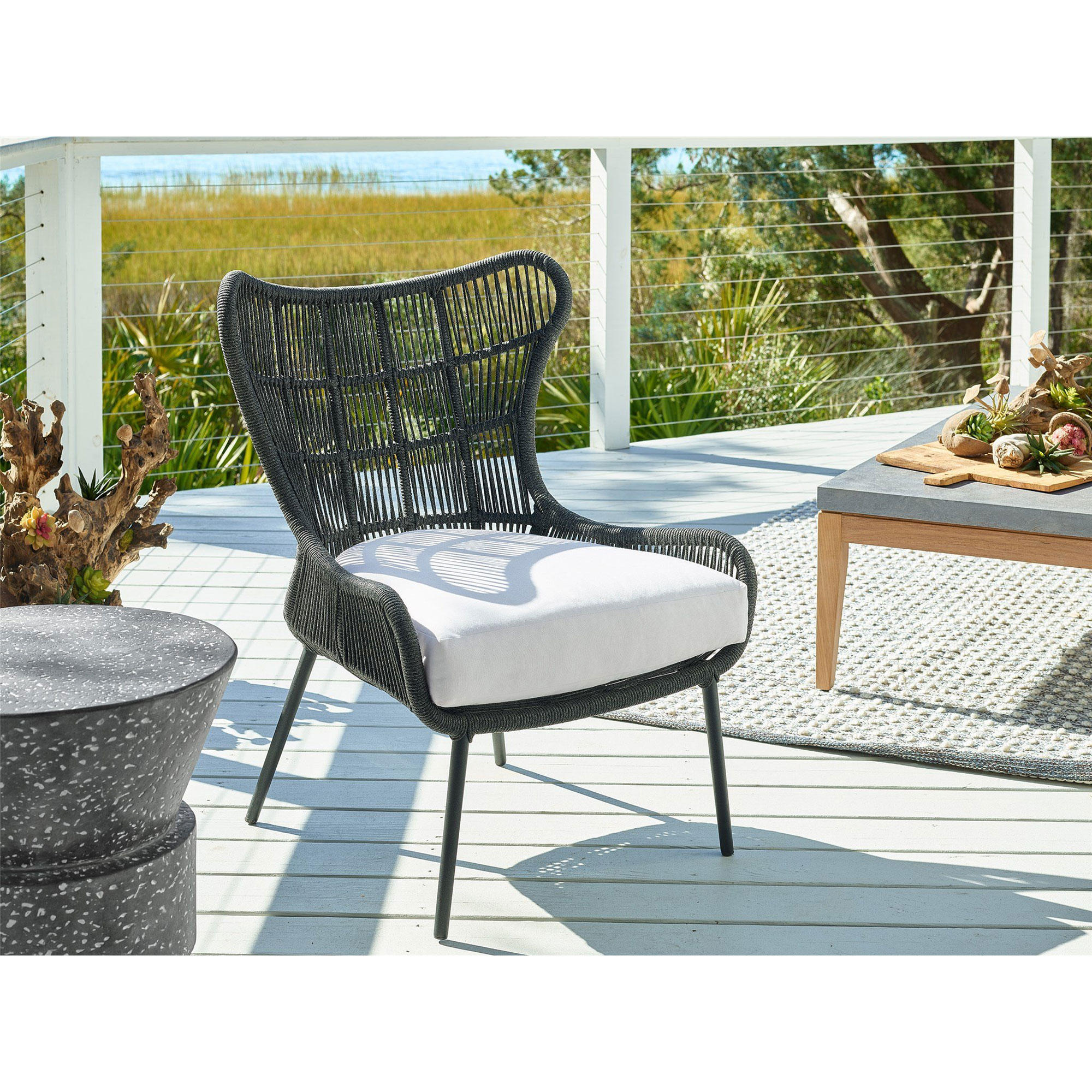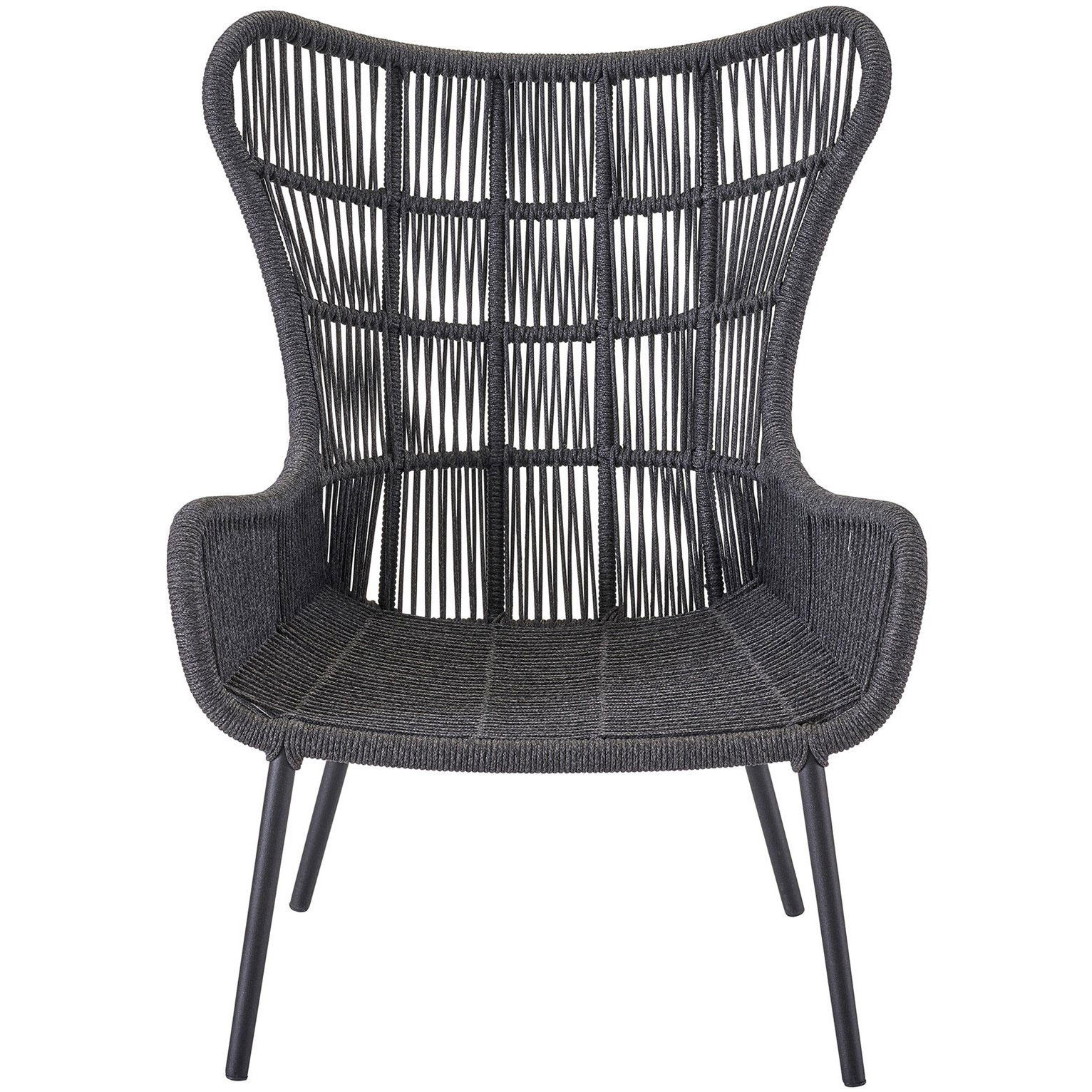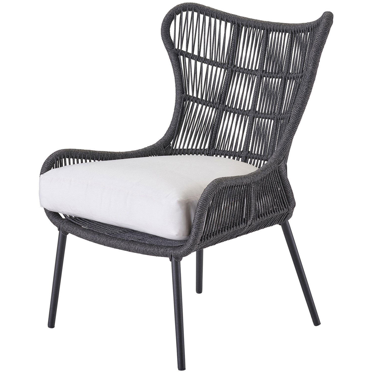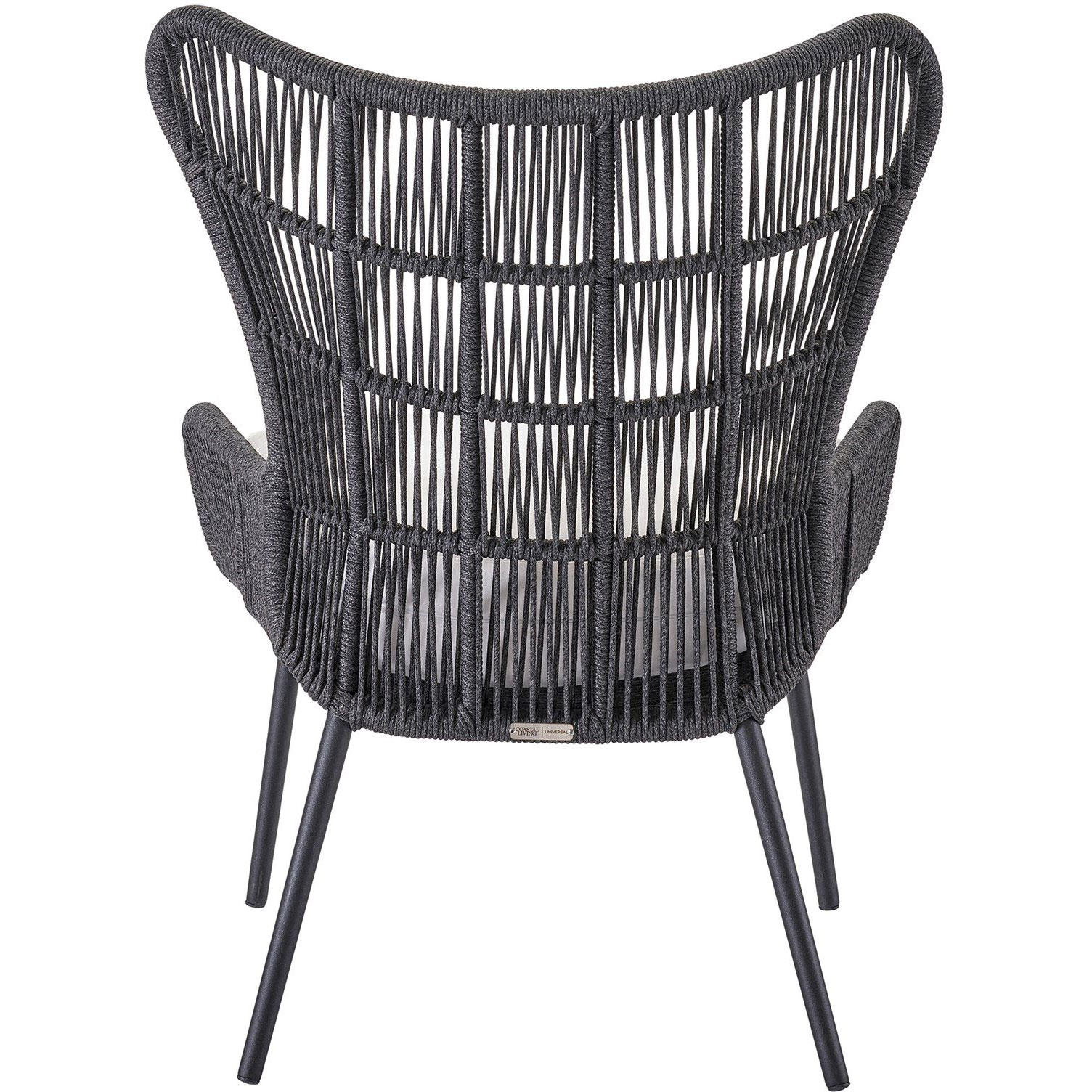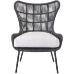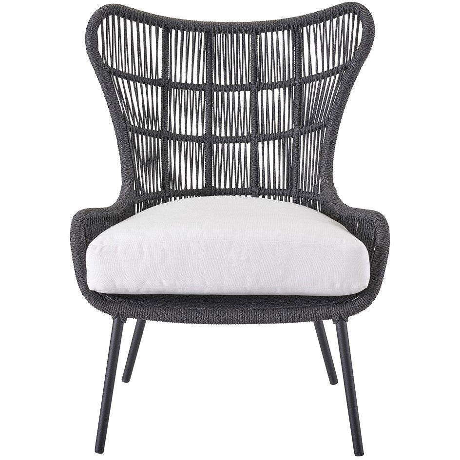 The shapely Hatteras Lounge Chair features a wingback-inspired frame wrapped in dark gray woven rope, creating a welcoming accent piece to suit a variety of design styles.