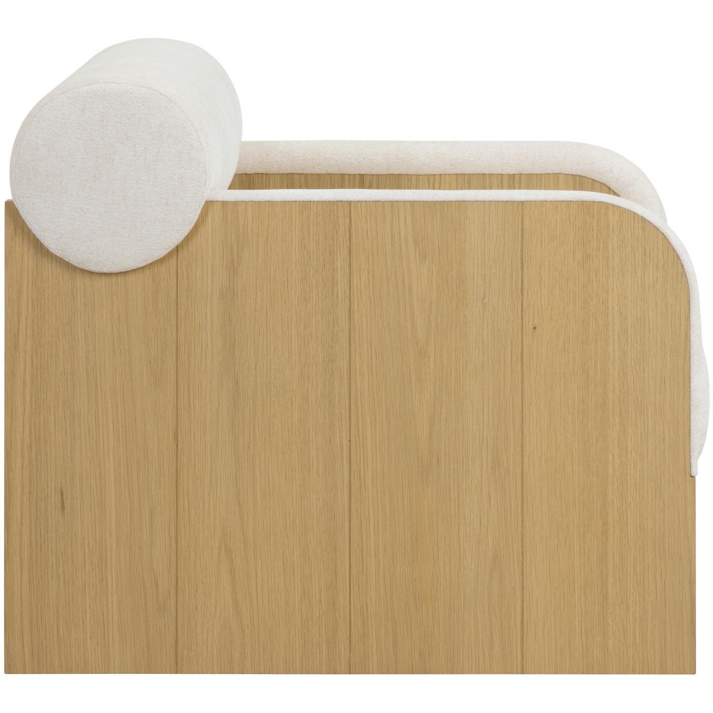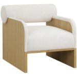 The Coburn Lounge Chair is a fresh take on contemporary comfort. A bolster back and deep seat upholstered in our soft eclipse white fabric make this piece an inviting addition to any space. Matching fabric trim on the rounded arms adds extra charm to the overall look. Completed with a rustic oak wood veneer legs carefully selected for its distinctive wood graining.