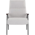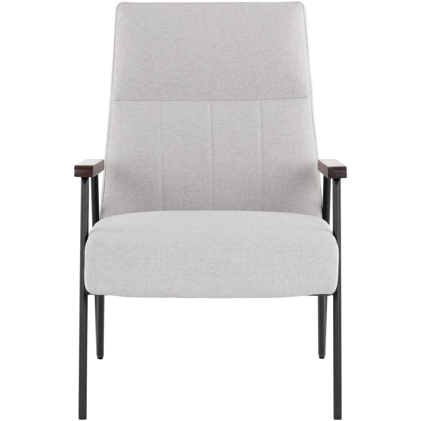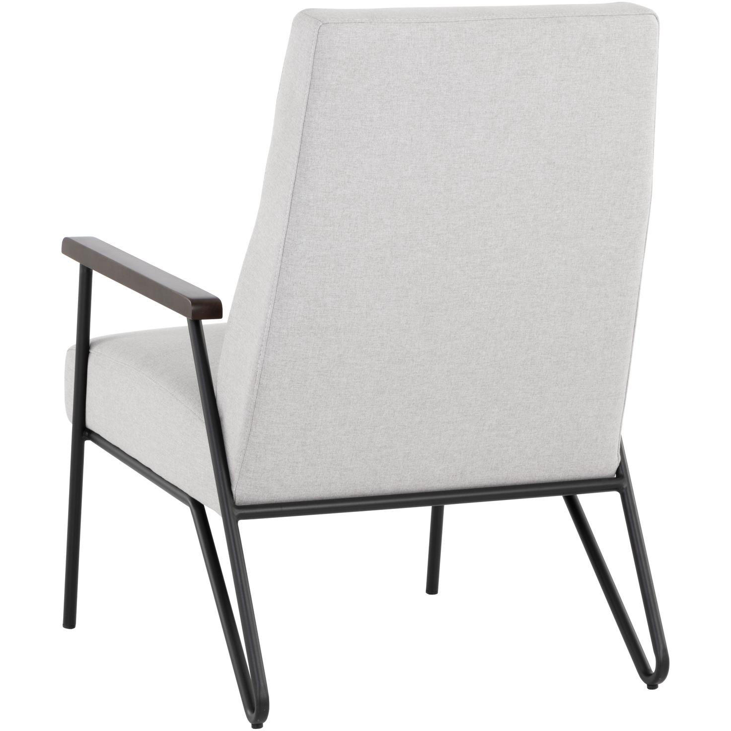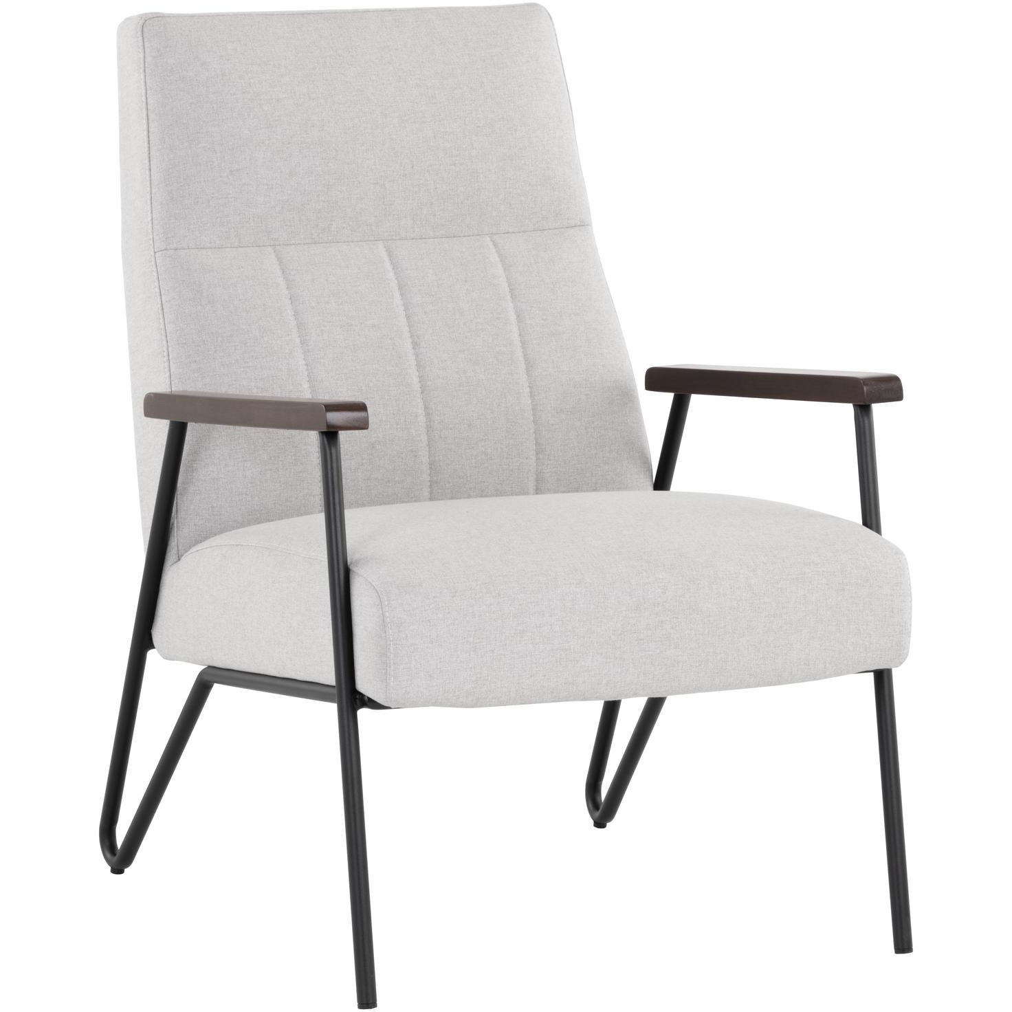 Inspired by mid-century modern design, this lounge chair is full of comfort and style. Upholstered in light grey fabric with vertical tufting on the seat interior. Completed with a black powder coated steel base. Also available in bounce nut and stone faux leathers.