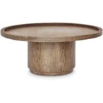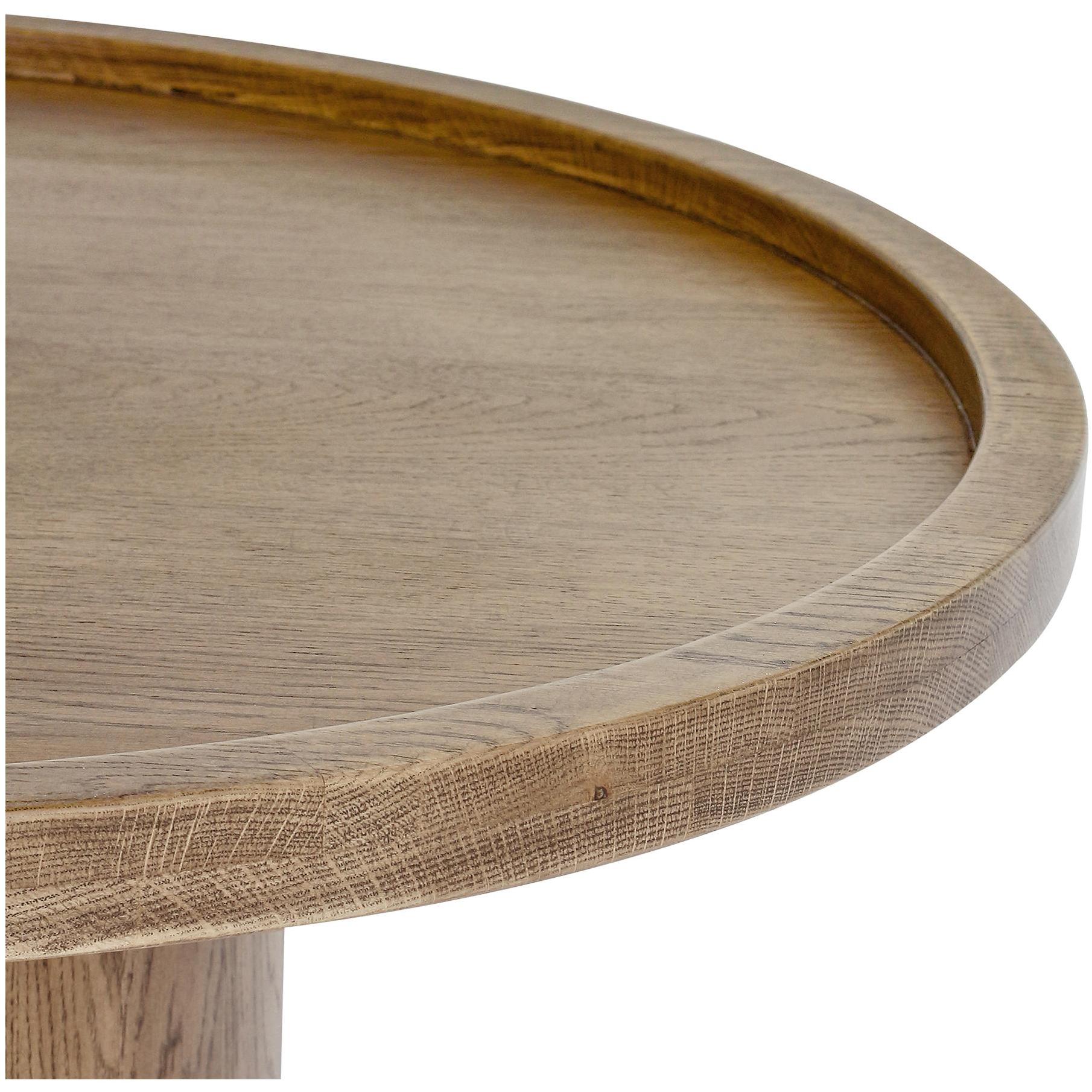The Cohen coffee table in solid oak features an innovative tray-style top and cylindrical pedestal base. A rich brown finish accentuates the wood’s natural beauty, while a recessed bottom imparts airy lightness, bridging contemporary and traditional with understated elegance.