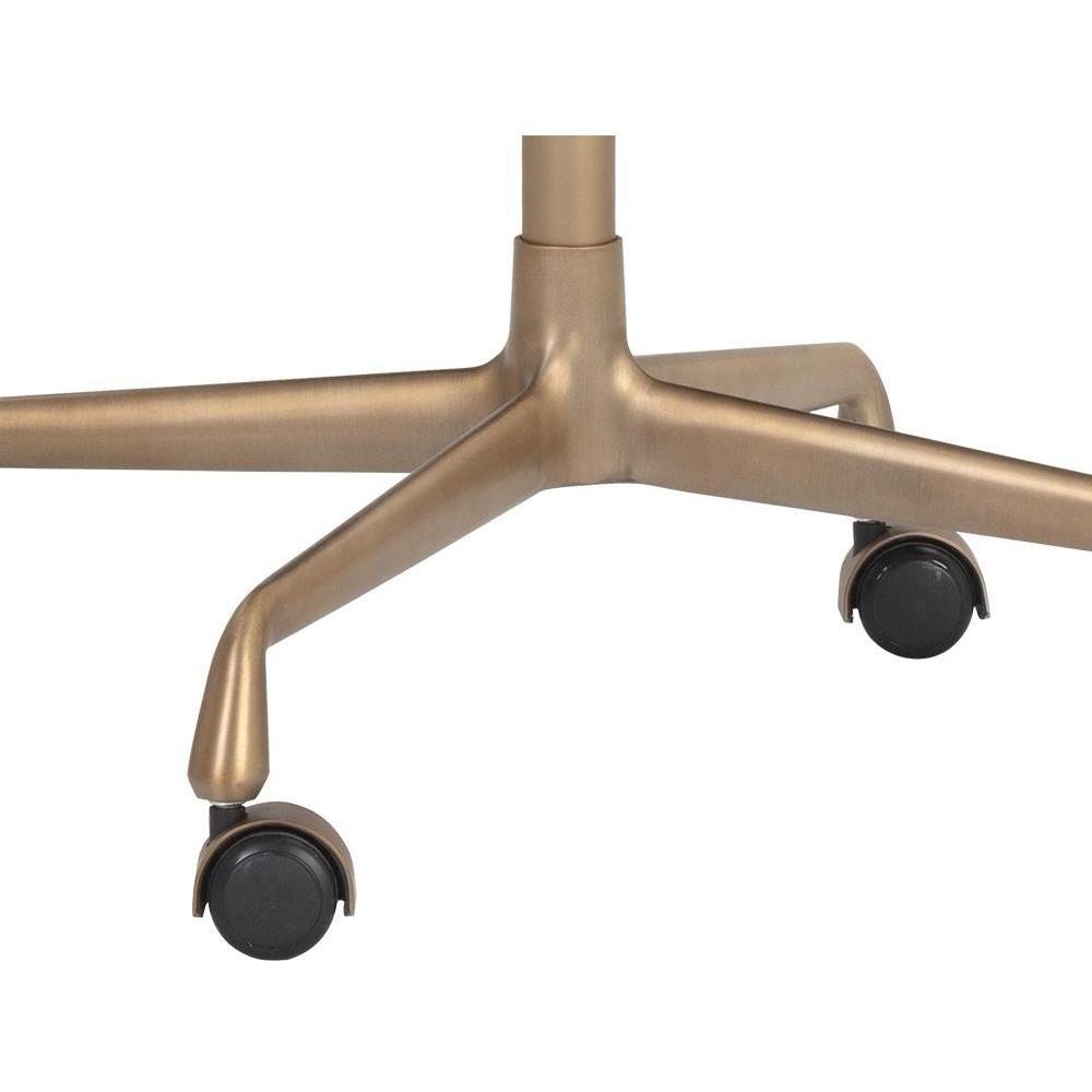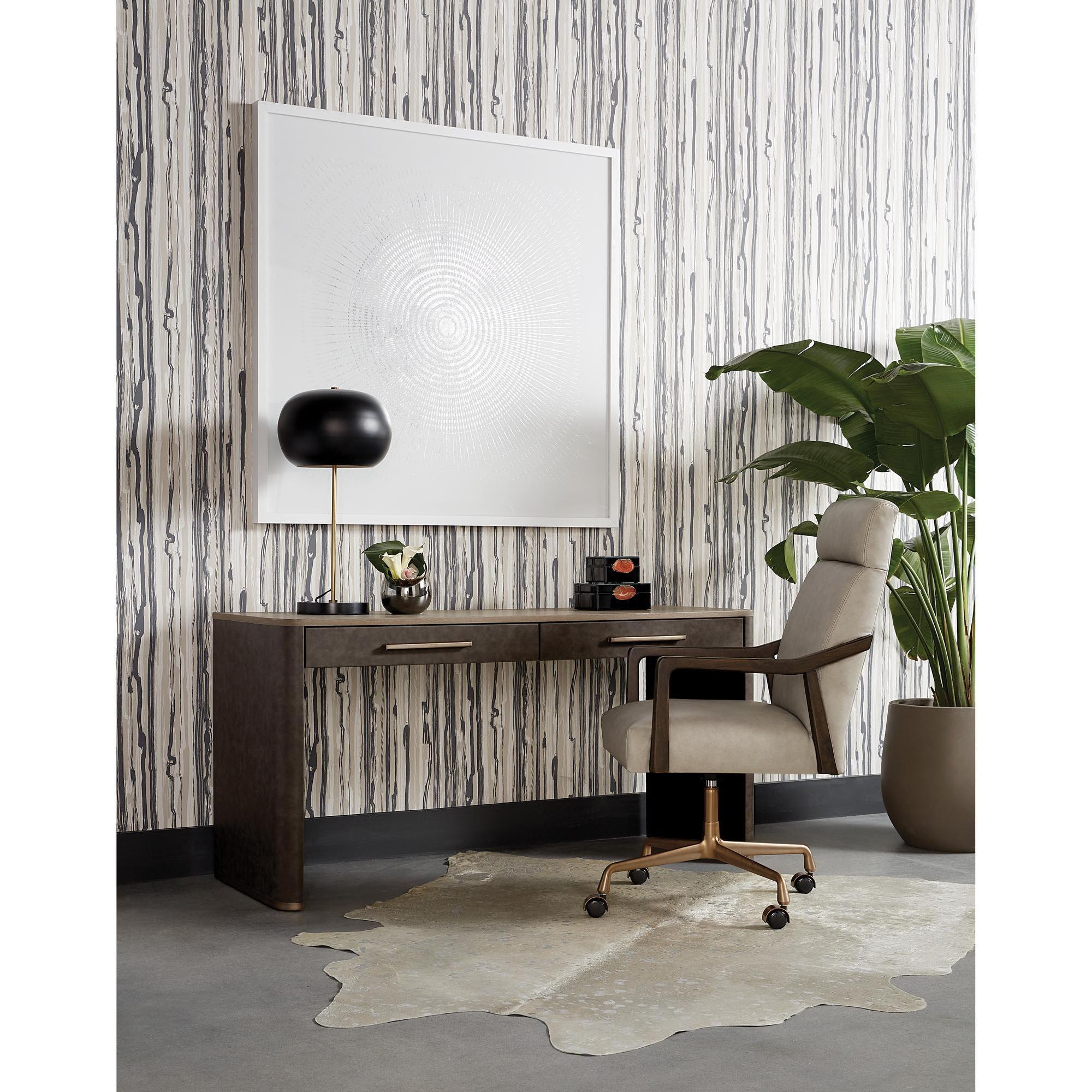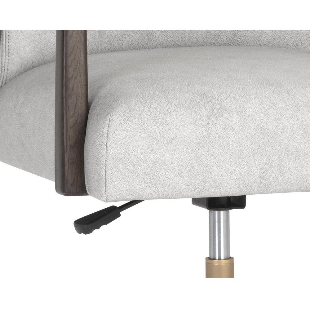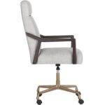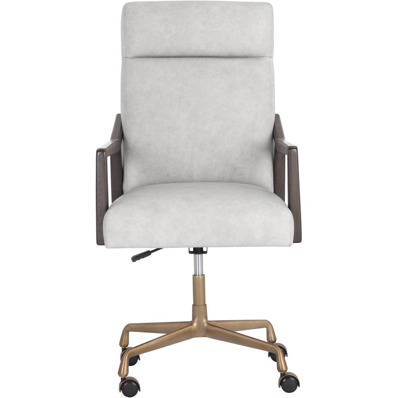 Create a distinguished workspace with the handsome Collin office chair. The exposed oak wood arms and brushed gold base offers an airy element while paired with saloon light grey leather. Handle with Care: This design has been crafted with 100% top grain leather. Leather is a natural material; as such, colour variations, markings, wrinkles, grooves and light scratches are acceptable and appreciated characteristics. No two pieces are alike. Visit our Product Care page for more information on how to ensure the lasting beauty of this piece. As wood is an organic, porous material, these pieces will contain natural variation of texture and may also exhibit fine indentations and cracks. Wood pieces will also display a disparity of colour and grain, and visible knots and burls that add to the character of each piece.