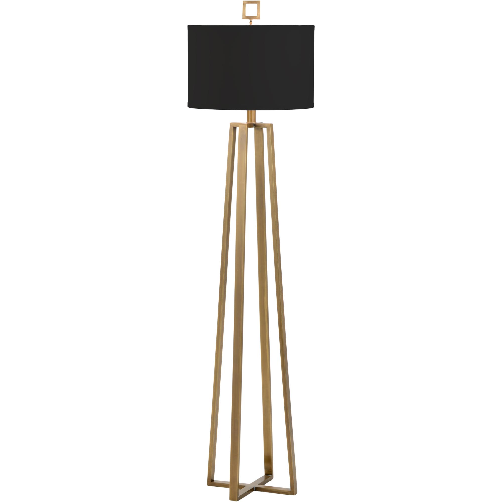 Illuminate your modern or contemporary decor with Colson floor lamp. This 56″ lamp has an open geometric base with a warm antique brass finish. Capped off with a black drum shade and square finial, this floor lamp is ideal beside your favorite chair or in dim corners throughout your home.