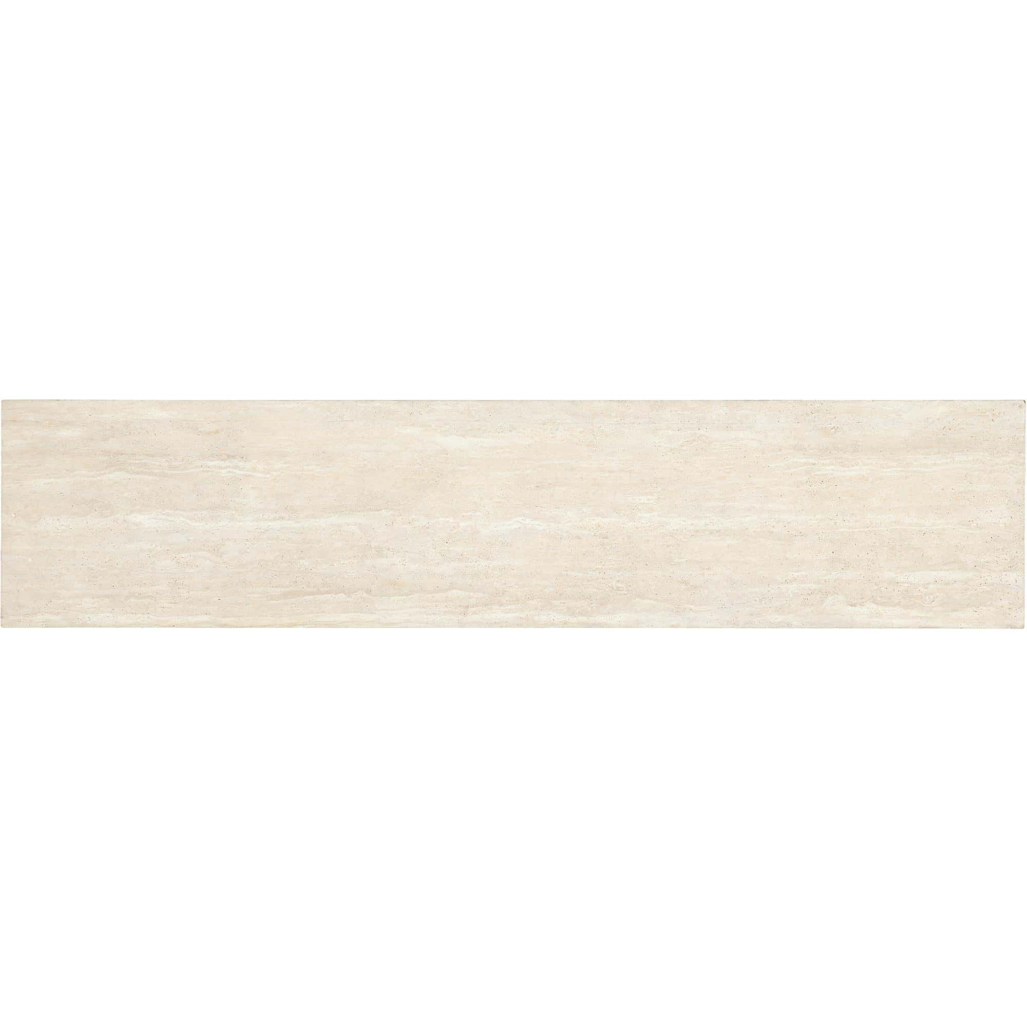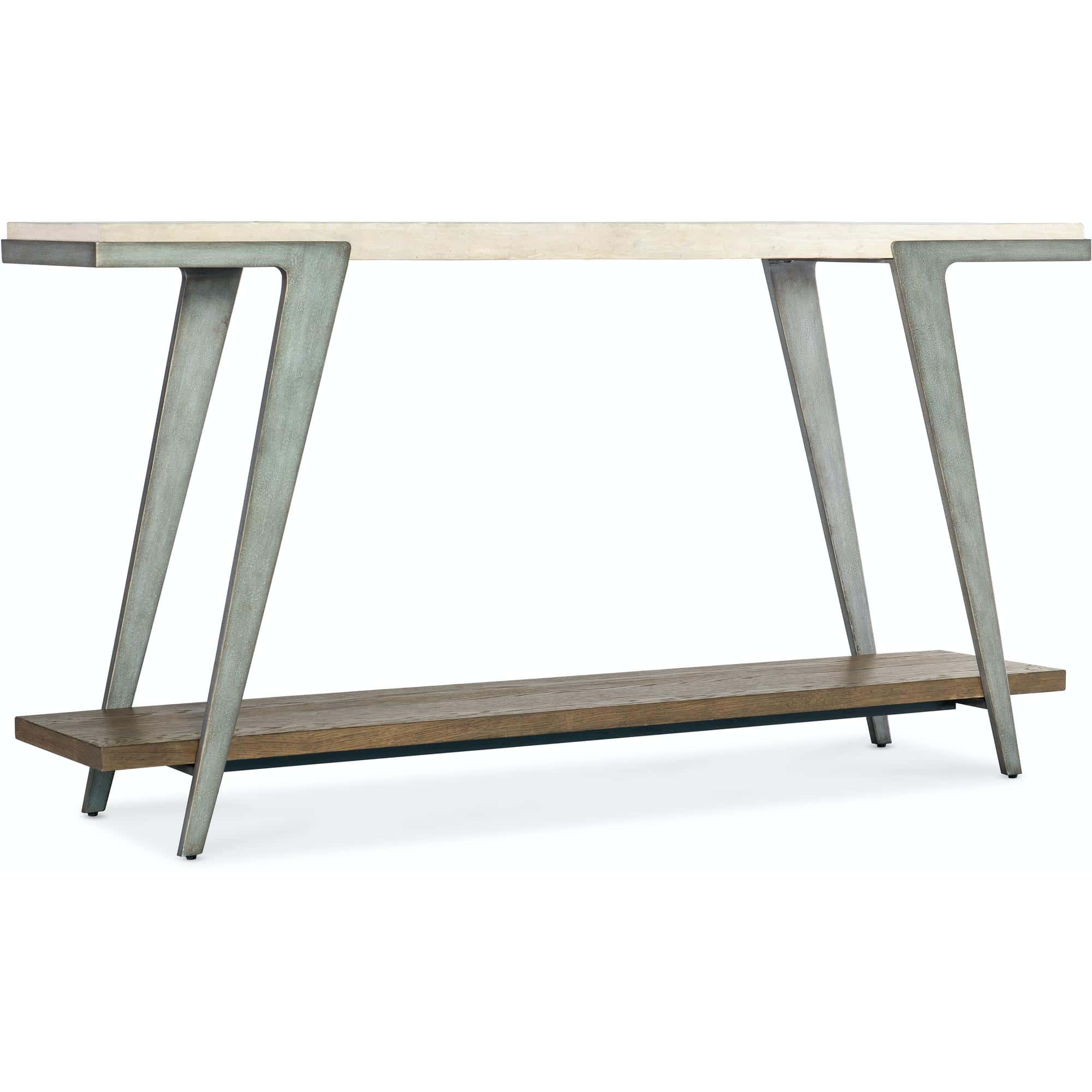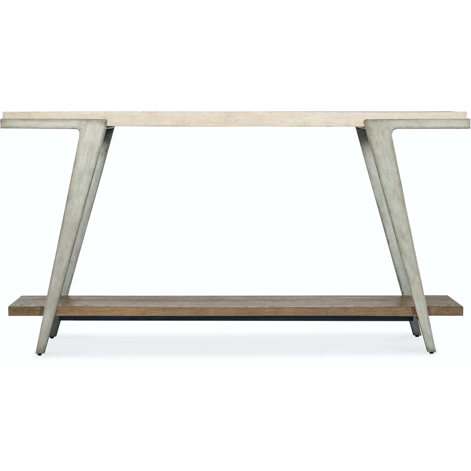 - Finish: Cream colored travertine marble top with natural medium wood finish on shelf and gray metal frame