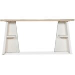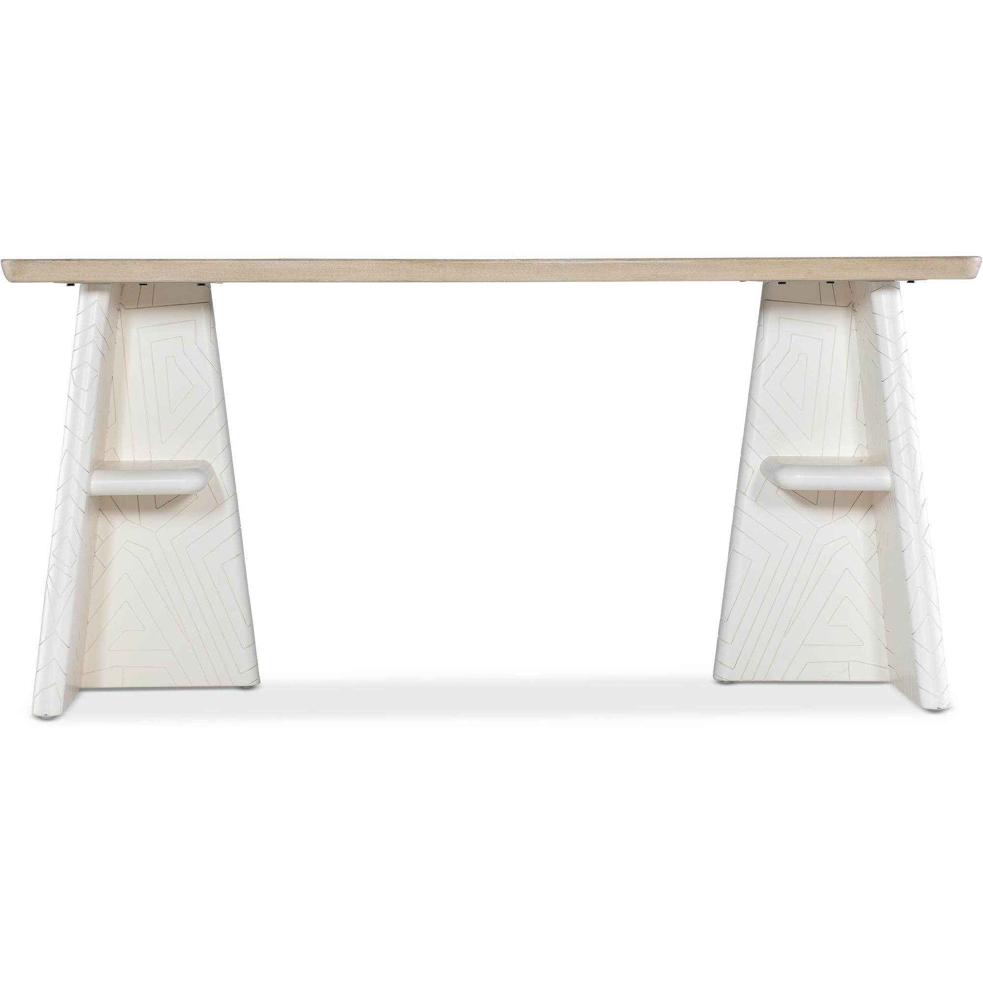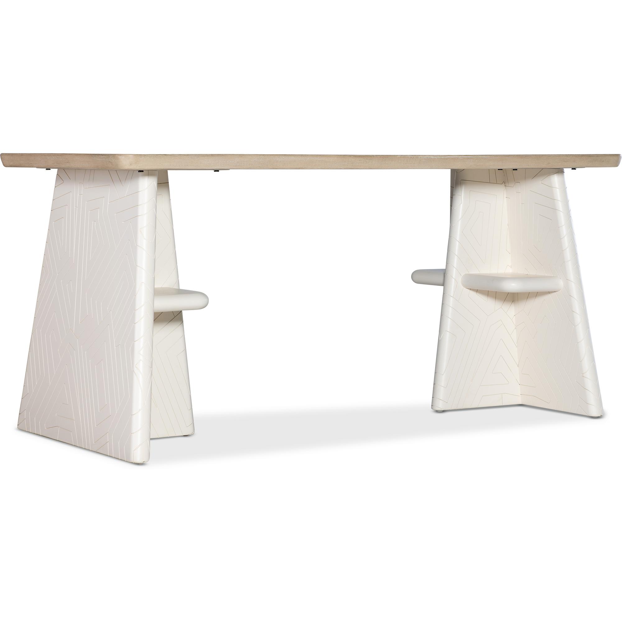 Two-tone finish with creamy white base with geometric design and contrasting light elm finish on top