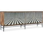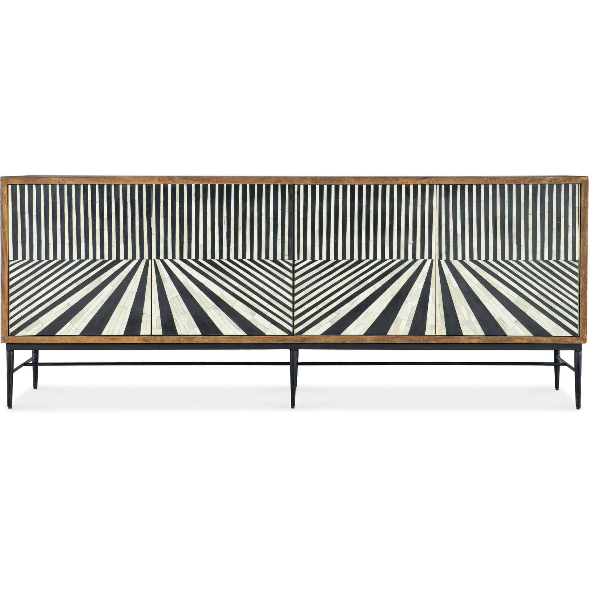 Finish: Natural medium wood finish with black and white bone inlay on door fronts. Black metal base. Transparent finishes reveal a higher degree of color and grain variances, creating an irresistible one-of-a-kind silhouette.