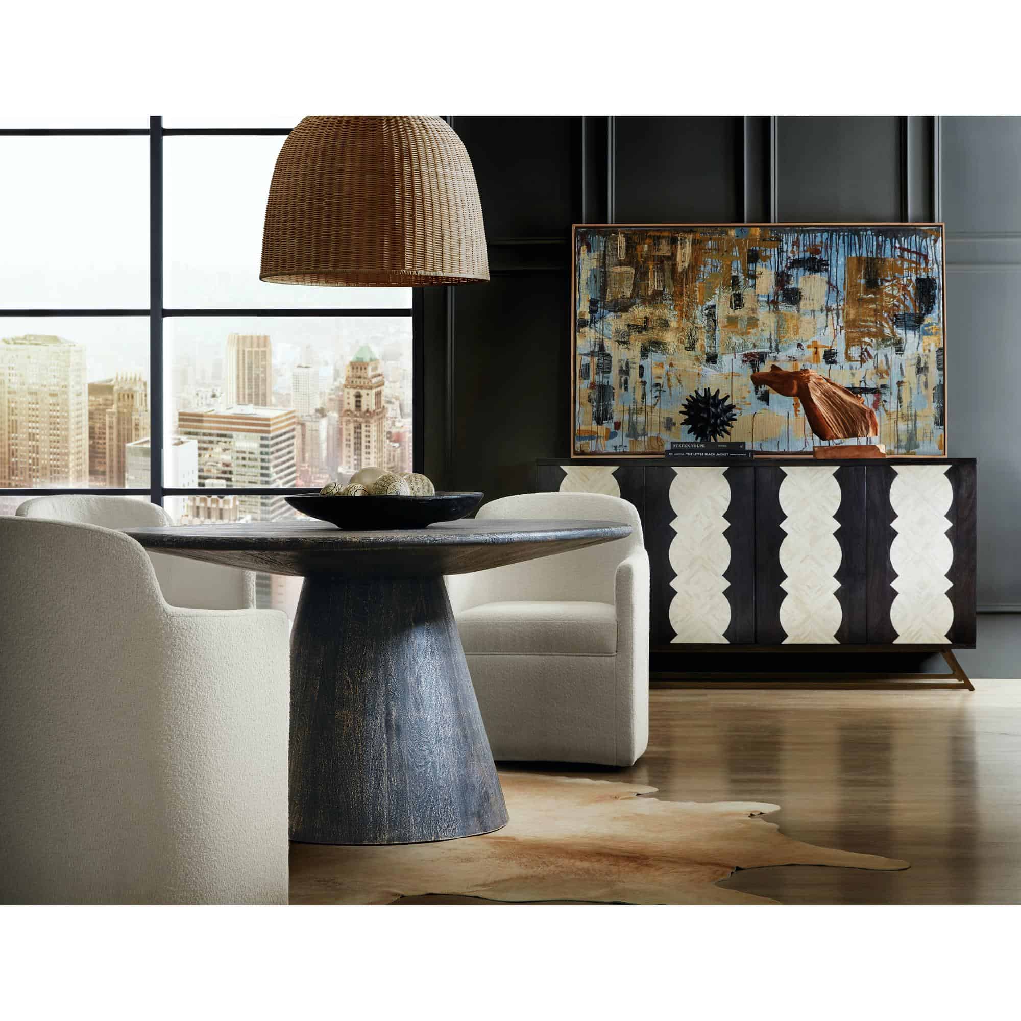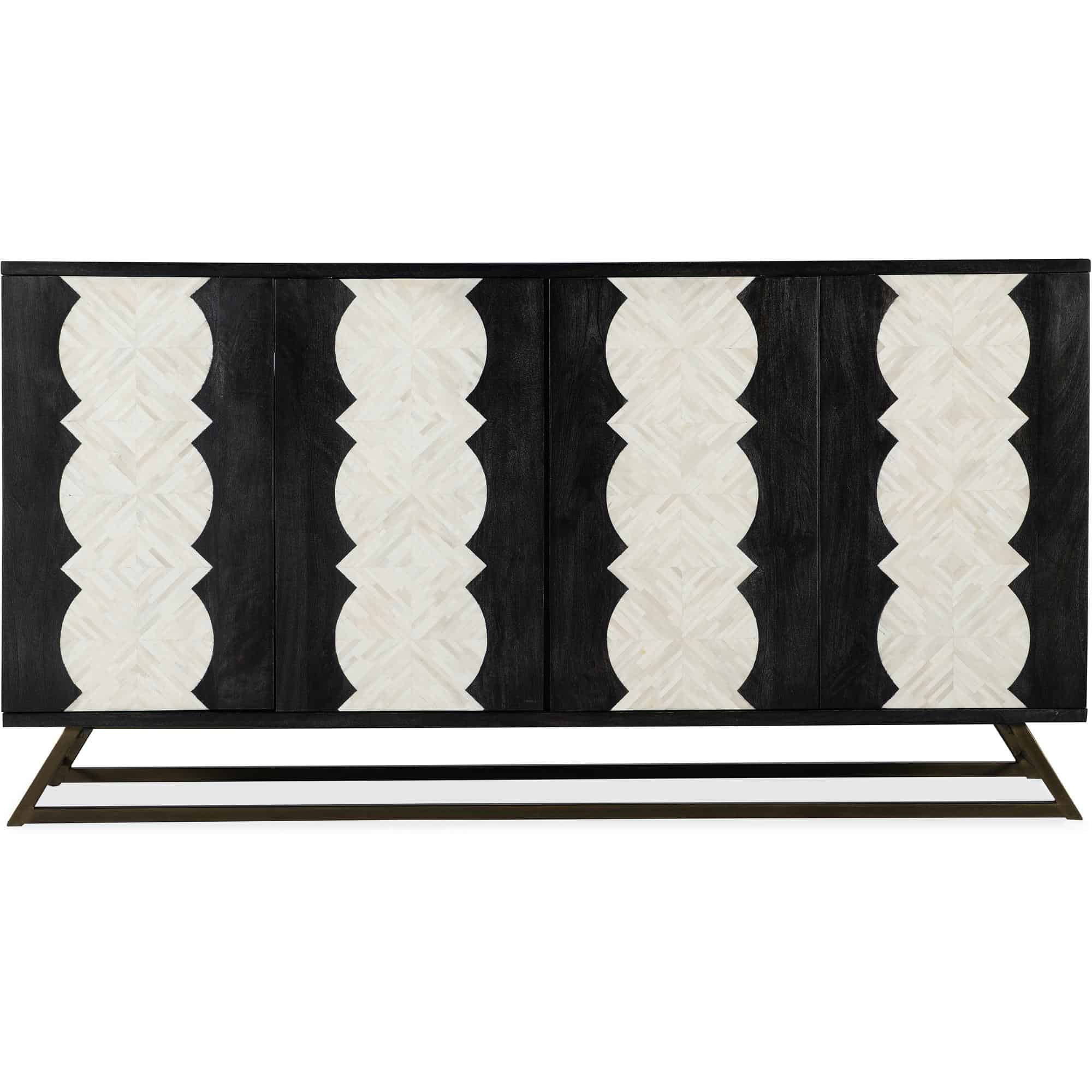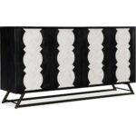 Finish: Natural black wood finish with bone inlay design on door fronts. Antique gold metal base. Transparent finishes reveal a higher degree of color and grain variances, creating an irresistible one-of-a-kind silhouette.