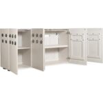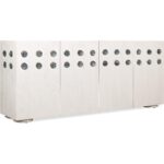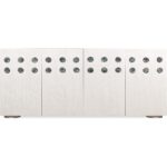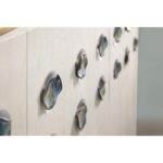 Features: Four doors with soft close hinges, touch latches and ceramic hardware One adjustable wood shelf behind each left and right doors One adjustable wood shelf behind center pair of doors Wire management and ventilated back panel behind all doors Inset green ceramic hardware with lily pad design