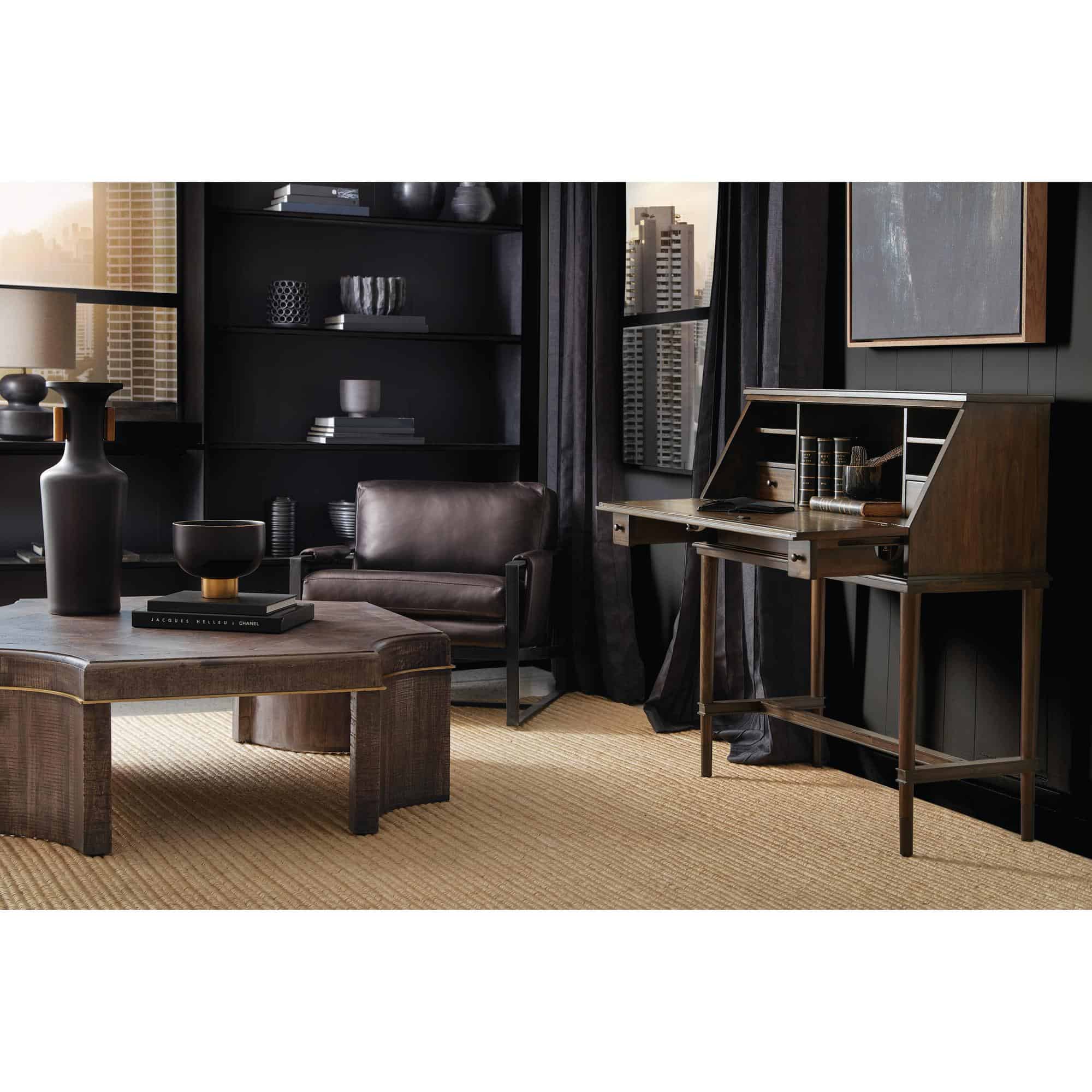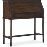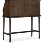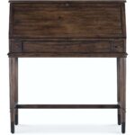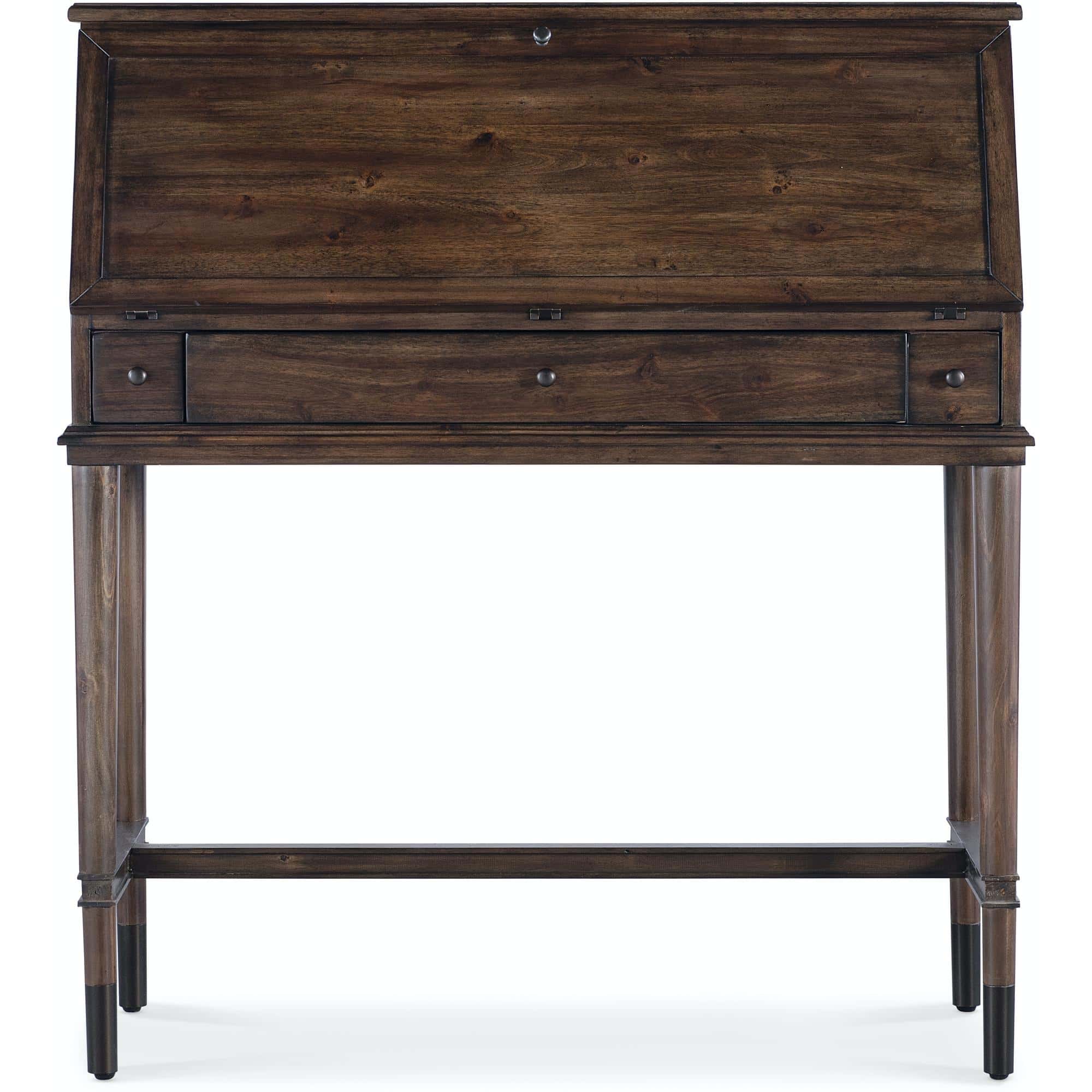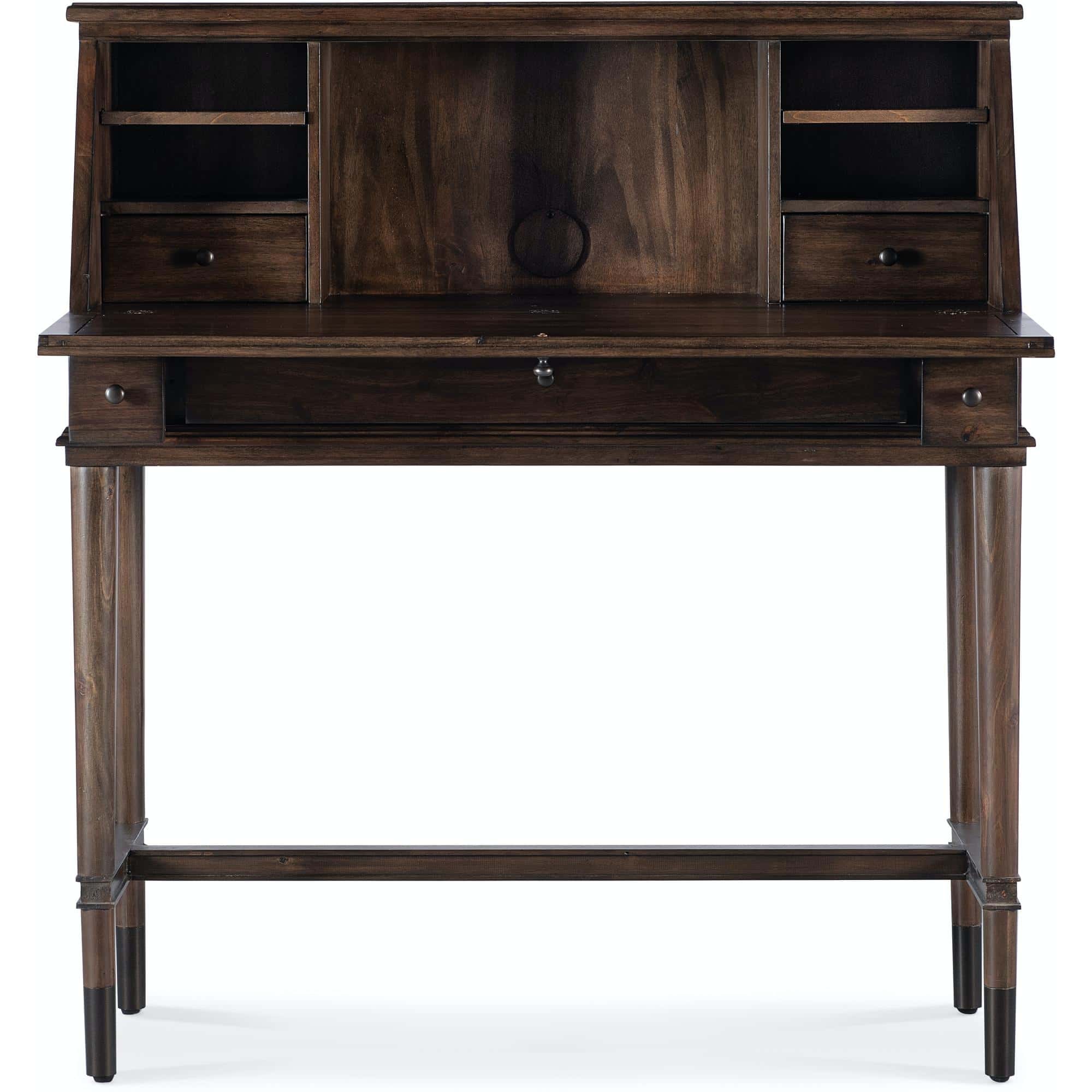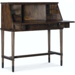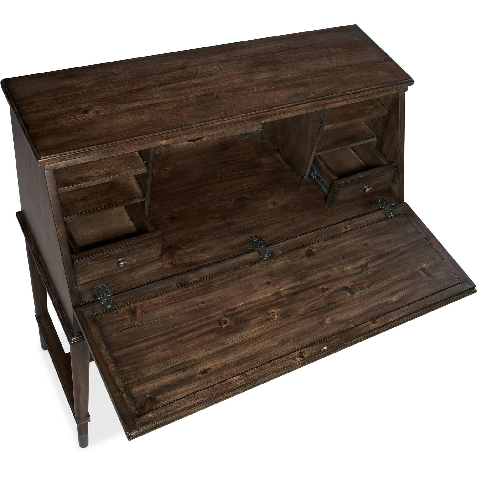 Features: One drop-down work surface Two pullout supports One center drawer Two tray drawers inside drop-front Two removable wood shelves inside drop-front Levelers Wire management with wood grommet that spins to conceal opening when not in use Wood stretcher Metal ferrules on legs