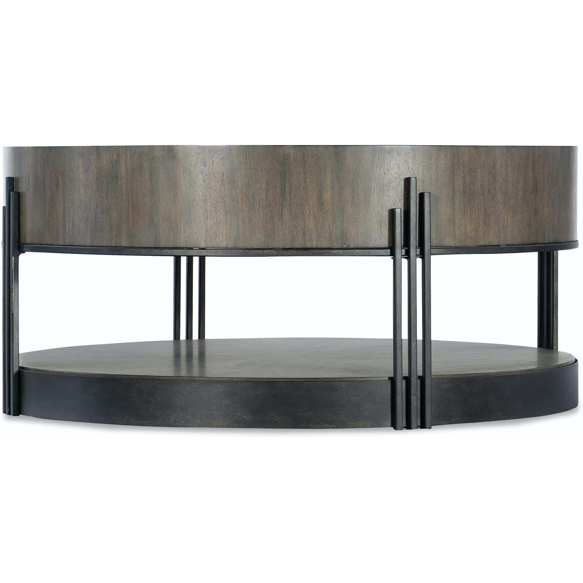 - Finish: Dark natural wood finish with dark bronze metal banding and legs