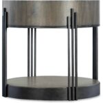 - Finish: Dark natural wood finish with dark bronze metal banding and legs