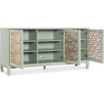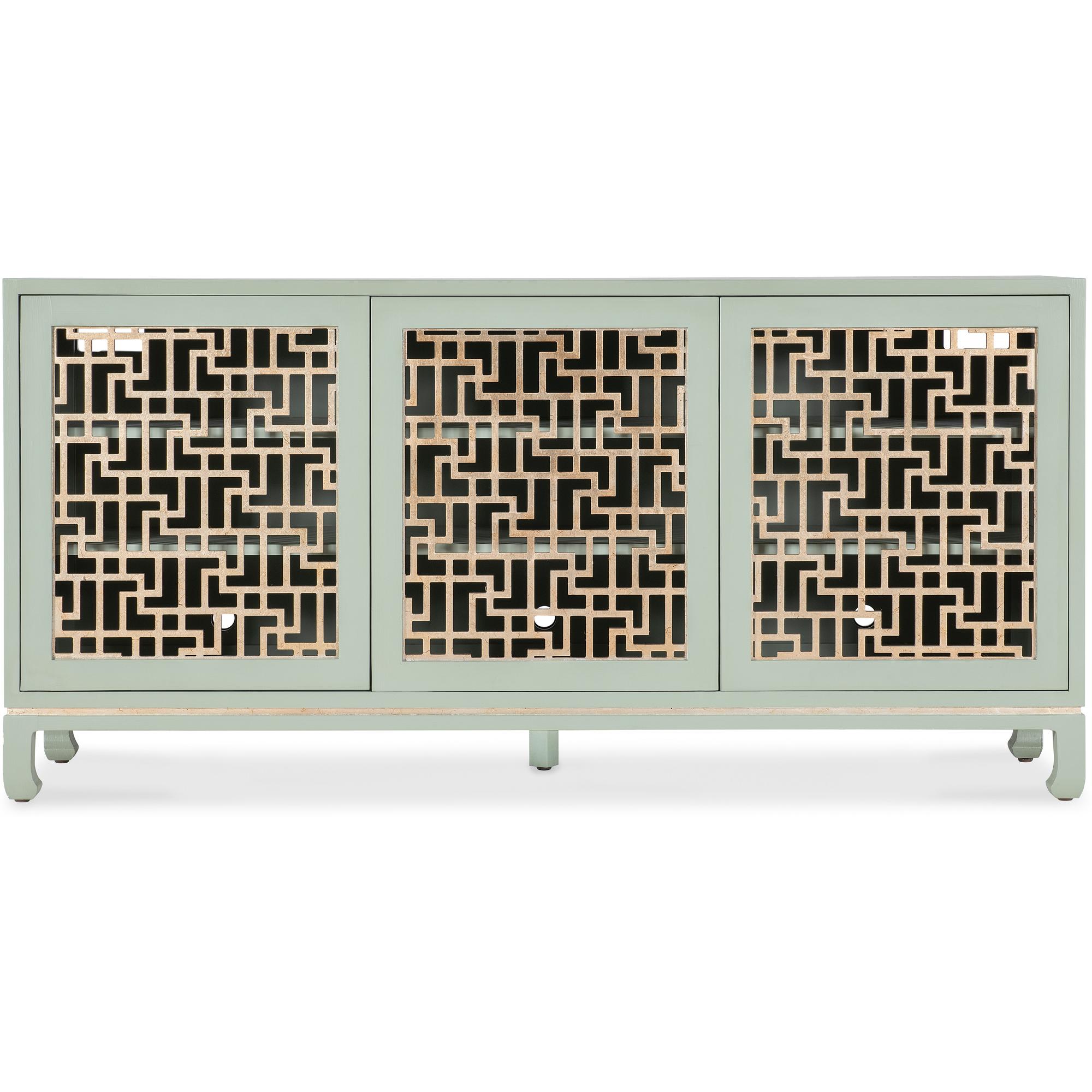 Finish: Light green painted exterior with silver leaf champagne-colored open fretwork and accent trim