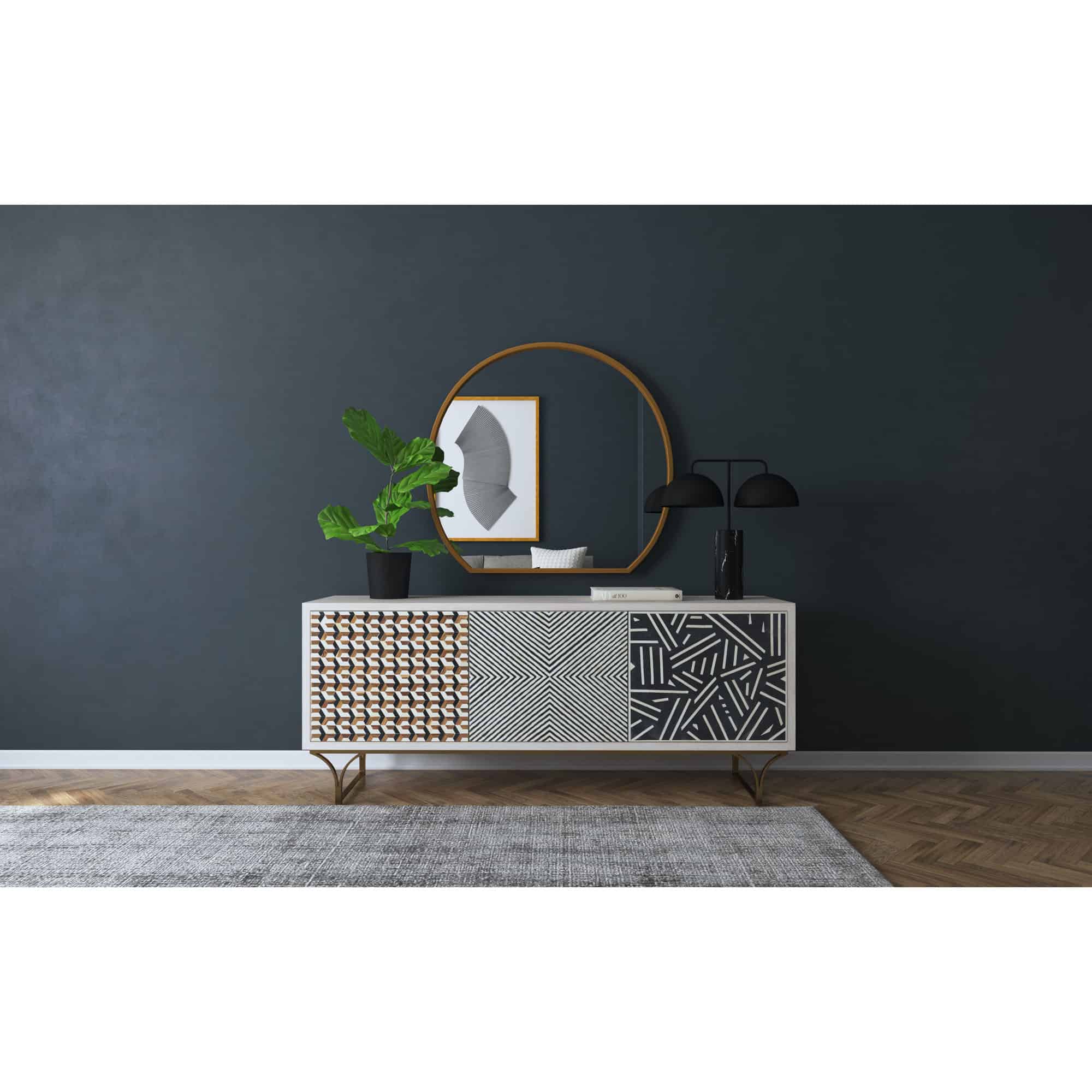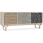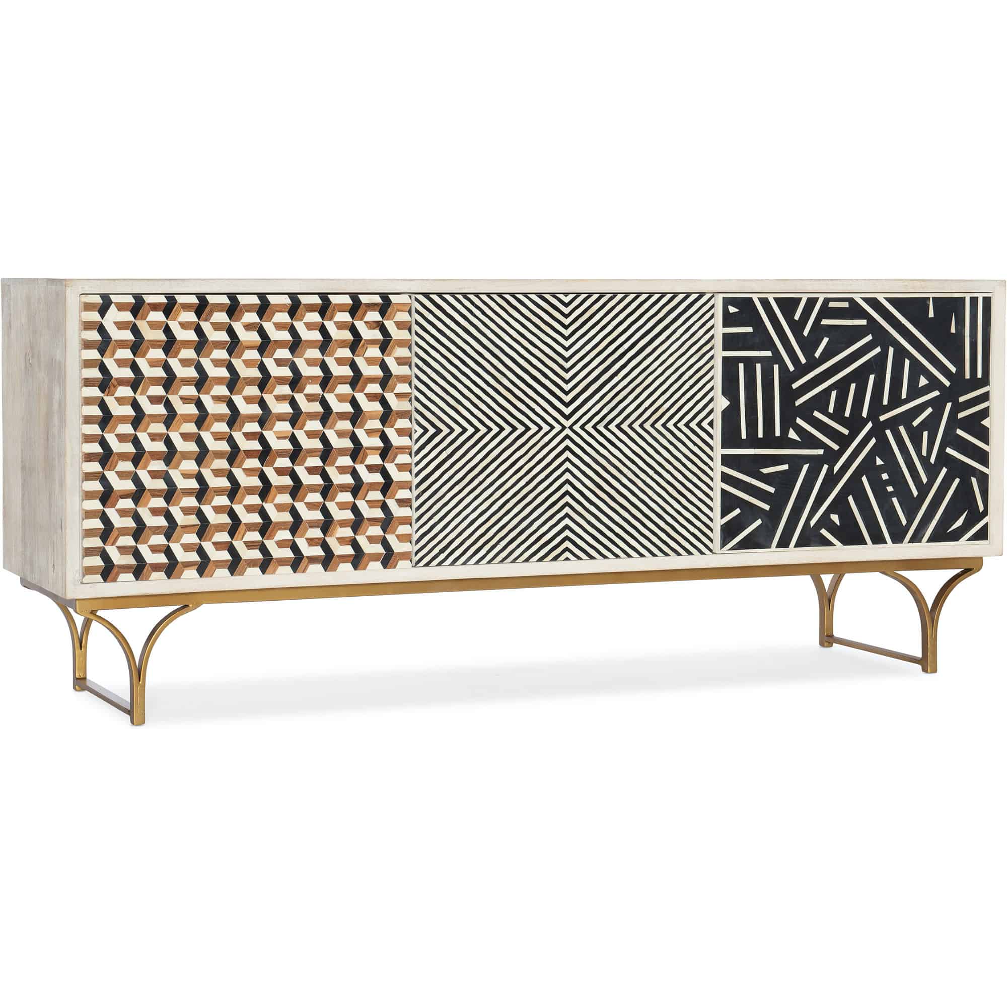 Finish: White washed natural wood finish with bone inlay designs on doors. Gold colored metal base. Transparent finishes reveal a higher degree of color and grain variances, creating an irresistible one-of-a-kind silhouette. An artisan technique using hand-selected bone pieces, results in subtle and unique variances from piece to piece.