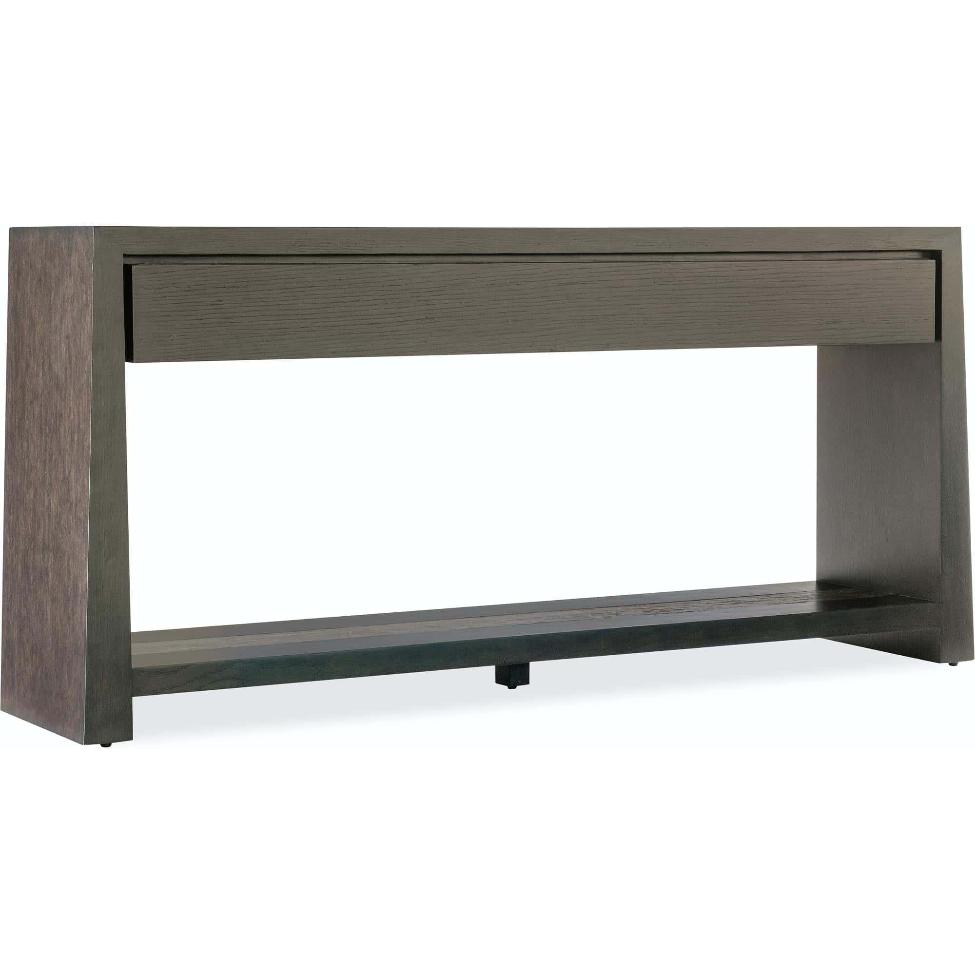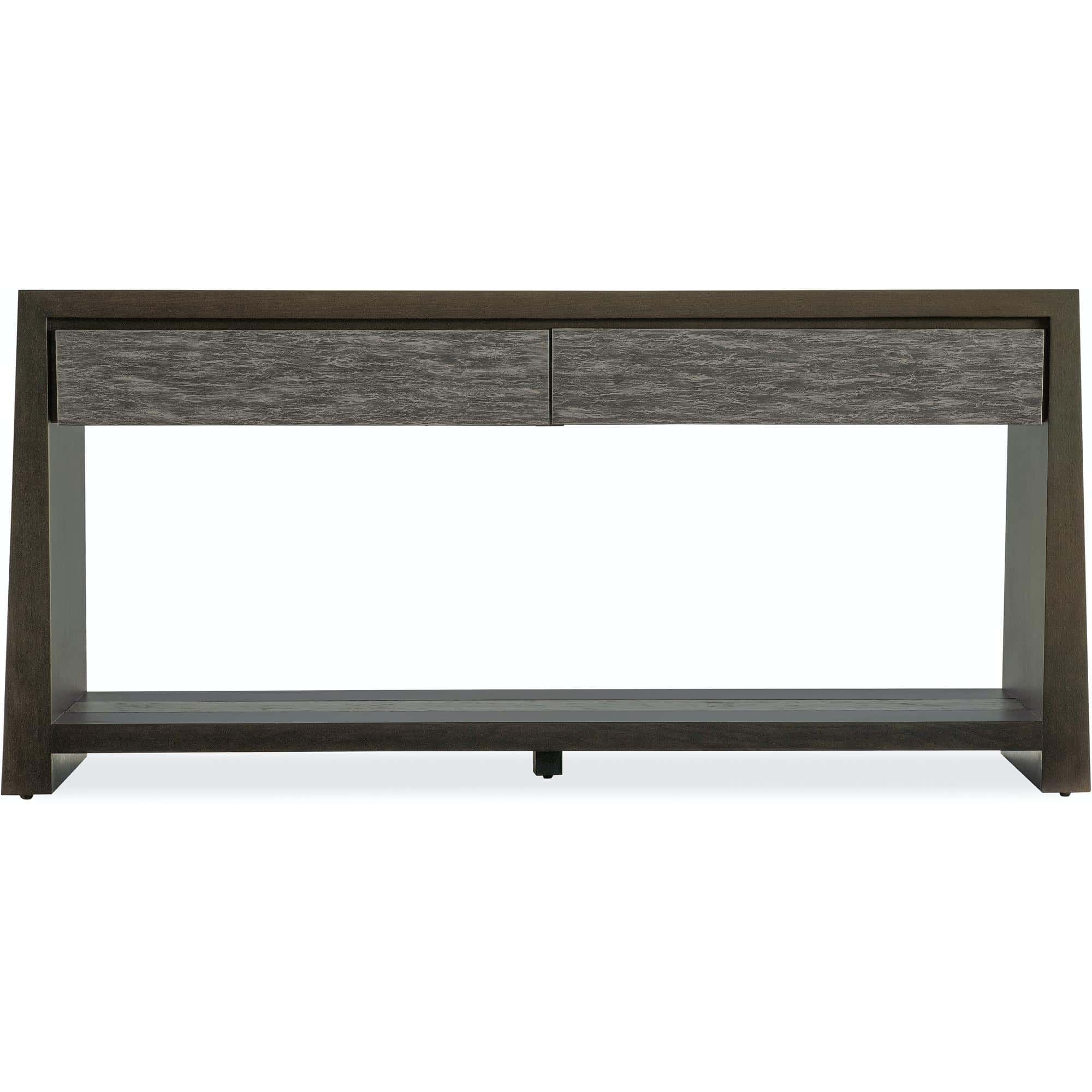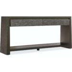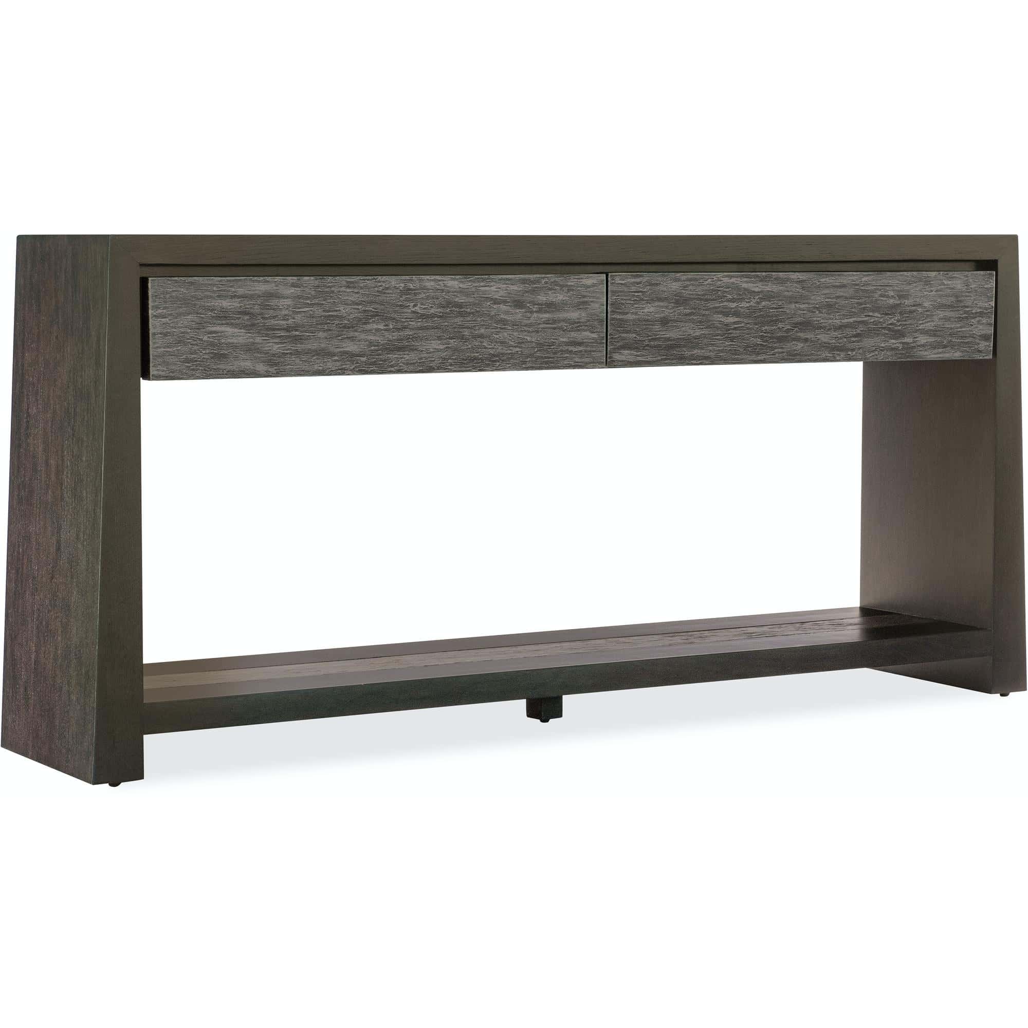 - Finish: Dark wood finish with contrasting gray textured finish on drawer fronts and shelf