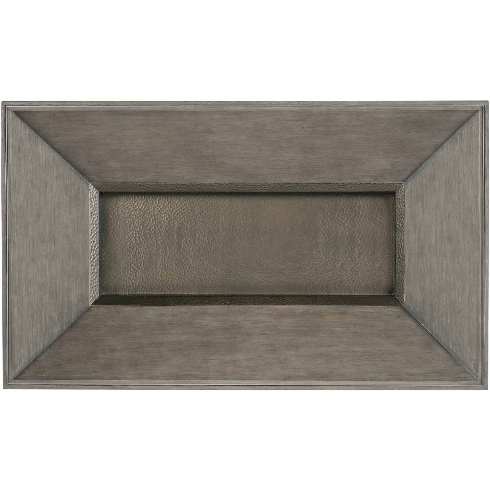 - Finish: Dark wood finish with antique brass hammered metal inset