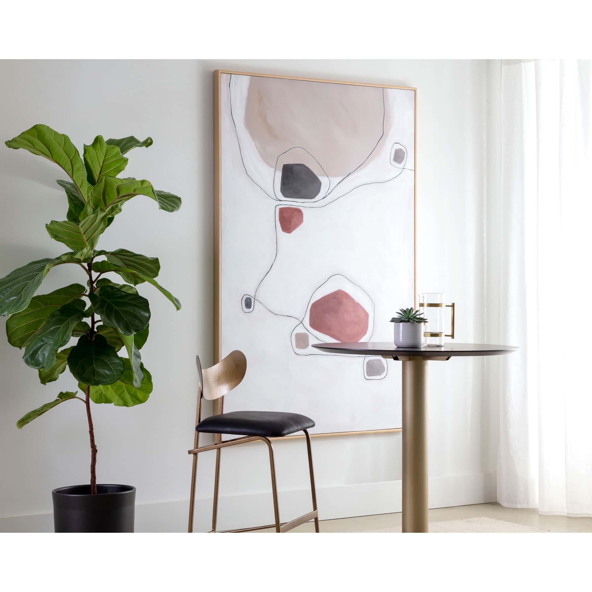 A modern art piece that features thin free flowing lines encompassing muted forms in a terracotta colour palette. Features a natural wood floater frame. Each artwork is hand-painted and will feature slight variations that make every piece unique.