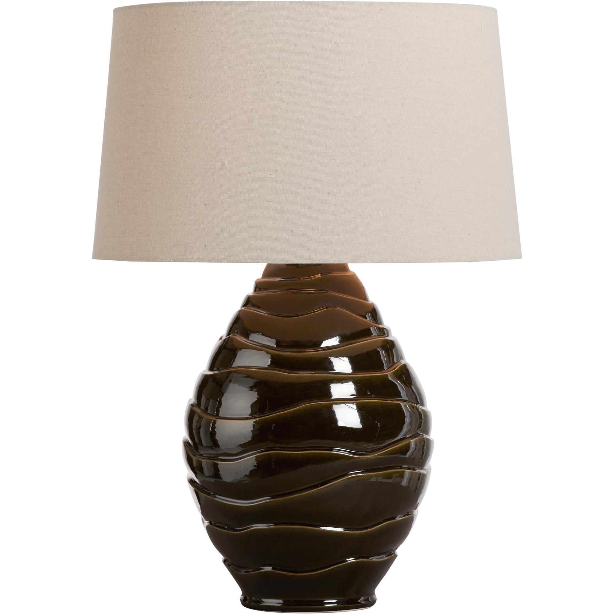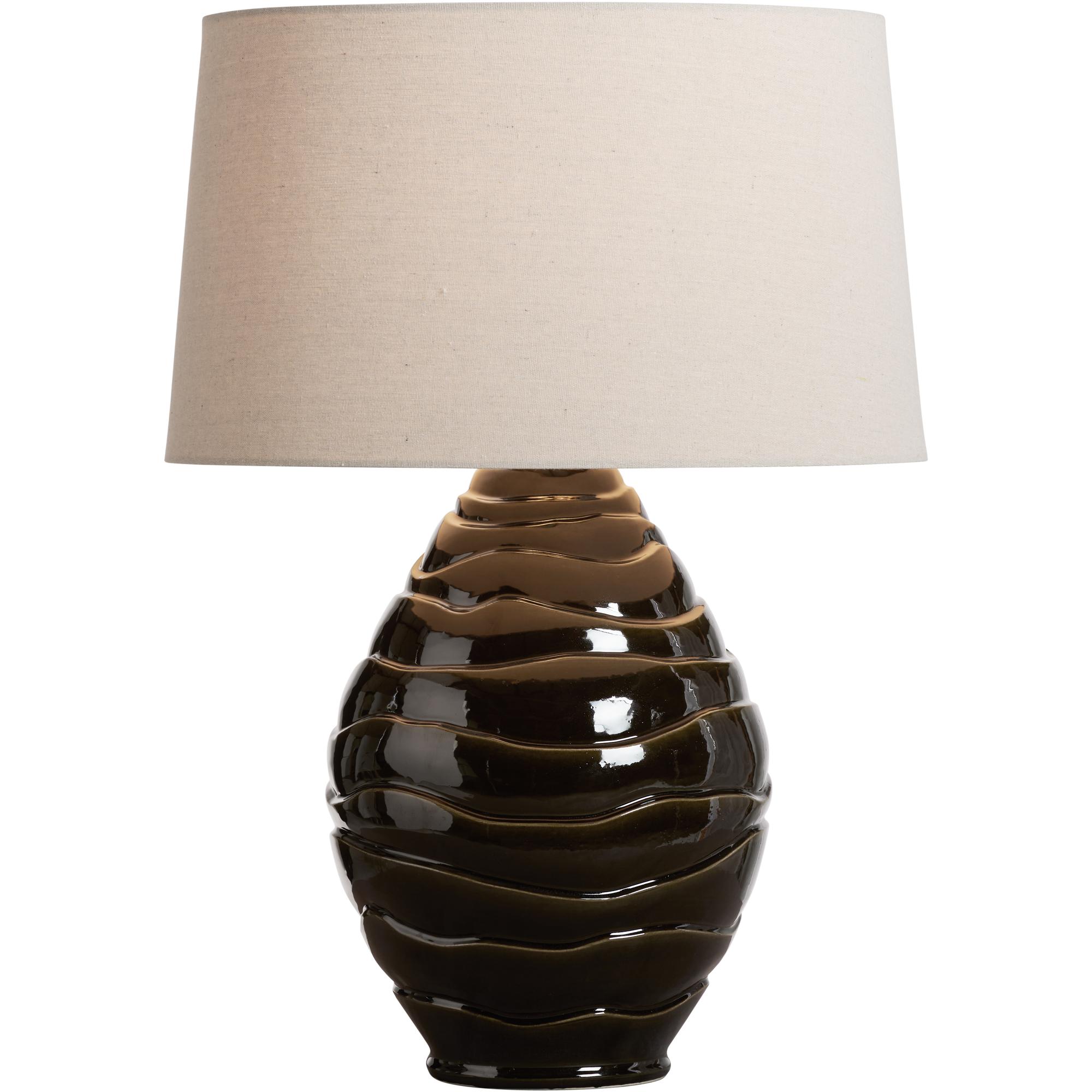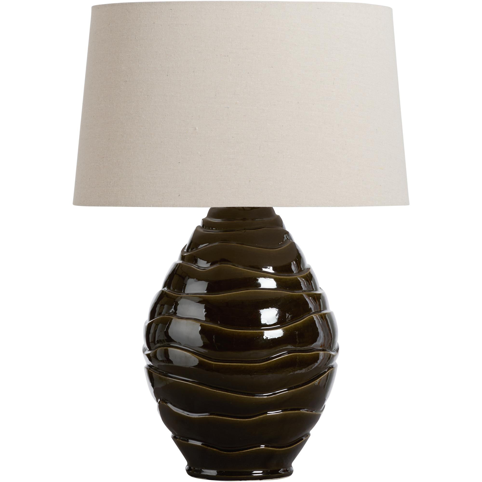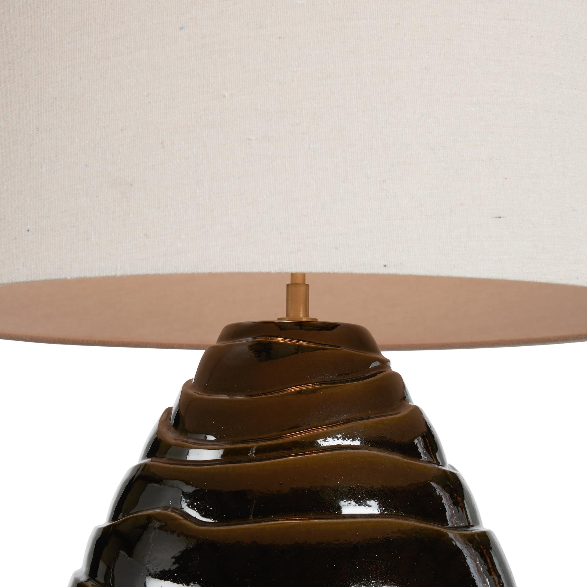 The Cono Lamp brings sculptural elegance to any setting with its striking silhouette and rich finish. Crafted from Italian ceramic, the base features a tiered, organic form glazed in a deep greenish brown that shimmers subtly under light. Topped with a warm linen shade, this lamp offers a sophisticated blend of texture and tone.