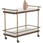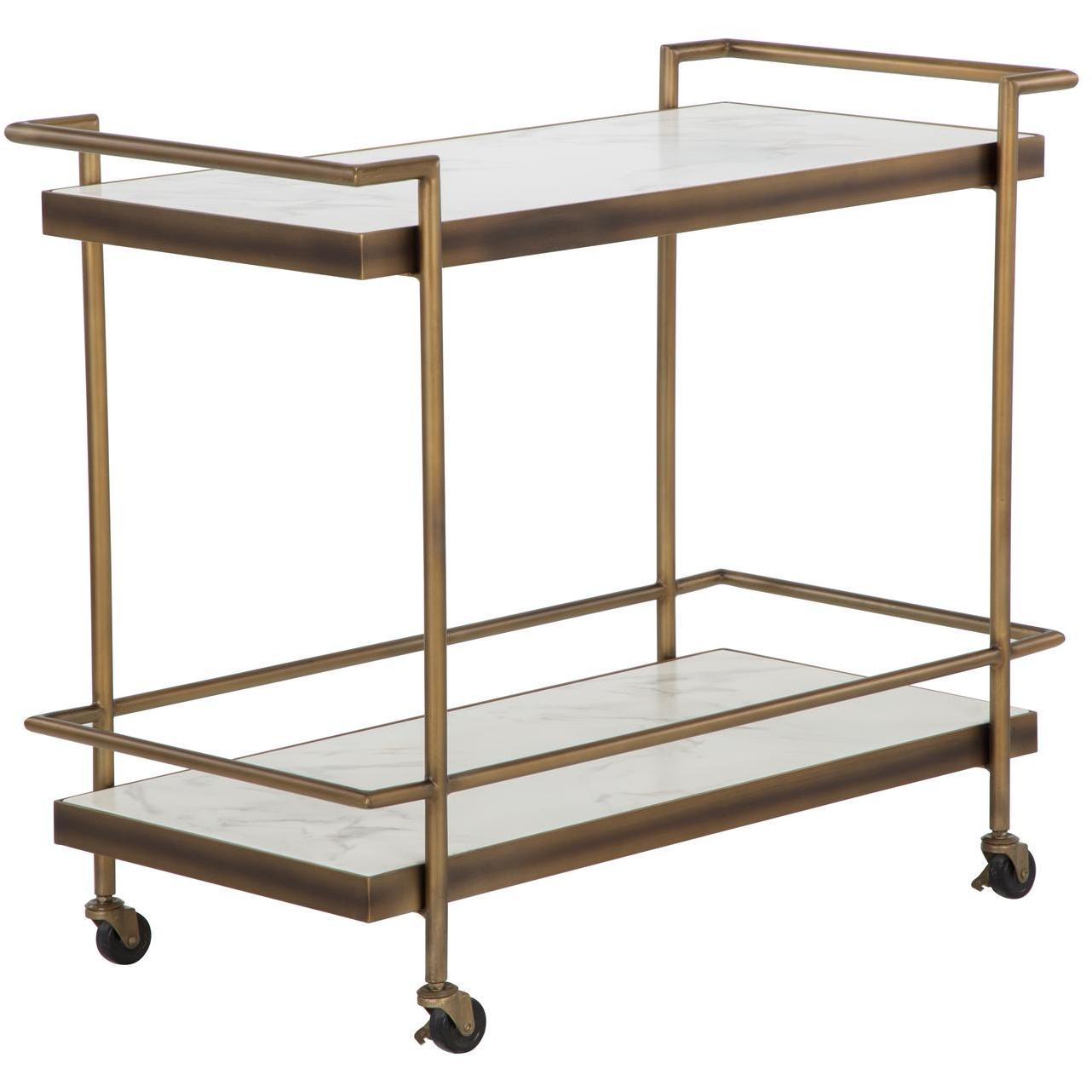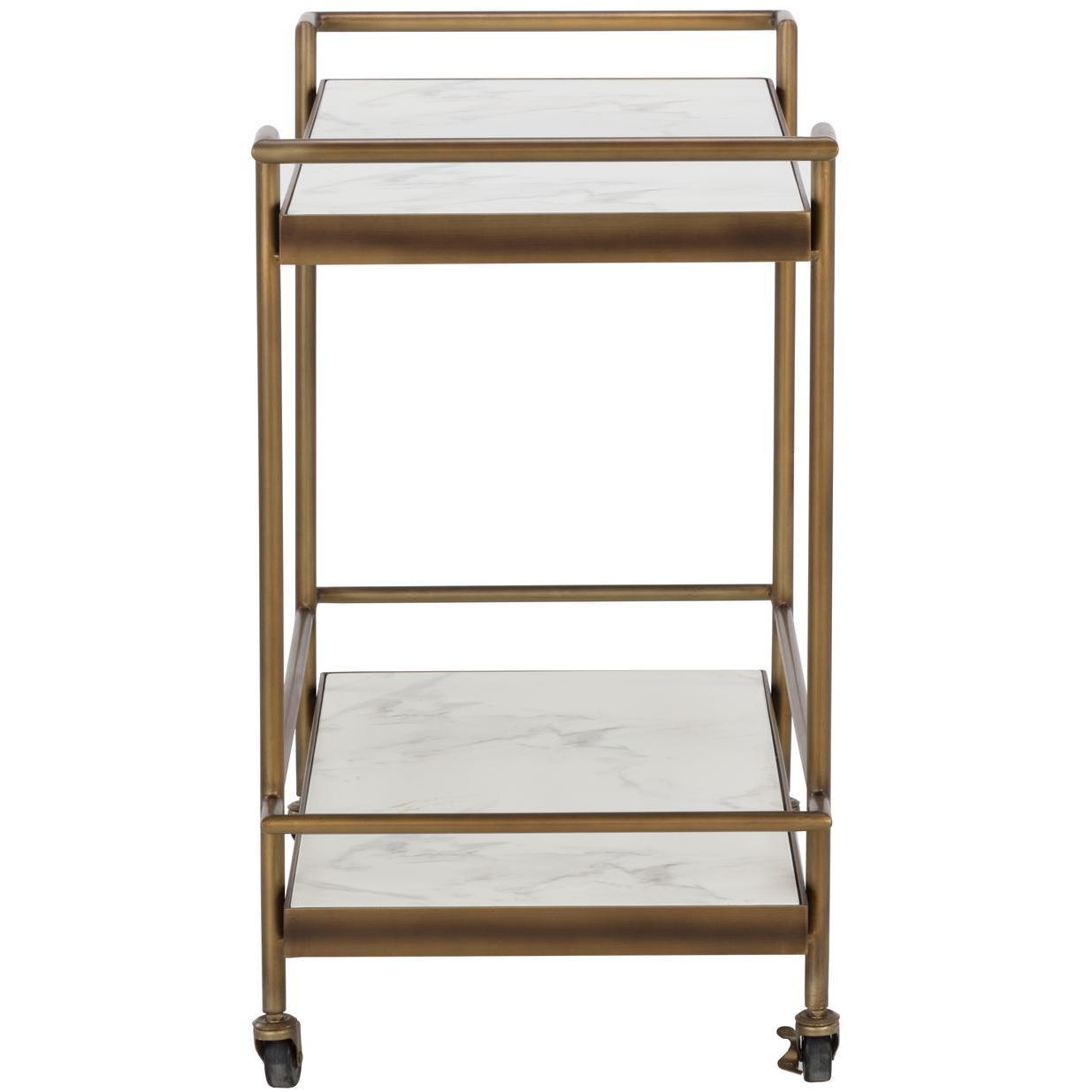 Elegantly display your spirits or drinkware with the Contardi Bar Cart. Built for durability, this bar cart features a powder-coated steel frame with a rustic bronze finish. The bottom and top shelves are made from reinforced concrete with a beautiful white marble look. Crafted from a natural concrete mix, each piece will look different. Variations in colour, texture, imperfections, surface scratches and non-structural hairline cracks are considered inherent and valued qualities of the material.