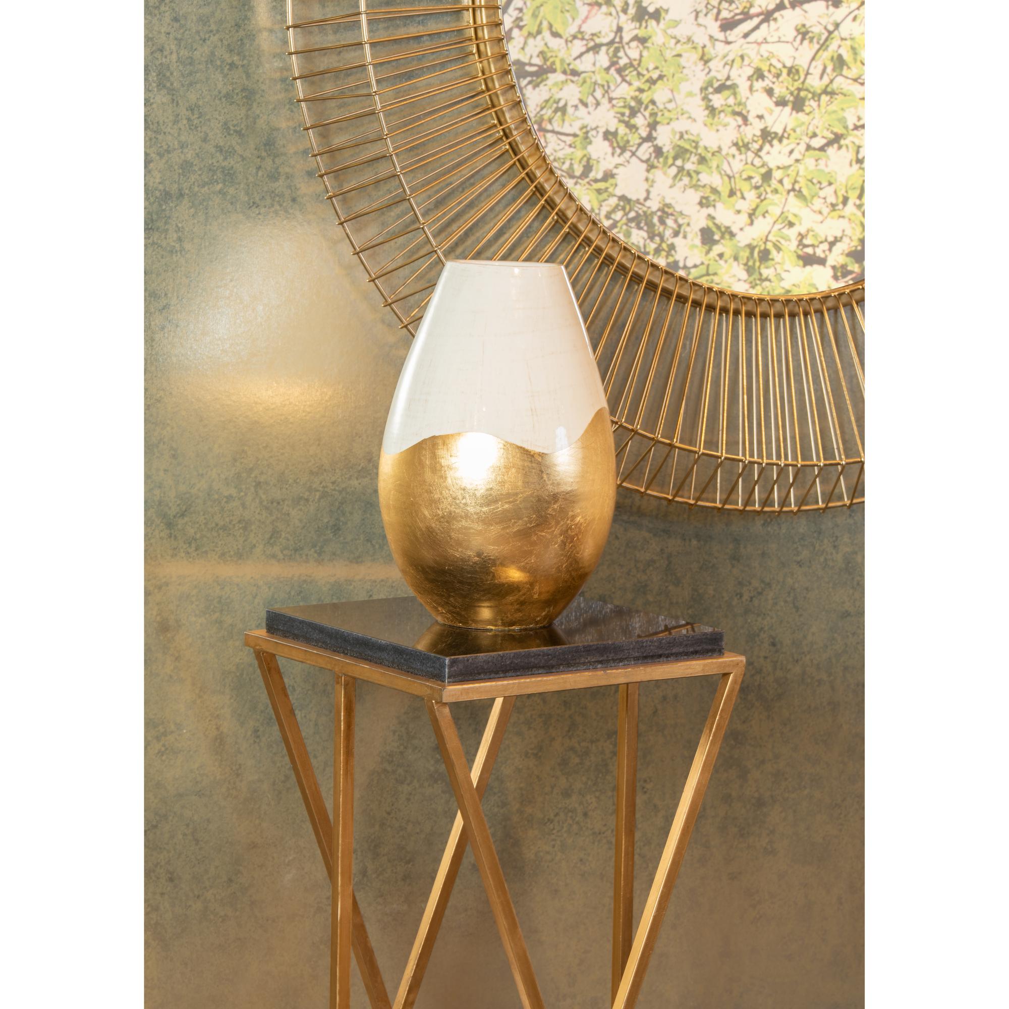 Add shine to your table or bookcase with this white glazed euroceramic vase with metallic gold leaf. This exquisite example of Italian pottery is 14″ in height. Feature as a stand alone piece or add greenery to create a unique accent for a contemporary design style. (Mouth opening: 3.5″)