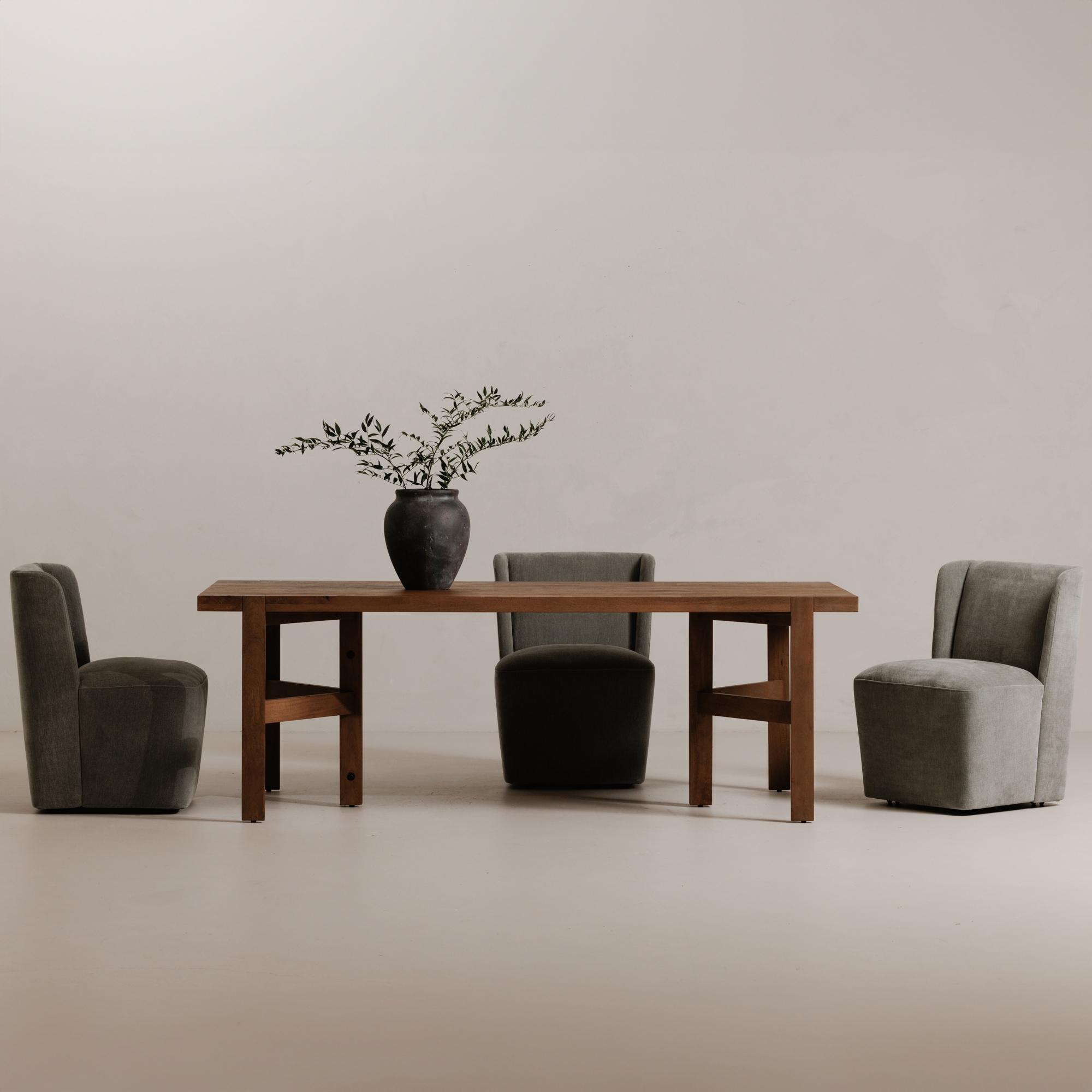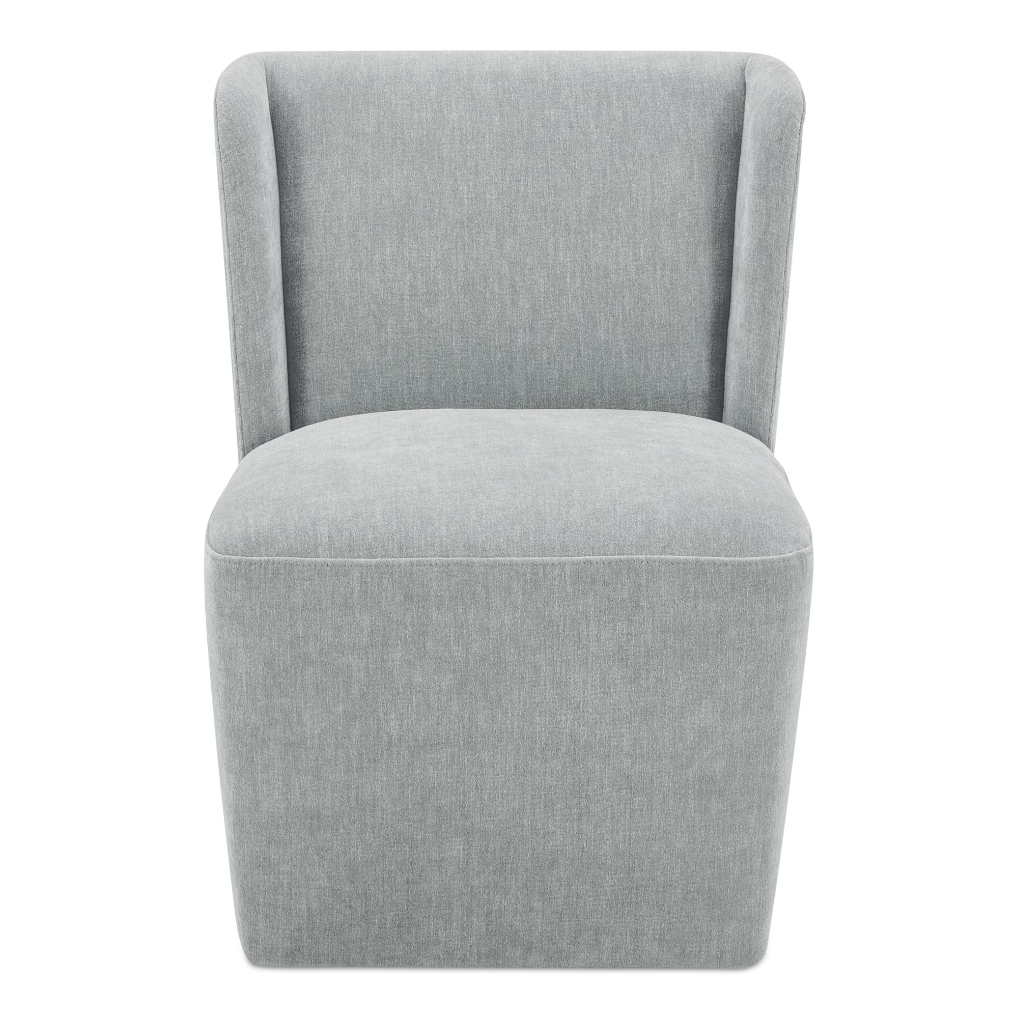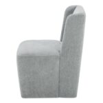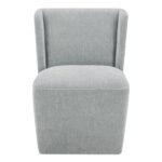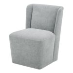 The Cormac rolling dining chair is all about comfort with a generously padded seat and backrest, a slight curve of the back and caster wheels that effortlessly glide across the floor. Crafted from high-performance fabric that is soft to the touch yet resilient against stains, spills, and daily wear.