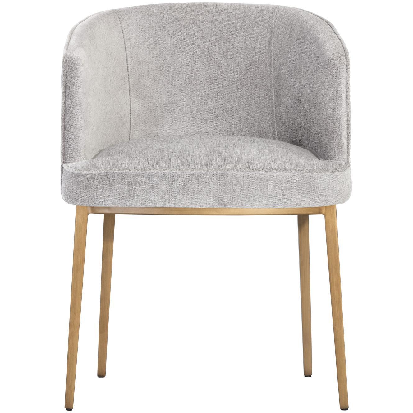 Feminine flair comes to life in this modern dining chair. Stocked in our polo club stone performance fabric with elegant diamond stitching on the exterior seatback. An antique brass steel frame completes the look. Performance fabric is moisture repellent, durable and easy to clean.