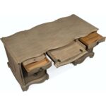 • Finish: A wire-brushed, artisan, light natural finish with reclaimed character is on exotic beautiful Acacia wood, known for its rustic charm, tactile hand, knots and color variations in serene organic hues of gray, rose and natural. Distressing includes wire brushing, rock, worm holes and scratch antiquing. Burnished bronze hardware.