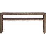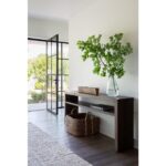 This crisp, linear walnut sofa table accented with antique satin brass features an open display shelf, providing additional surface area for storage.