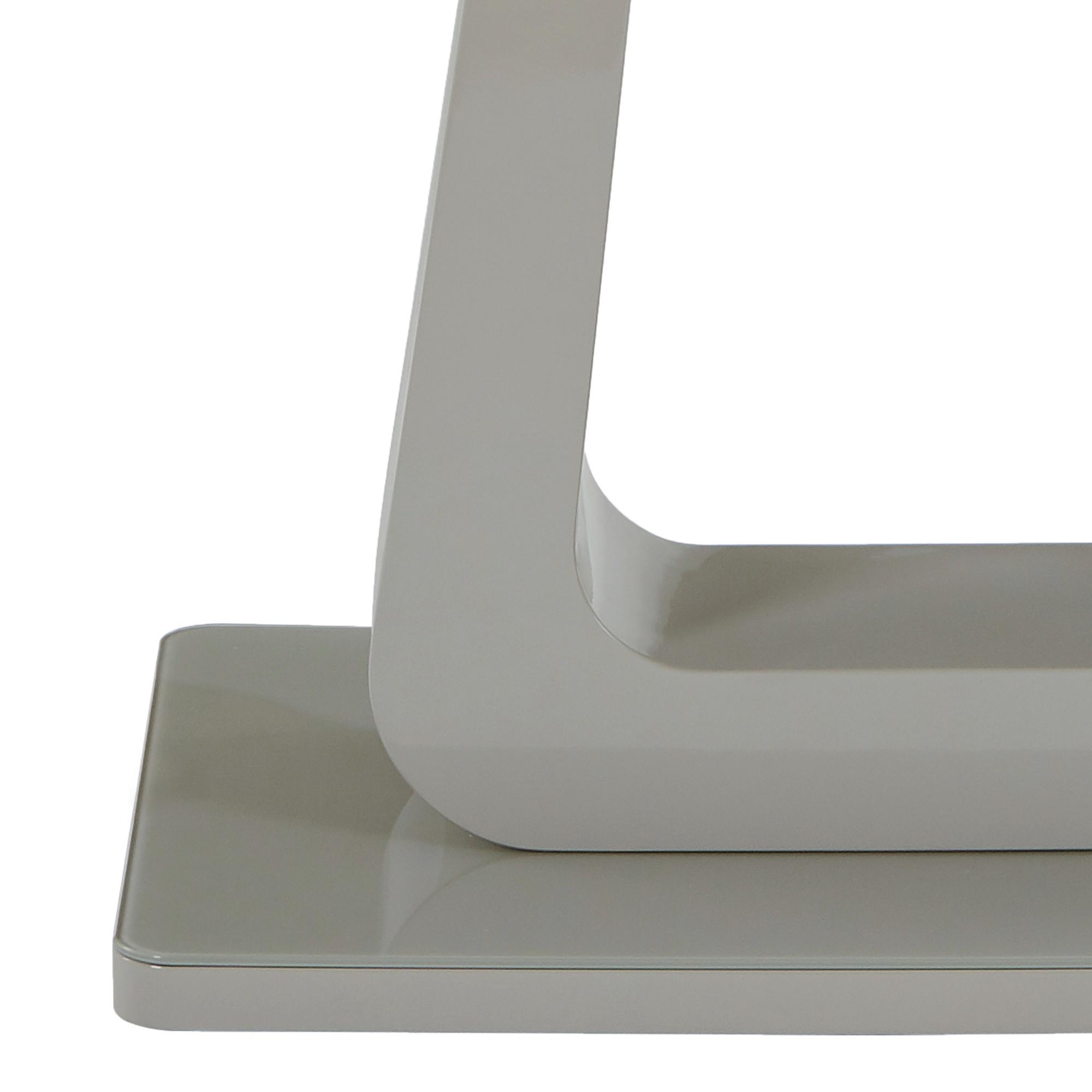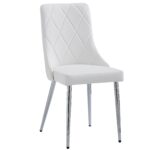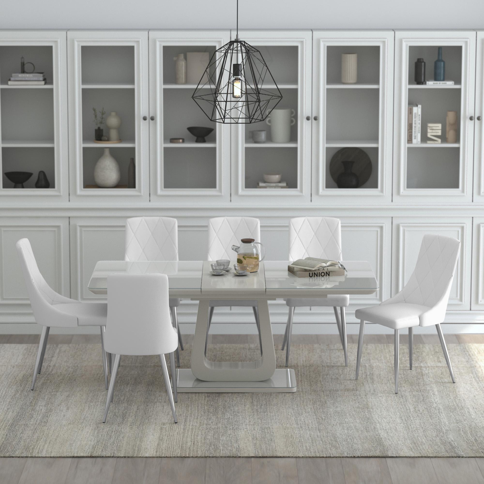 The high gloss, grey painted finish give this table a high end feel without busting your budget. Topped with a tempered grey-tinted glass on the table top as well as the base, this table will elevate your dining room design. The one-handed extension mechanism makes accommodating extra chairs quick and easy. The fun, modern pedestal base will start many conversations. Neutral colouring allows for an easy blend with many decor styles. Composed of wood, faux leather, and metal, this side chair is a show stopper all its own. With its curved wood seat frame, seat cushion covered in faux leather upholstery with stitching details on the back, and chrome-finished metal legs, this chair unifies a multitude of elements all into one perfectly composed design. The comfortable seat allows for hours of conversation around the dinner table, while the slim, tapered look of the metal legs adds a splash of sophisticated design.