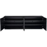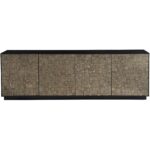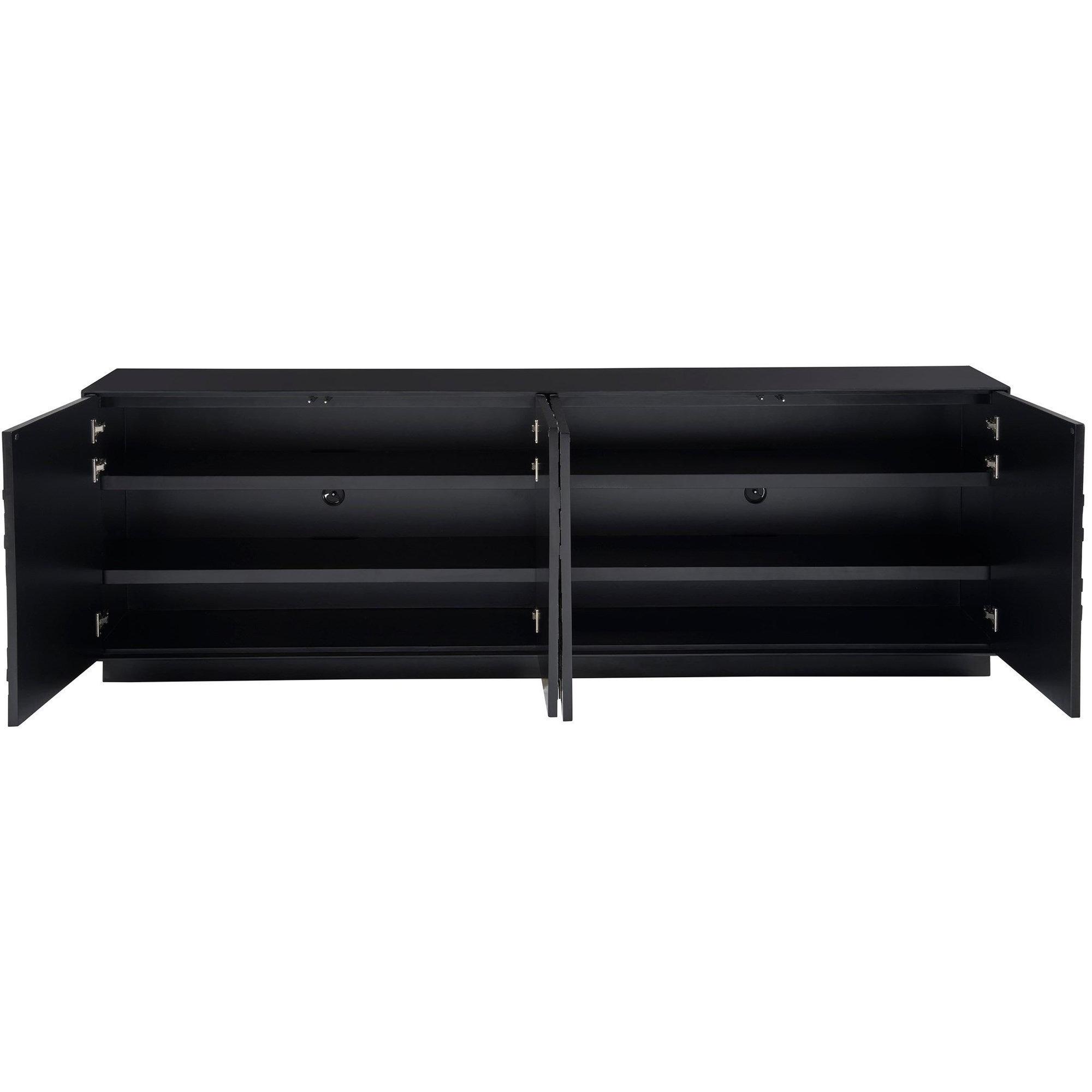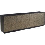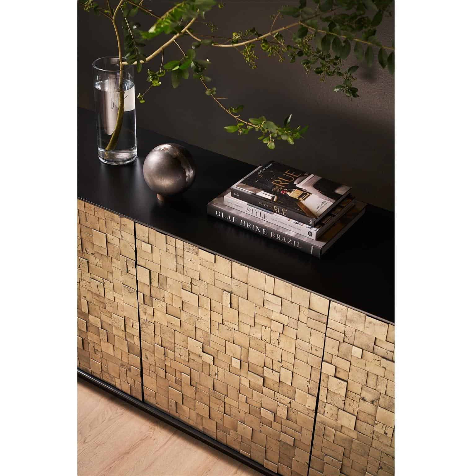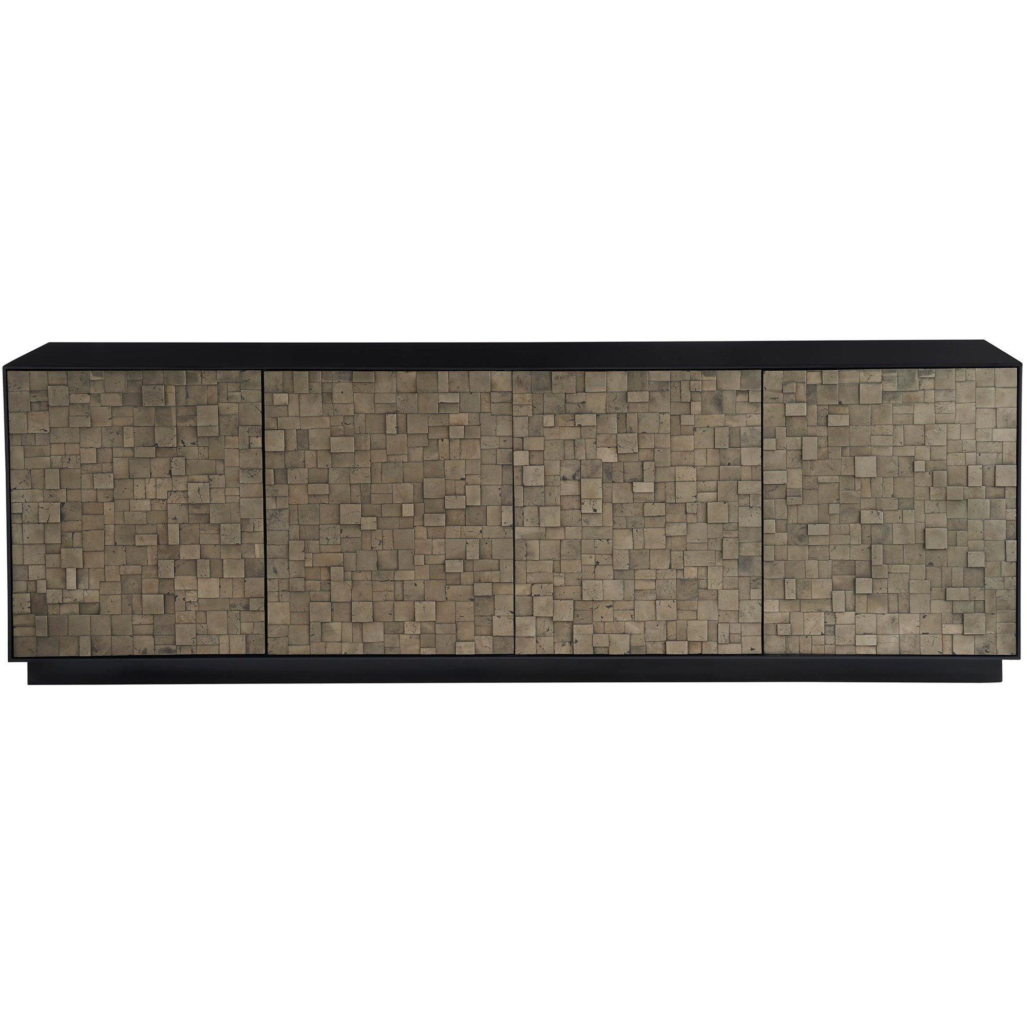 The Cosmo Credenza, crafted in Pyrite and finished in Matte Black, showcases a striking facade with its four doors, reminiscent of a sophisticated mosaic. This piece exudes confidence through its bold hues and defined silhouette, making it a statement of artistry and elegance in any space it adorns.
