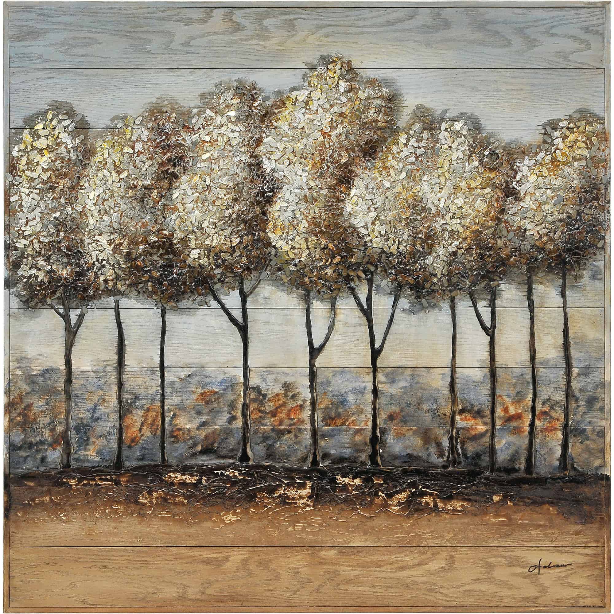 This stunning landscape is hand painted on wood with a beautiful coloration and heavy textures. Finished in a matching wood frame.