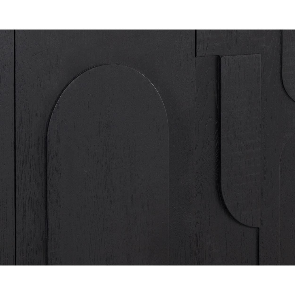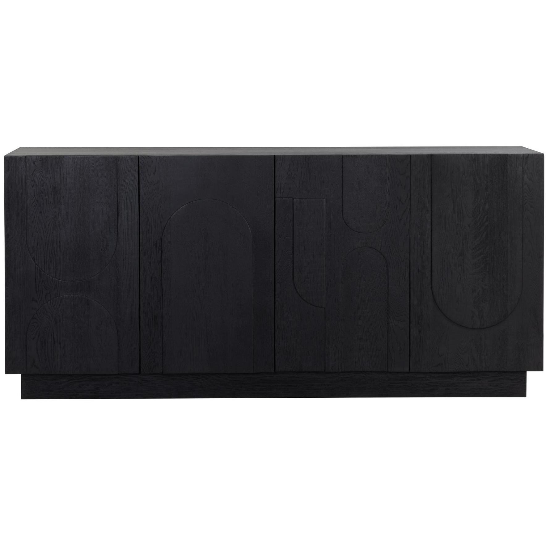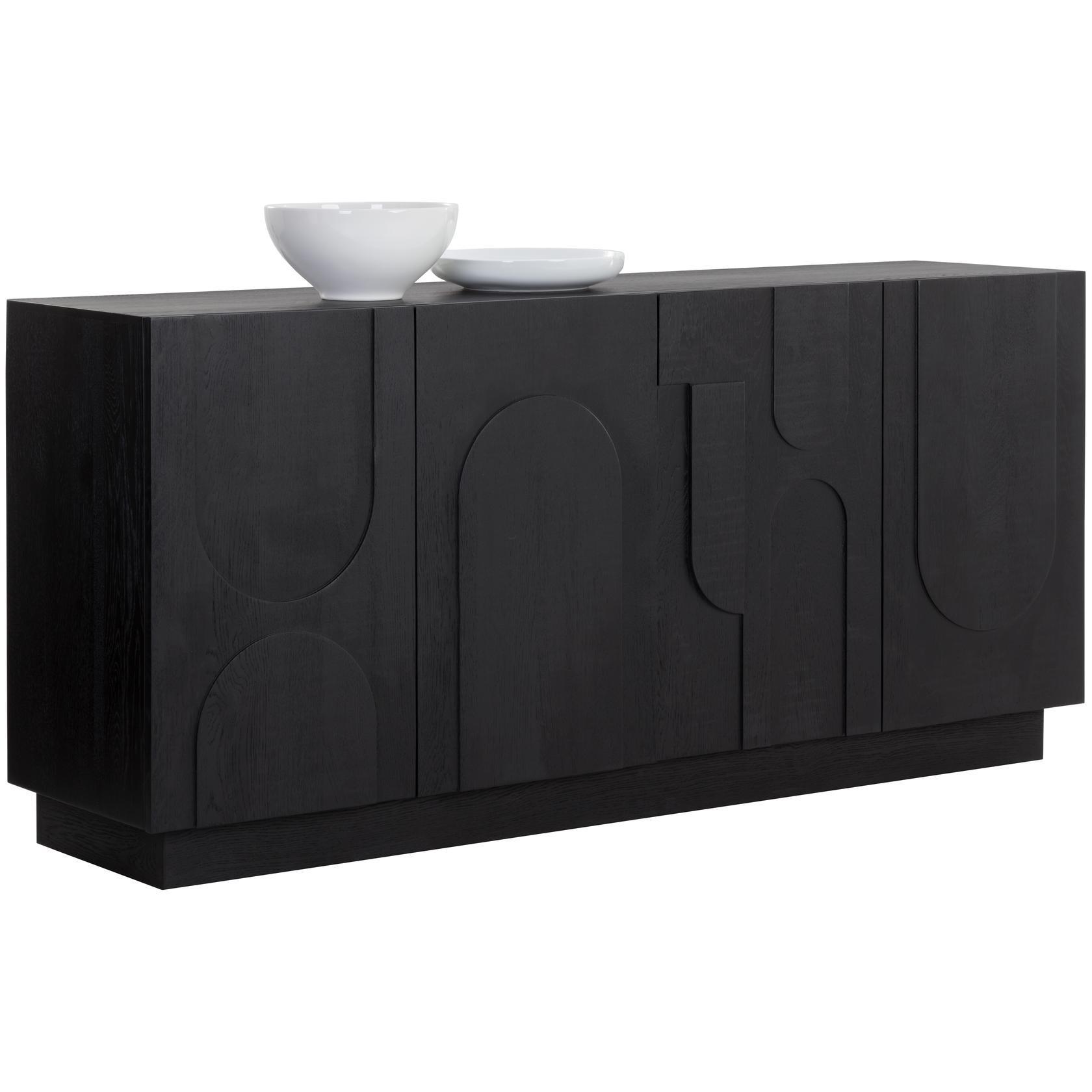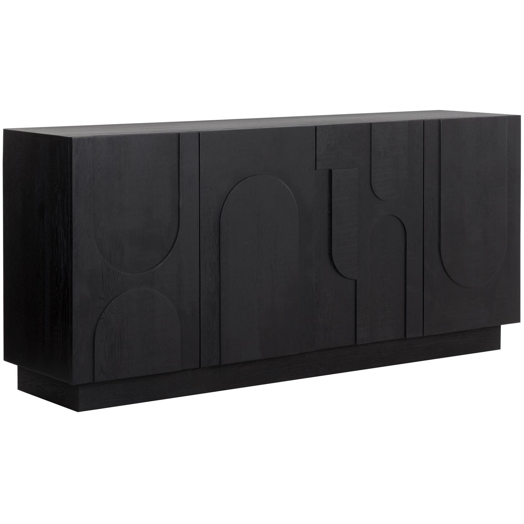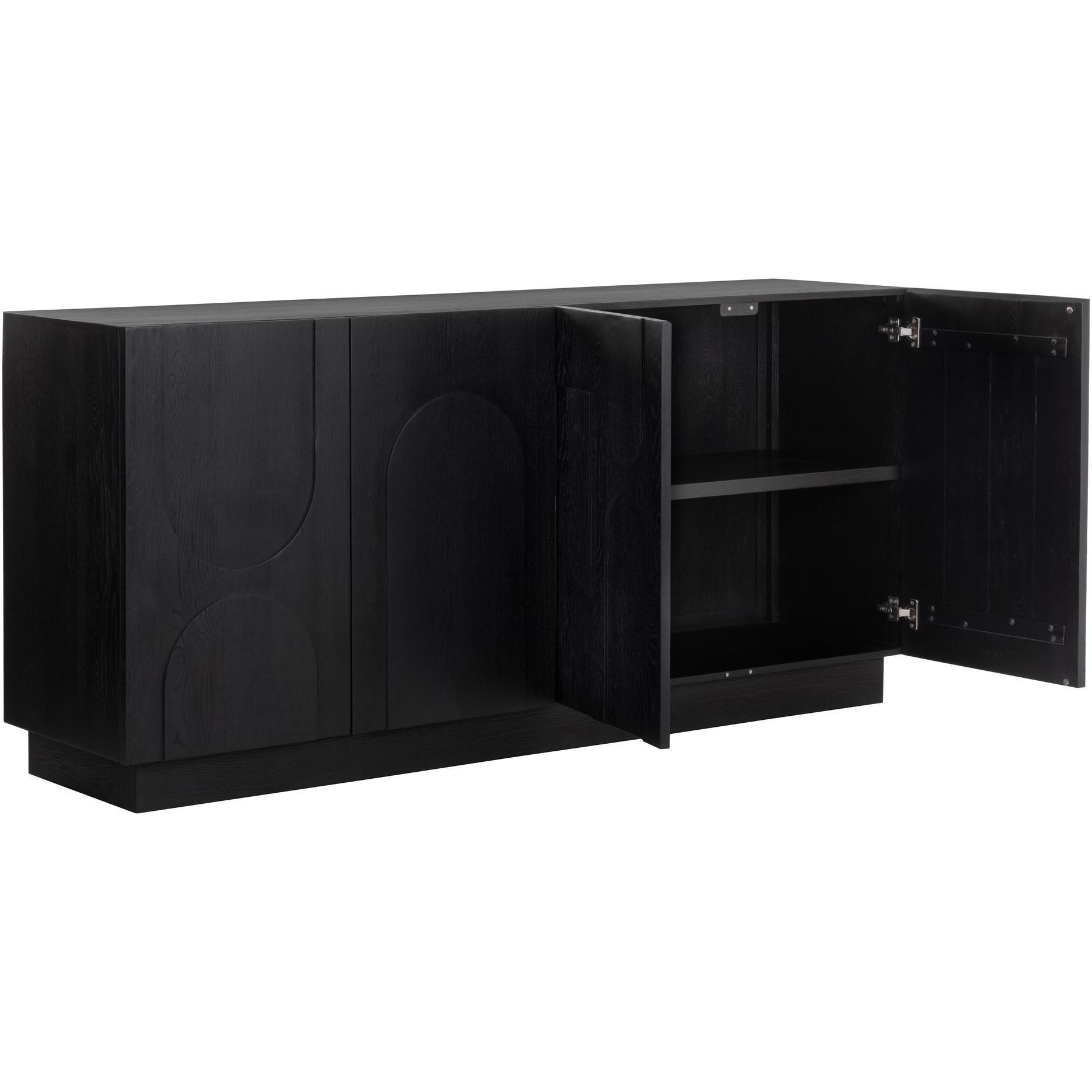 Taking cues from Scandinavian design, the Cove Sideboard is revitalized with beautiful wood patterning. Crafted from a black solid oak wood frame and completed with four cabinets for ample storage space. Anti-tipping kit included. As wood is an organic, porous material, these pieces will contain natural variation of texture and may also exhibit fine indentations and cracks. Wood pieces will also display a disparity of colour and grain, and visible knots and burls that add to the character of each piece.