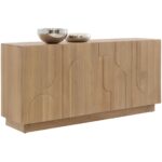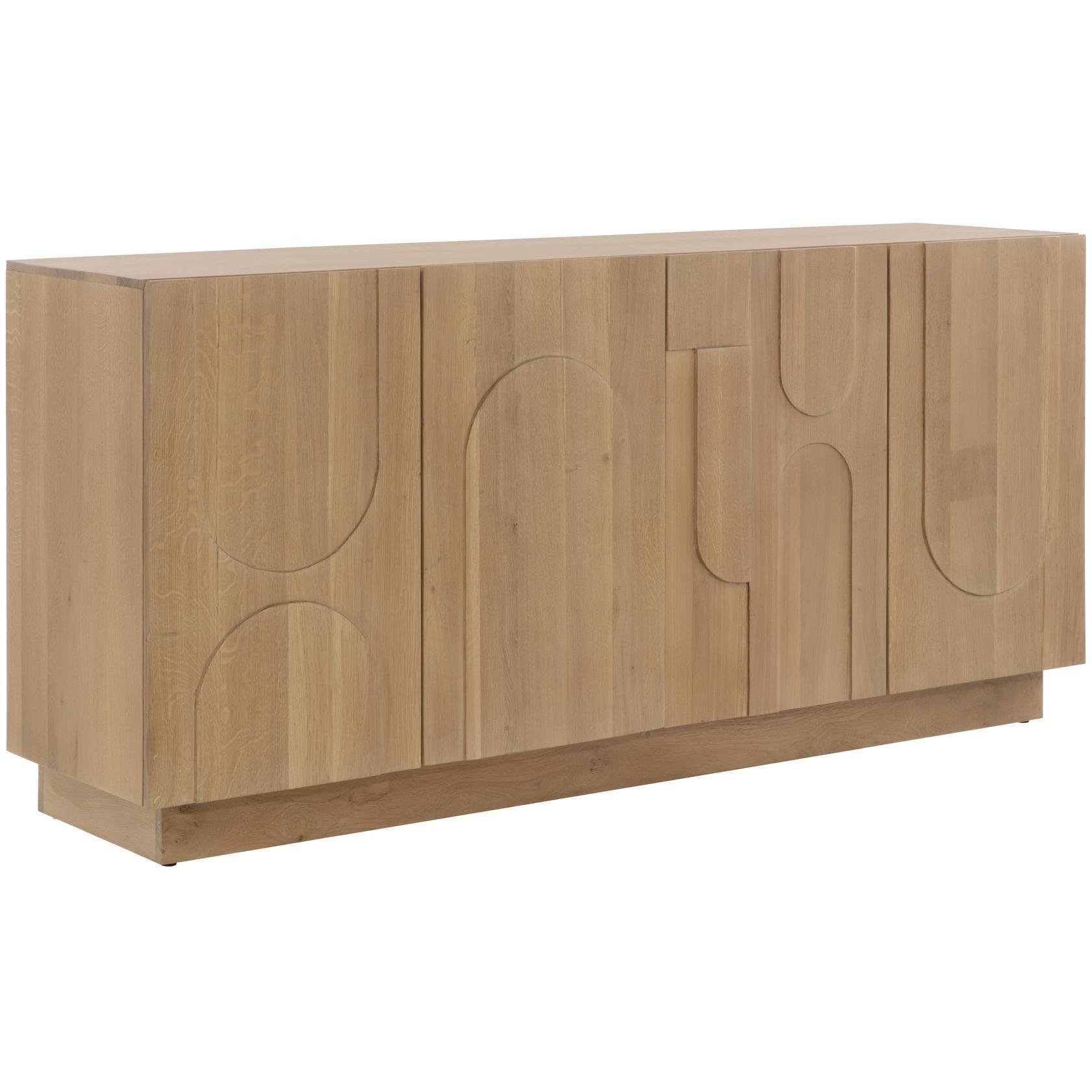 Taking cues from Scandinavian design, the Cove Sideboard is revitalized with beautiful wood patterning. Crafted from a brown solid oak wood frame in a rustic finish, and completed with four cabinets for ample storage space. Anti-tipping kit included. As wood is an organic, porous material, these pieces will contain natural variation of texture and may also exhibit fine indentations and cracks. Wood pieces will also display a disparity of colour and grain, and visible knots and burls that add to the character of each piece. Made in India. With refined craftsmanship, this design was brought to life by skilled local artisans. Due to the nature of handcraftsmanship, unique imperfections such as fissures, markings and variations in colour and shape are welcomed and appreciated characteristics for a truly one-of-a-kind piece.