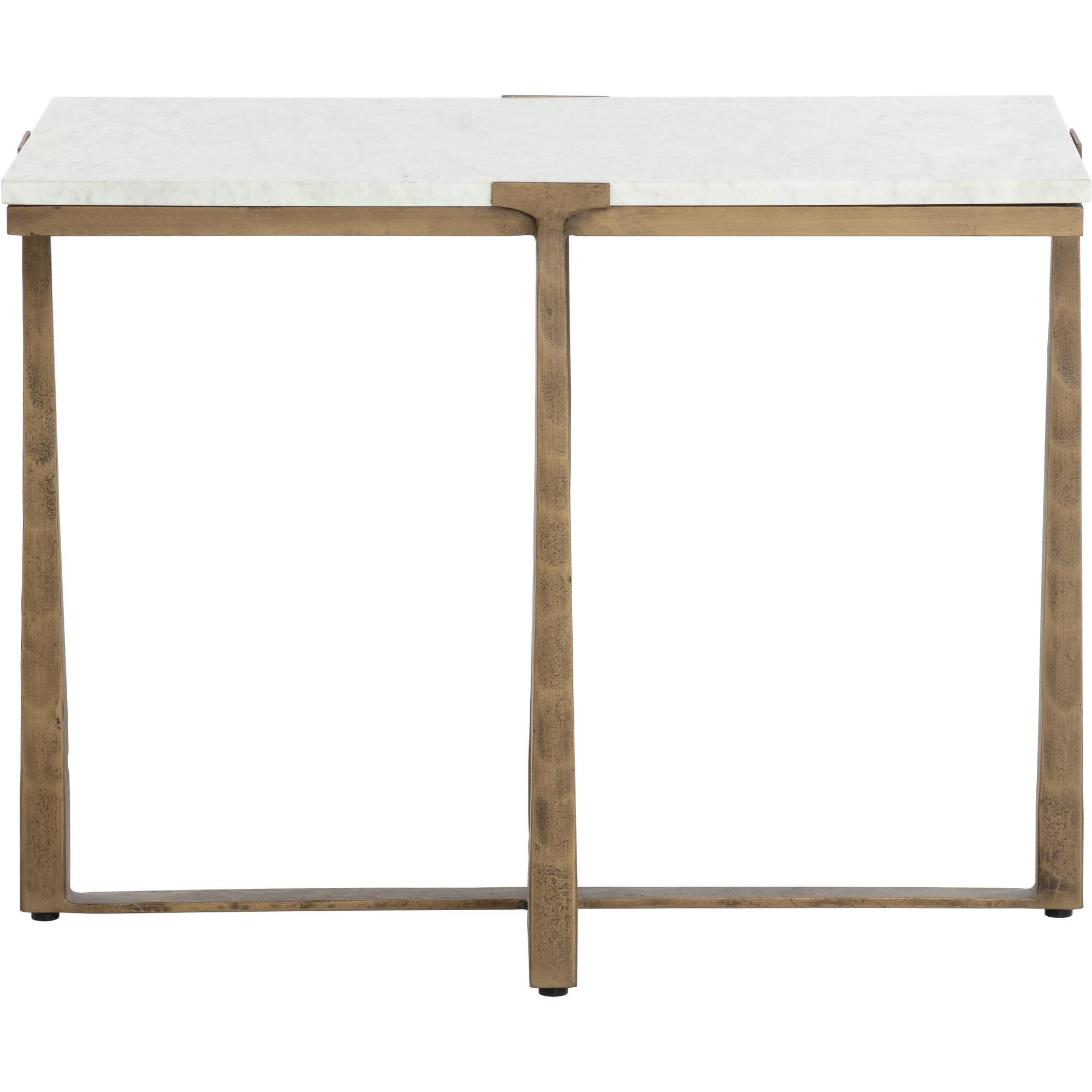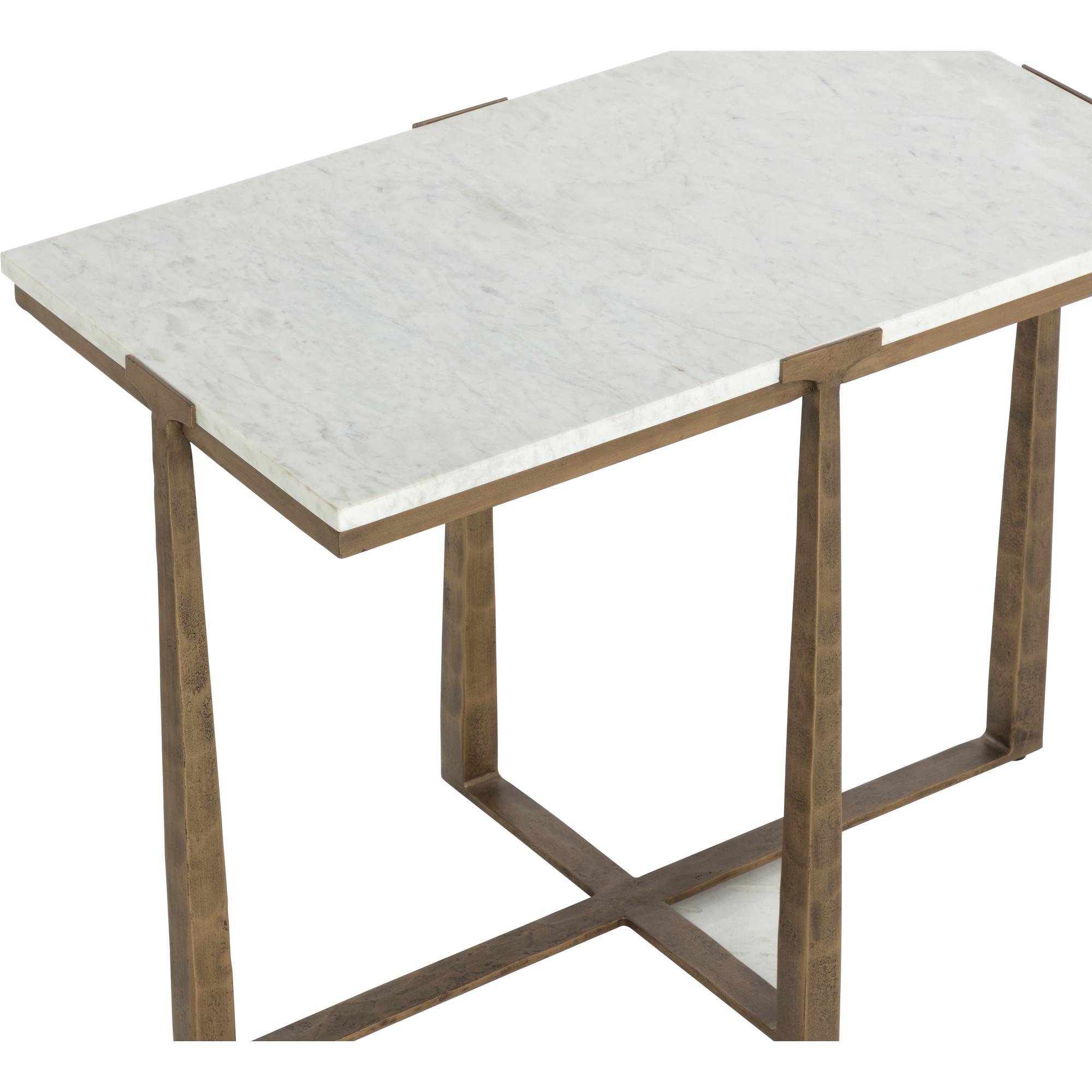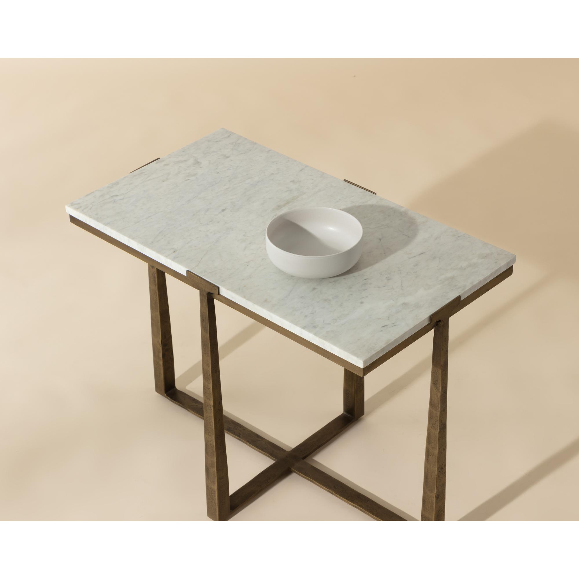 Inspired by mid-century design, the Cowell Side Table features a chic, minimal aesthetic that will elevate any room. The powder-coated antique brass finished legs give off a rustic sensibility that contrasts with the cool white marble top. As marble is a natural material, unique veining, pitting, fissures, micro-cracks and colour variations are all characteristics that add to the uniqueness and beauty of each piece. Made in India. With refined craftsmanship, this design was brought to life by skilled local artisans. Due to the nature of handcraftsmanship, unique imperfections such as fissures, markings and variations in colour and shape are welcomed and appreciated characteristics for a truly one-of-a-kind piece.