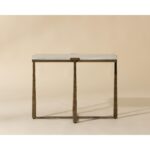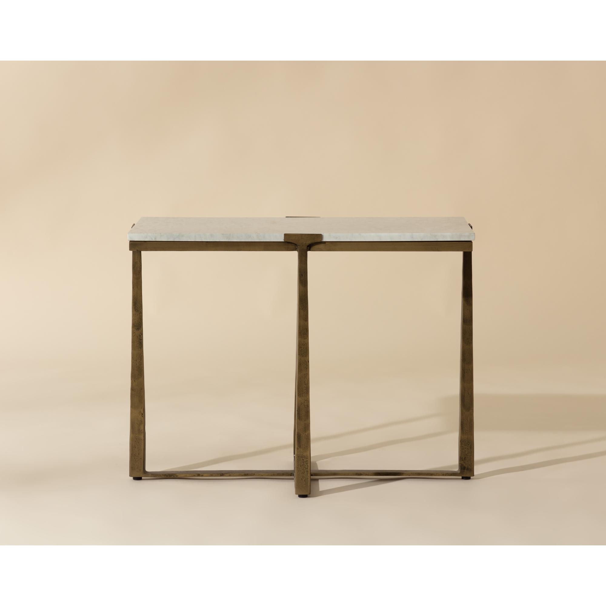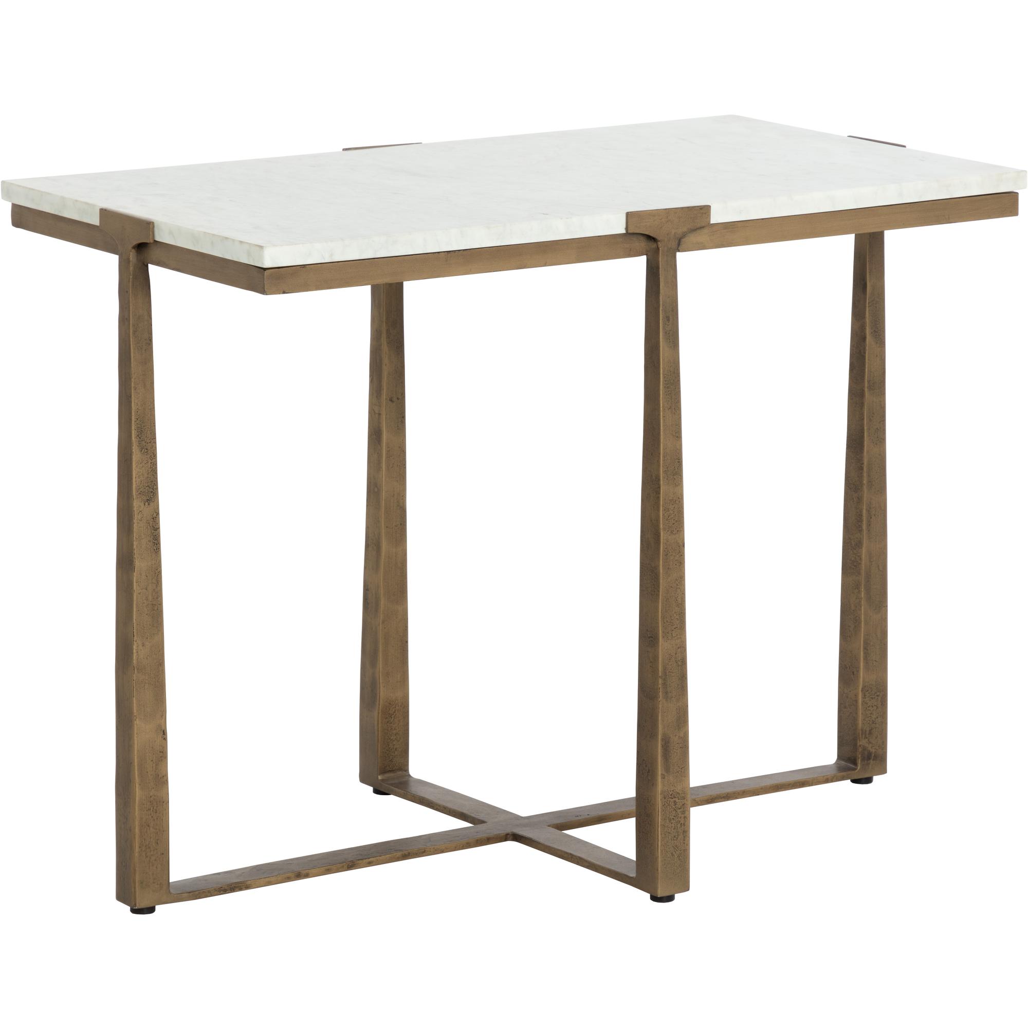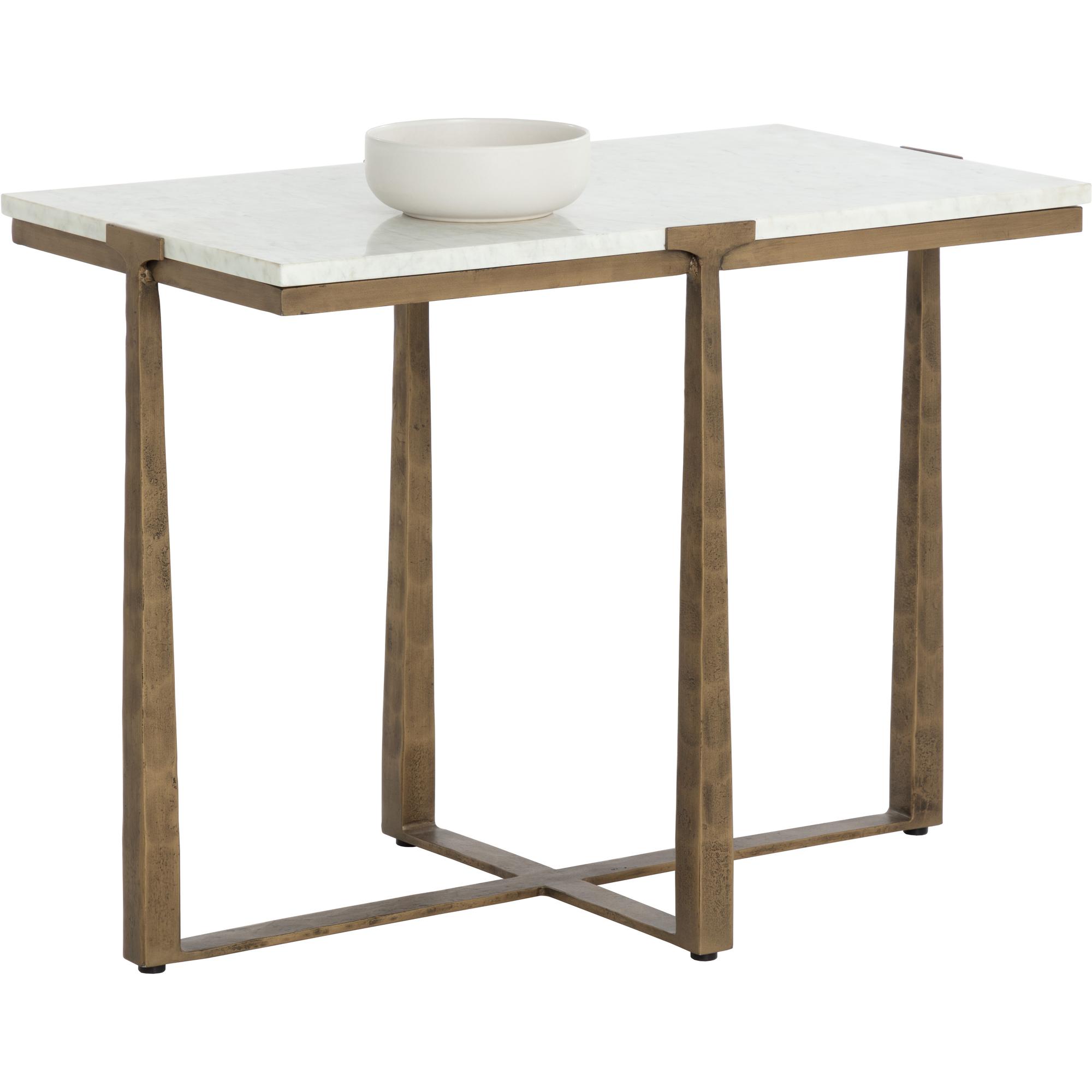 Inspired by mid-century design, the Cowell Side Table features a chic, minimal aesthetic that will elevate any room. The powder-coated antique brass finished legs give off a rustic sensibility that contrasts with the cool white marble top. As marble is a natural material, unique veining, pitting, fissures, micro-cracks and colour variations are all characteristics that add to the uniqueness and beauty of each piece. Made in India. With refined craftsmanship, this design was brought to life by skilled local artisans. Due to the nature of handcraftsmanship, unique imperfections such as fissures, markings and variations in colour and shape are welcomed and appreciated characteristics for a truly one-of-a-kind piece.