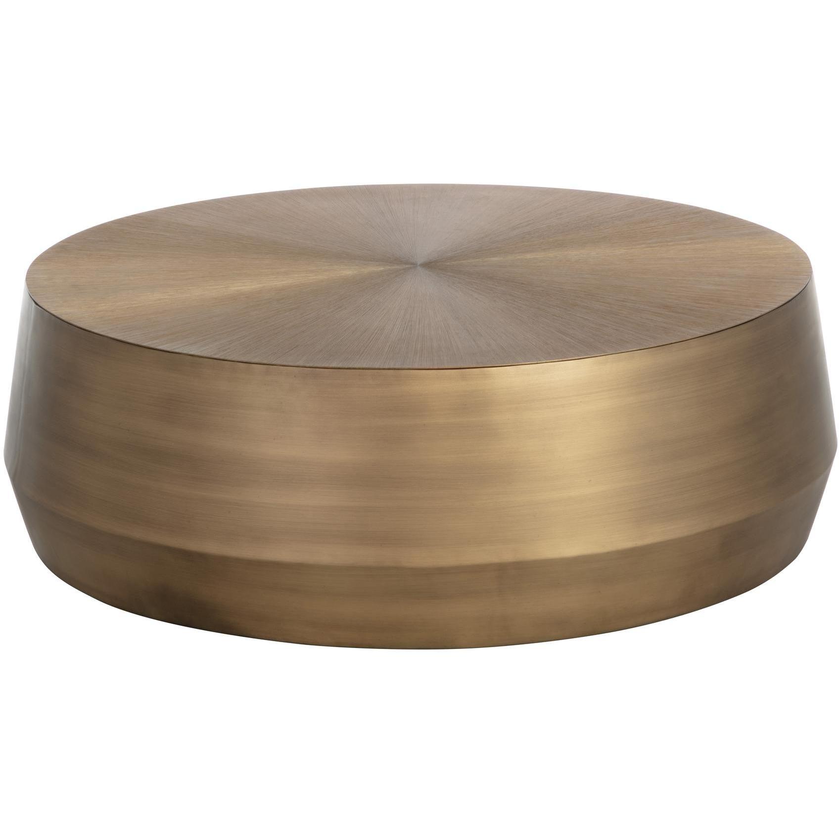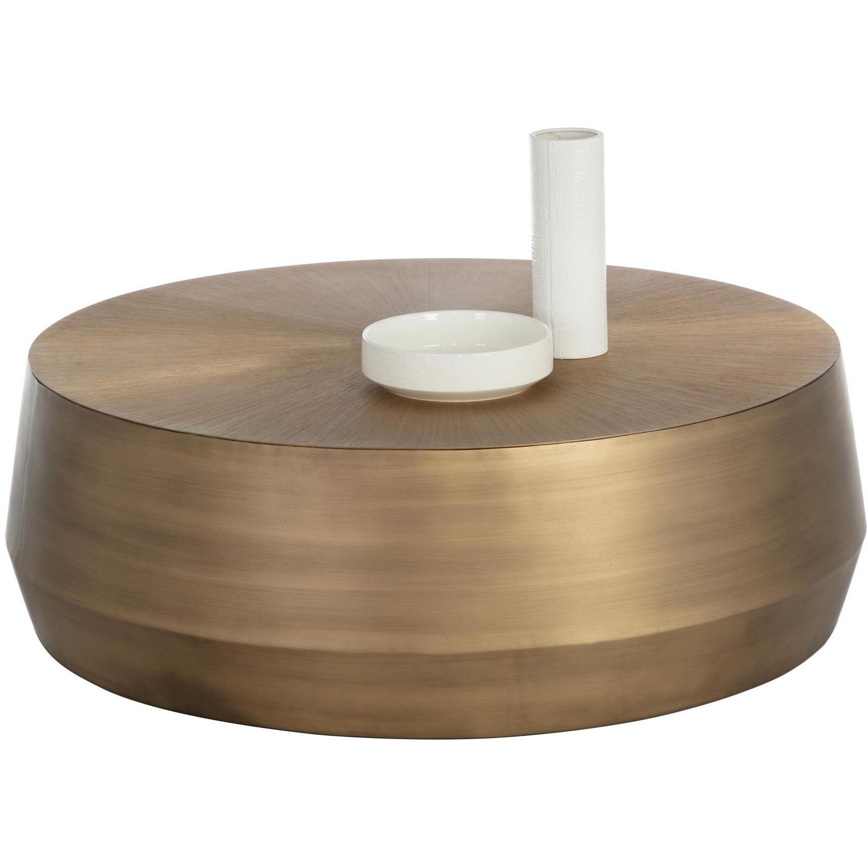 A large, captivating coffee table with an alluring antique gold finish. Features a hand-etched and hand-hammered top with a drum style base. This piece will add a contemporary flair to living, lounge and office spaces. Also available in a small version, along with a coordinating side table. Made in India. With refined craftsmanship, this design was brought to life by skilled local artisans. Due to the nature of handcraftsmanship, unique imperfections such as fissures, markings and variations in colour and shape are welcomed and appreciated characteristics for a truly one-of-a-kind piece.