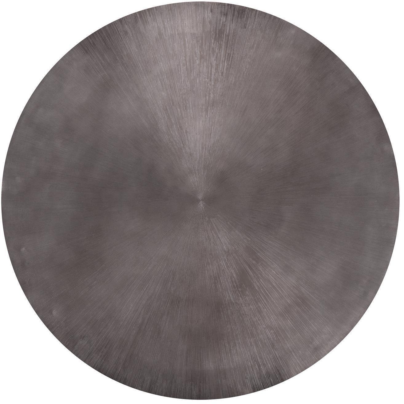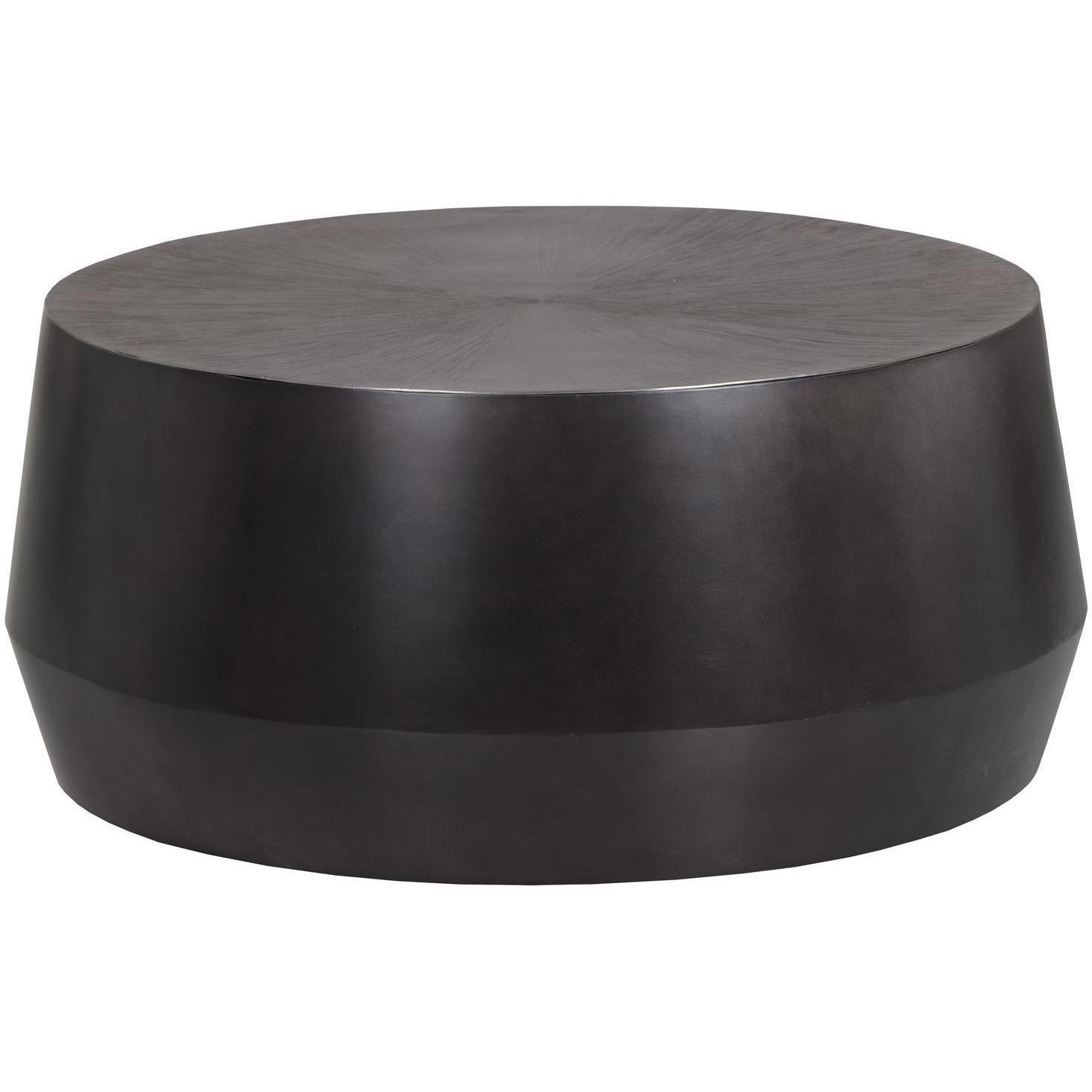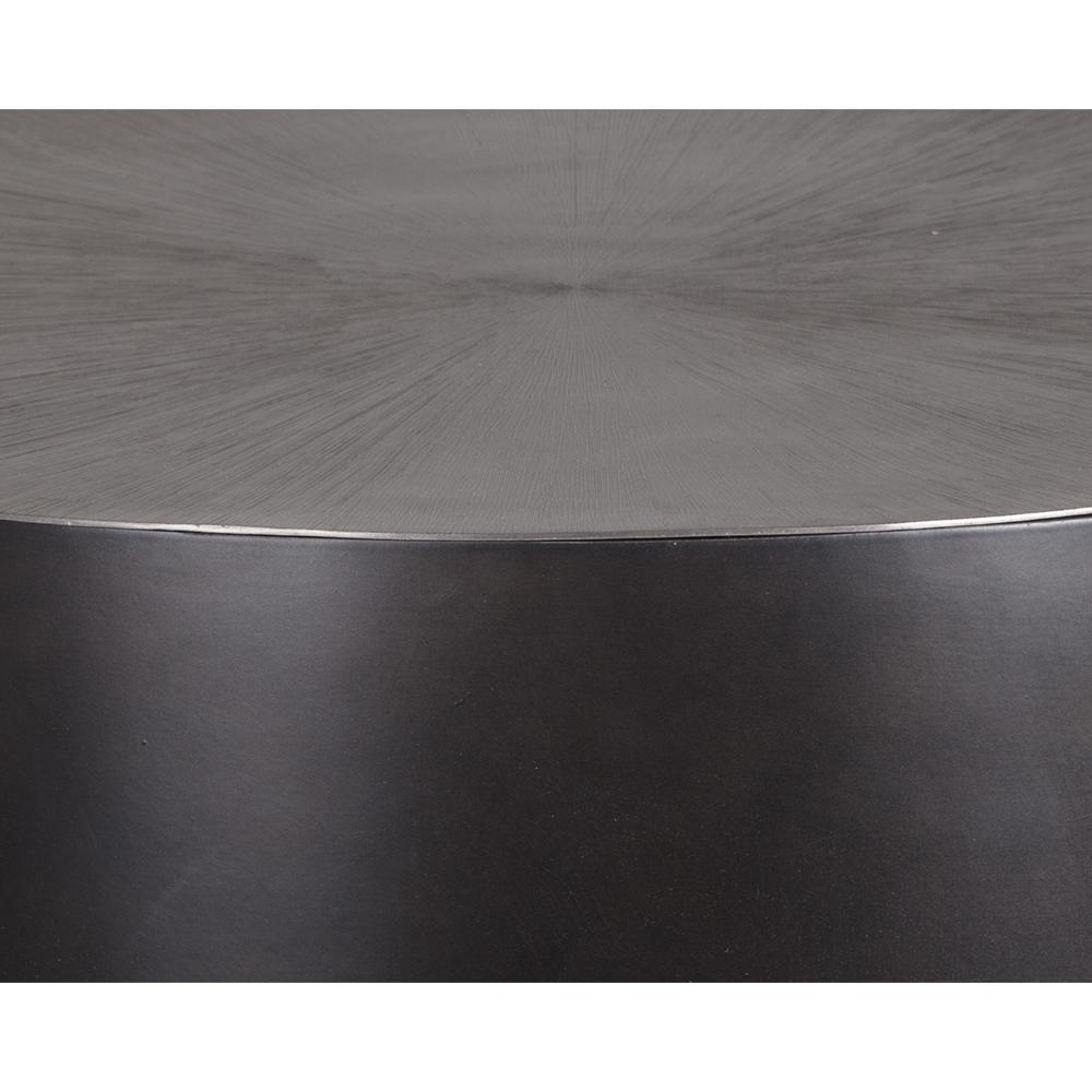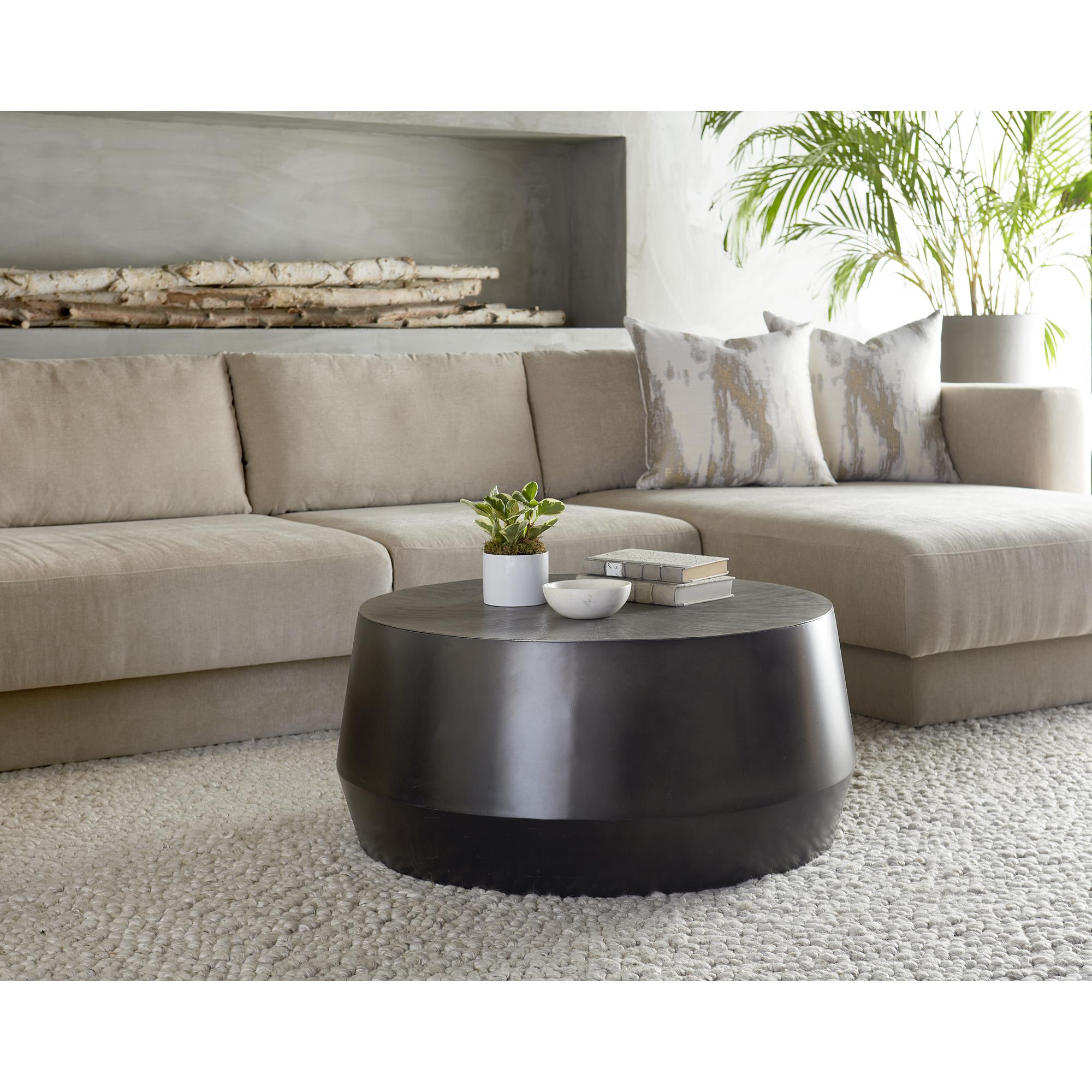 A captivating coffee table from our Ferrous collection with an alluring bronzed gunmetal finish. Features a hand-etched and hand-hammered top with a drum style base. This piece will add a contemporary flair to living, lounge and office spaces. Made in India. With refined craftsmanship, this design was brought to life by skilled local artisans. Due to the nature of handcraftsmanship, unique imperfections such as fissures, markings and variations in colour and shape are welcomed and appreciated characteristics for a truly one-of-a-kind piece.