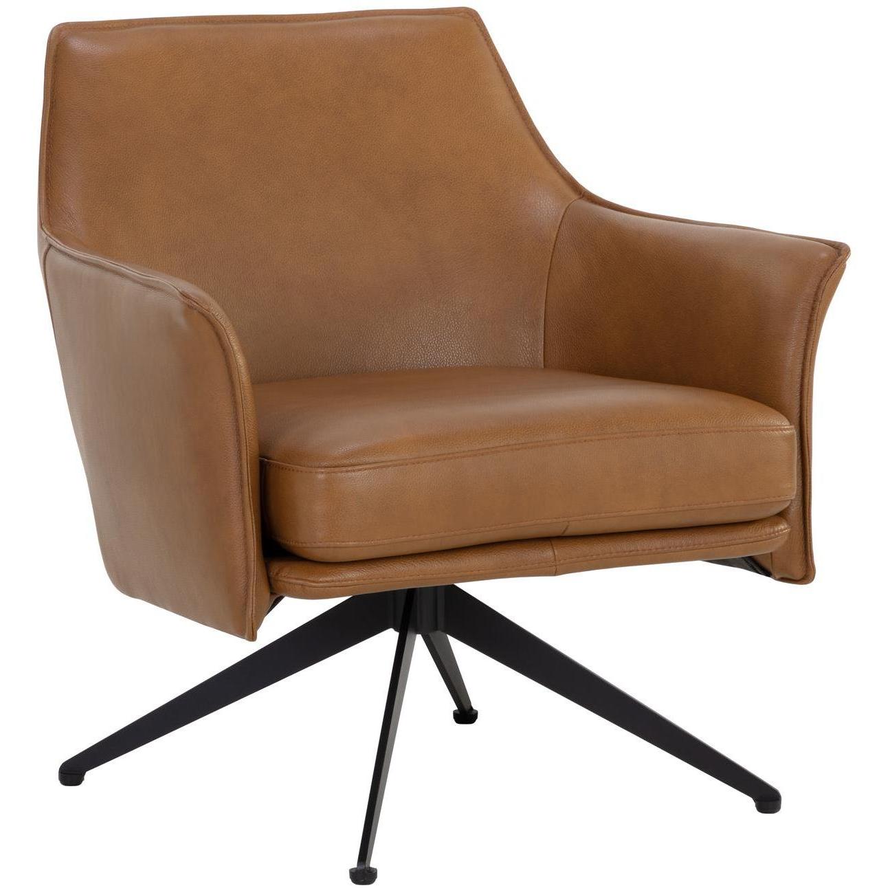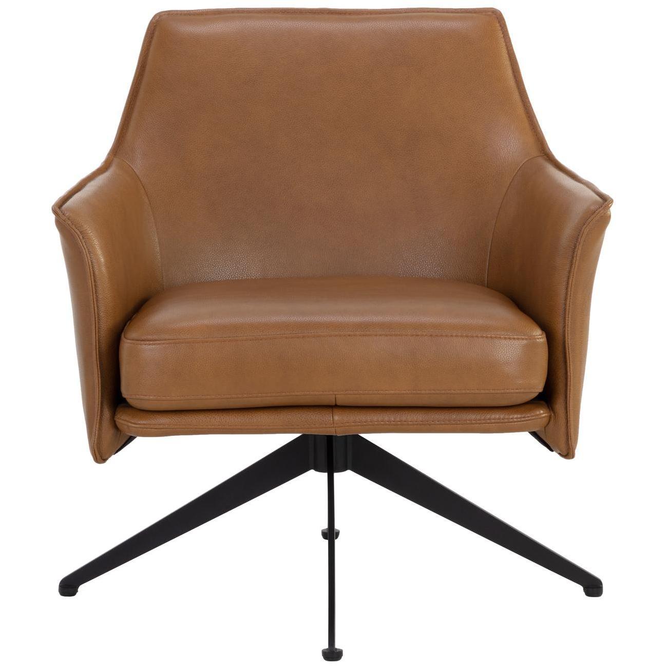 Embrace the comforting contours of the Crosby Swivel Lounge Chair. Perfect for any open living space, this lounge chair features sloped arms and a minimal silhouette upholstered in luxuriously smooth missouri cognac leather. Black powder-coated steel legs lend a stylish flair to the sleek design. Handle with Care: This design has been crafted with 100% leather. Leather is a natural material; as such, colour variations, markings, wrinkles, grooves and light scratches are acceptable and appreciated characteristics. No two pieces are alike. Visit our Product Care page for more information on how to ensure the lasting beauty of this piece.