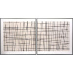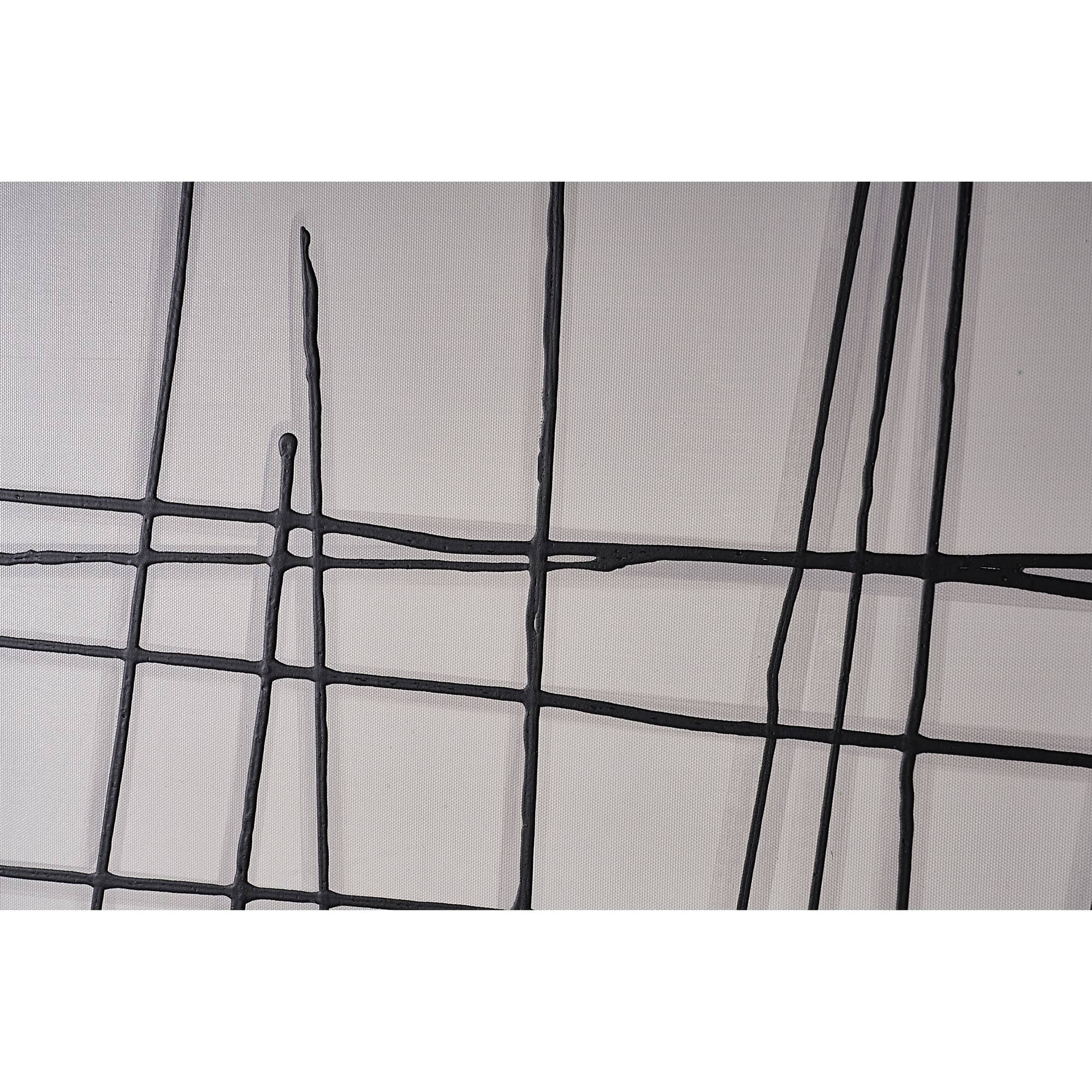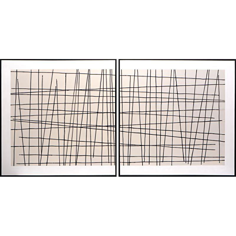This dramatic square diptych features black crosshatched lines atop a neutral background. Features a natural black floater frame. Each artwork is hand-painted and will feature slight variations that make every piece unique.