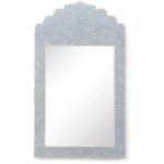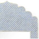 Crown mirror features an intricate pattern of blue and cream bone hand layed by skilled artisans on wood with clear, plain mirror. The sophisticated artistry and natural characteristics of the bone make each mirror unique.