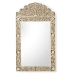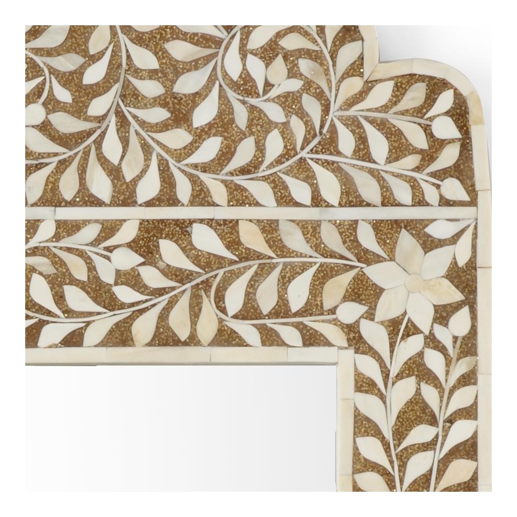 Enhance your artistic style with our Crown mirror. Featuring bone inlay hand placed in a floral and vine design on a backdrop of brown glitter, this 48″ rectangular wall mirror will be an eye-catcher. Whether welcoming guests in your entryway or adding dimension in your living area, this exquisite one-of-a-kind mirror will complement your design. Please note that the background of the mirror is brown glitter.