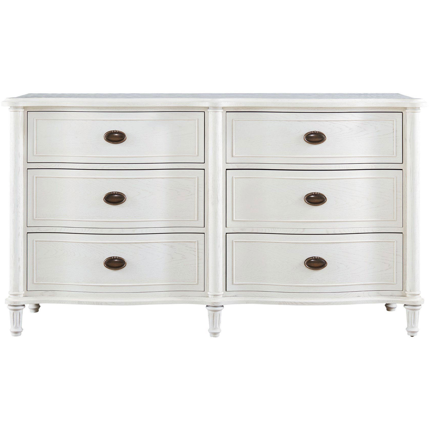 The Curated Amity Drawer Dresser by Universal Furniture is a functional and stylish addition to your bedroom. With six spacious drawers, this dresser provides ample storage for your clothes and accessories, while the cedar-lined bottom drawers keep your clothes fresh and protected. The self-closing guides ensure smooth and effortless operation, and the cotton finish adds a touch of elegance to the design.